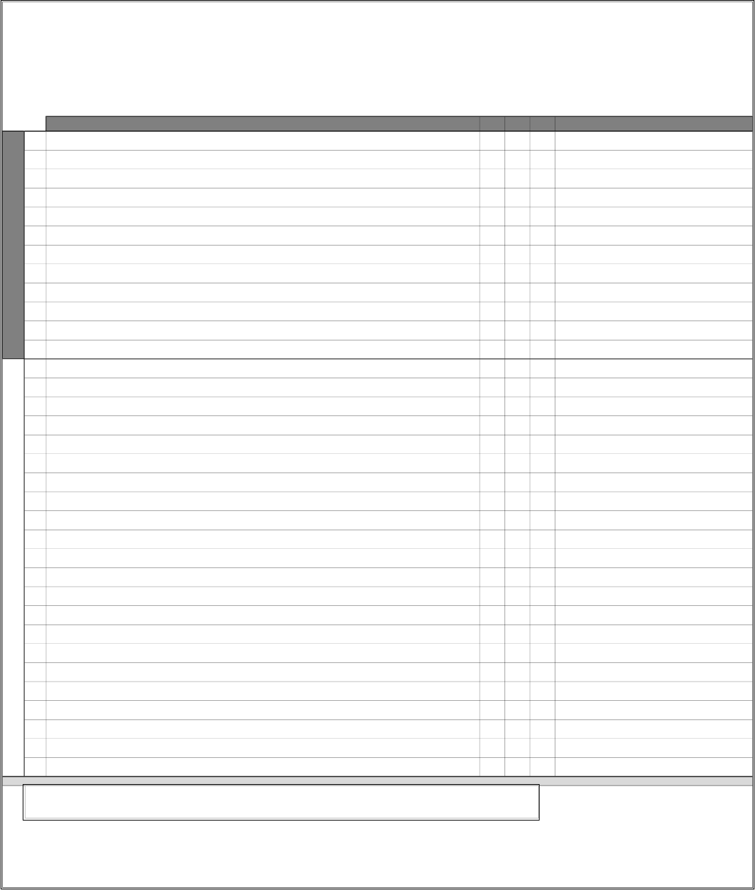 Requisitos de Conformidades OK NOK NA OBS 1 Todo sistema elétrico funciona sem improviso 2 Possui sirene de ré em condições de uso 3 Freios em boas condições de uso 4 Local entorno do equipamento está sinalizado 5 Operador qualificado (Habilitado / Capacitado / Treinado) 6 Alavancas de acionamento em condições normais para uso 7 Espelhos retrovisores (lateriais e central) 8 Freio de emergência em condições 9 Sistema hidráulico apresenta vazamentos 10 Mangueira do Cilindro da Direção, apresenta vazamento, rachaduras, não pode ter emendas 11 Mangueira da Lança, apresenta vazamento, rachaduras, não pode ter emendas 12 Sistema de proteção coletiva adequado (travas, giroflex, sinalização luminosa para raio de ação) 13 Paralama traseiro e dianteiro em boas condições 14 As portas possuem fechadura com trava, a mesma não poderá permanecer aberta ou entreaberta (folga) 15 Pneus não podem estar gastos, e devem apresentar Garras com altura superior a 5mm 16 lança e conchas travadas, as travas possuem contra-pino 17 Limpador de Para-Brisa funcionando 18 Operador utiliza EPI's compatível com a atividade 19 Faróis Dianteiros 20 Faróis Traseiros 21 Cinto de Segurança 22 Sistema de Partida 23 Manômetro de pressão do sistema hidráulico 24 Manômetro de Temperatura 25 Manômetro óleo do Motor 26 Amperímetro 27 Buzina funcioana normalmente 28 Vazamento de óleo 29 Cilindros de Elevação estão em boas condições 30 Cilindros de Inclinação estão em boas condições 31 Apresenta Deformação na Estrutura 32 Apresenta Deformação na Lataria 33 Possui extintor de incêndio e está no suporte adequado 34 Extintor de incêndio e está na validade (TIPO: _______ CAP.: _______ KG VAL. ATÉ: ______________) ______________________________________________________________ ASSINATURA DO OPERADOR - RESPONSÁVEL PELA INSPEÇÃO Rev 01 - 03/2020 CHECK-LIST - PÁ CARREGADEIRA ANO DE FABRICAÇÃO: ____________________ DATA: ______/______/______ IN T E R D IÇ Ã O EMPRESA/LOCAL: ______________________________________________________________________________________________ GERÊNCIA E ÁREA: _______________________________________________ MARCA/MODELO: _____________________________________________________________________________________ ID. EQUIPAMENTO: ______________________________________________ KM/HORAS RODADA: ___________________ H LEGENDA: OK - CONFORME NOK - NÃO CONFORME NA - NÃO APLICÁVEL ___________________________________________________ OPERADOR: ___________________________________________________________________________ ID. OPERADOR: _________________________________________________ ___________________________________________________ ASSINATURA DO SUPERVISOR/ENCARREGADO O não cumprimento em um dos itens acima, implicará em medidas previstas em contrato. Itens de Interdição deverão ser apresentados plano de ação, para SST, Suprimentos e Gerência responsável pelo contrato. Qualquer não conformidade identificada deve ser imediamente informada ao responsável da área para que as medidas cabíveis sejam aplicadas antes do início das atividades. Em caso de problemas durante a utilização do equipamento e/ou falhas o equipamento devera ser imediatamente parado e a equipe de manutenção deve ser acionada para avaliação.