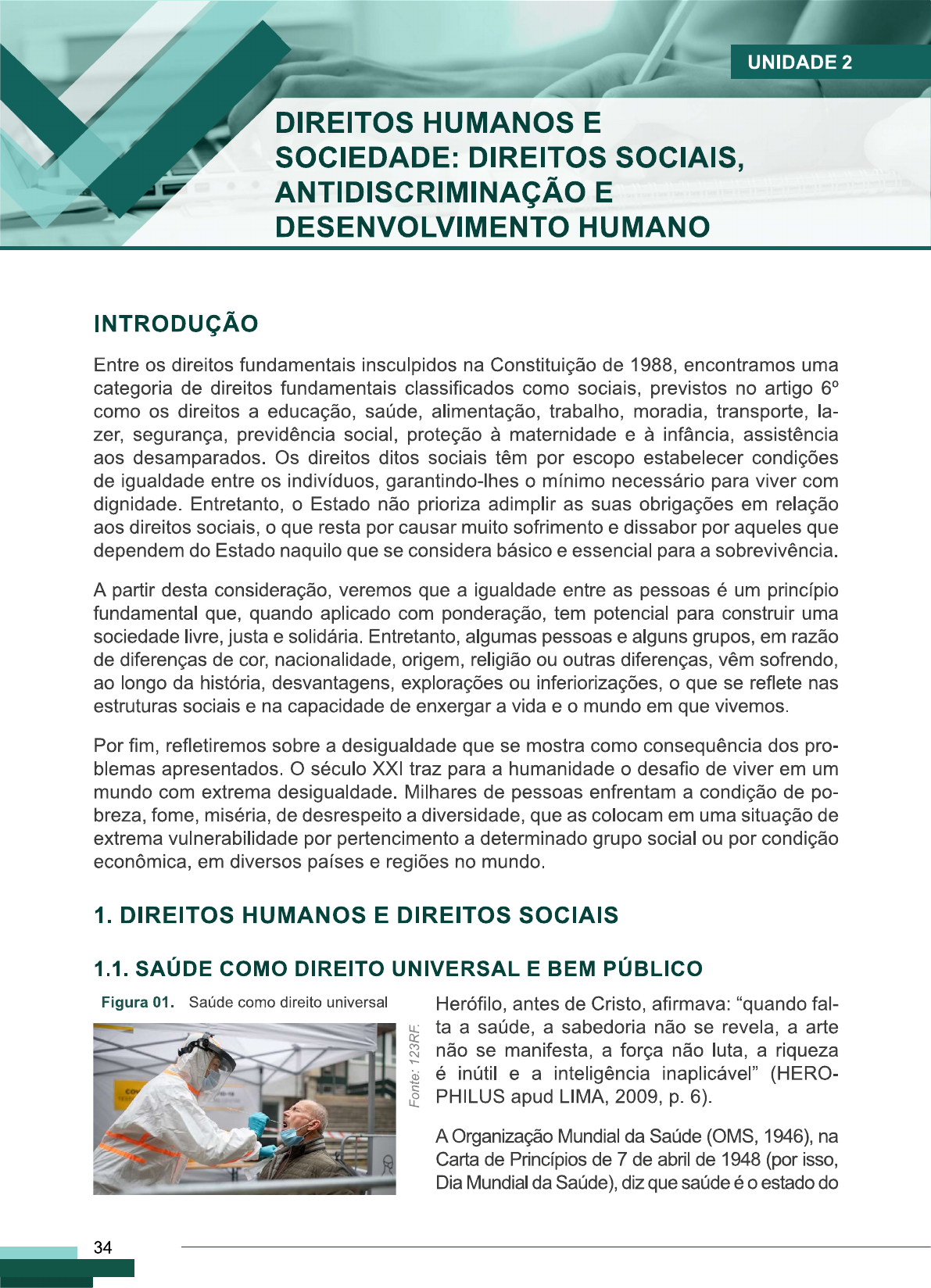 UNIDADE 2 DIREITOS HUMANOS E SOCIEDADE: DIREITOS SOCIAIS, ANTIDISCRIMINAÇÃO E DESENVOLVIMENTO HUMANO INTRODUÇÃO Entre os direitos fundamentais insculpidos na Constituição de 1988, encontramos uma categoria de direitos fundamentais classificados como sociais, previstos no artigo 6° como os direitos a educação, saúde, alimentação, trabalho, moradia, transporte, la- zer, segurança, previdência social, proteção à maternidade e à infância, assistência aos desamparados. Os direitos ditos sociais têm por escopo estabelecer condições de igualdade entre os indivíduos, garantindo-lhes mínimo necessário para viver com dignidade. Entretanto, Estado não prioriza adimplir as suas obrigações em relação aos direitos sociais, que resta por causar muito sofrimento e dissabor por aqueles que dependem do Estado naquilo que se considera básico e essencial para a sobrevivência. A partir desta consideração, veremos que a igualdade entre as pessoas é um princípio fundamental que, quando aplicado com ponderação, tem potencial para construir uma sociedade livre, justa e solidária. Entretanto, algumas pessoas e alguns grupos, em razão de diferenças de cor, nacionalidade, origem, religião ou outras diferenças, vêm sofrendo, ao longo da história, desvantagens, explorações ou inferiorizações, que se reflete nas estruturas sociais e na capacidade de enxergar a vida e mundo em que vivemos. Por fim, refletiremos sobre a desigualdade que se mostra como consequência dos pro- blemas apresentados. século XXI traz para a humanidade desafio de viver em um mundo com extrema desigualdade. Milhares de pessoas enfrentam a condição de breza, fome, miséria, de desrespeito a diversidade, que as colocam em uma situação de extrema vulnerabilidade por pertencimento a determinado grupo social ou por condição econômica, em diversos países e regiões no mundo. 1. DIREITOS HUMANOS E DIREITOS SOCIAIS 1.1. SAÚDE COMO DIREITO UNIVERSAL E BEM PÚBLICO Figura 01. Saúde como direito universal Herófilo, antes de Cristo, afirmava: "quando fal- ta a saúde, a sabedoria não se revela, a arte Fonte: 123RF. não se manifesta, a força não luta, a riqueza é inútil e a inteligência inaplicável" (HERO- PHILUS apud LIMA, 2009, p. 6). A Organização Mundial da Saúde (OMS, 1946), na Carta de Princípios de 7 de abril de 1948 (por isso, Dia Mundial da Saúde), diz que saúde é estado do 34mais completo bem-estar físico, mental e social, e não apenas a ausência de enfermidade. Sob prisma jurídico, a saúde como direito social (artigo 6°) encontra-se prevista na Constituição Federal desde a sua origem, em 1988. artigo 196 da Carta Constitucional assegura: 2 A saúde é direito de todos e dever do Estado, garantido mediante políticas sociais e econômicas que visem à redução do risco de doença e de outros agravos e ao acesso universal e igualitário às ações e serviços para sua promoção, proteção e recuperação. (BRASIL, 1988, [n. p.], grifo nosso). princípio da universalidade da saúde prega que todas as doenças serão cobertas e am- paradas pelo Sistema Único de Saúde (SUS) e todas as pessoas (brasileiros ou estrangei- ros, residentes ou não no Brasil) serão atendidas sem qualquer cobrança pelo poder públi- CO. Assim, além de universal, a saúde é um sistema gratuito de política pública no Brasil. Nessa linha, Supremo Tribunal Federal, órgão de cúpula do Judiciário, na condição de guardião da Constituição, tem assumido protagonismo no cenário público, consideran- Universidade São Francisco do-se a grande quantidade de decisões judiciais, cuja finalidade é implementar direitos pelo prisma da qualidade de mínimo existencial, ou seja, determinado direito é mínimo para a pessoa humana viver com dignidade, como é caso do direito à saúde. Nesse sentido, em 12/09/2000, Supremo Tribunal Federal, ao analisar fornecimento gratuito de medicamentos a pessoa portadora do vírus HIV sem condições de arcar com os custos do tratamento, afirmou que Estado é obrigado a garantir um mínimo relacionado ao direito à saúde, decorrente do direito à vida: [...] [ao] Poder Público [...] incumbe formular e implementar políticas so- ciais e econômicas idôneas que visem a garantir, aos cidadãos, inclusive àqueles portadores do vírus HIV, acesso universal e igualitário à assistên- cia farmacêutica e médico-hospitalar. O direito à saúde, além de qualificar- -se como direito fundamental que assiste a todas as pessoas representa consequência constitucional indissociável do direito à vida. Poder Público, qualquer que seja a esfera institucional de sua atuação no plano da organi- zação federativa brasileira, não pode mostrar-se indiferente ao problema da saúde da população, sob pena de incidir, ainda que por censurável omissão, em grave comportamento inconstitucional. [...](BRASIL, 2000, p. 1.409) Em relação à saúde, percebe-se claramente o conceito de bem comum, no sentido de que objetivo da sociedade não é um bem individual ou de um único indivíduo, mas um bem que se comunica entre todas as pessoas do grupo indistintamente. Não descarta a existência da individualidade, mas também se projeta para coletivo. Tome-se como exemplo alcoolismo e as doenças mentais, com todas as consequên- cias que carregam na sociedade. Elas são consideradas individualmente, mas tem uma dimensão mais coletiva do que individual no aspecto do seu cuidado e do seu tratamen- to e prevenção. Nesse sentido, vale lembrar Sturza e Martini (2017, p. 406): Nesse sentido, é perceptível que direito à saúde não apenas possui um cariz individual, mas é aquele direito que diz respeito a um quadro social, que importa a coletividade, que assume uma característica transcendente àqueles que pertencem a determinada comunidade. Desse ponto de vista, falar de saúde exige olhar para a sociedade: a casa comum onde vivemos, onde os seres humanos constroem