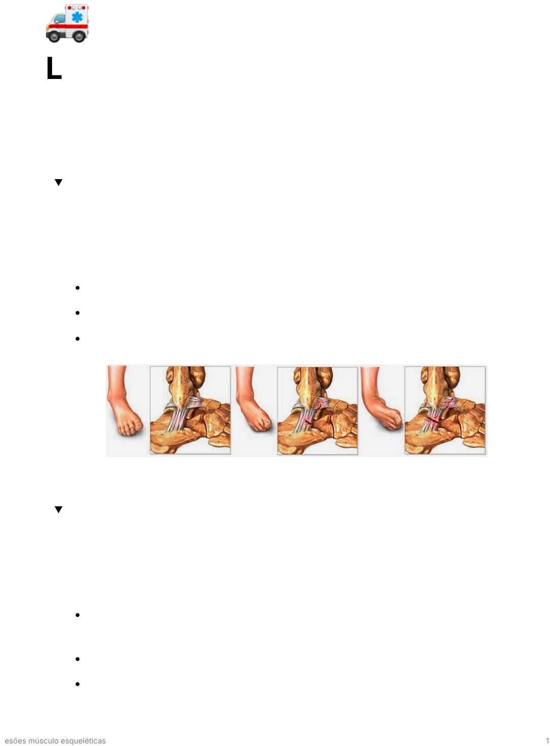 🚑 Lesões músculo esqueléticas Lesões músculo esquelético, são lesões extremamente dolorosas mas não apresentam muita gravidade (mesmo assim precisa de atendimento médico), elas podem ser: Entorses São lesões dos ligamentos das articulações, onde estes esticam além de sua amplitude normal, rompendo-se. Ocorre uma distensão dos ligamentos mas não há deslocamento completo do osso da articulação. Ela pode ser classificada como: Grau 1 dor, com dano mínimo ao ligamento. Grau 2 gera uma leve frouxidão da articulação. Grau 3 articulação instável, ruptura total do ligamento. Luxações É o deslocamento do osso da sua articulação (podendo ser total ou parcial). É uma lesão muito dolorosa e é difícil diferenciar da fratura fechada. Para identificar uma luxação deve-se observar as seguintes características: Dor intensa no local afetado (muito maior que no entorse), que afeta todo o membro cuja articulação foi atingida; Edema; Impotência funcional; Lesões músculo esqueléticas 1 Deformidade visível na articulação; pode apresentar encurtamento ou alongamento do membro afetado. NÃO TENTE VOLTAR O MEMBRO PARA O LUGAR ANTES DO RAIO X Contusões São provocadas por golpes ou pancadas, em que não há presença de ferimentos abertos (sem rompimento da pele). Os vasos sanguíneos adjacentes ao local lesionado são rompidos. A mancha, inicialmente arroxeada, vai sendo absorvida lentamente até desaparecer por completo. Fraturas É uma lesão óssea de origem traumática, produzida por trauma direto ou indireto, de alta ou baixa energia. Ela pode ser fechada ou exposta. Desconfie de uma fratura quando: aparência ou função anormal do membro; dor no local; incapacidade de movimento; posição anormal do membro. As fraturas são classificadas em: Incompleta: fratura parcial do segmento ósseo; Lesões músculo esqueléticas 2 Completa: fratura total do segmento ósseo; Fechada: não há comunicação do foco da fratura com o meio externo. Aberta ou exposta: quando há lesão de pele e partes moles assim o foco da fratura fique em contato com o meio ambiente possibilitando a contaminação e infecção. Desvio: pode ser com desvio do alinhamento ósseo e sem desvio. Após identificar lesão realize o XABCDE X (lesões exsanguinante): Realize compressão direta nos ferimentos hemorrágicos, realize o torniquete (protocolo específico) quando a compressão não obtiver sucesso e estiverem em extremidades MMSS e MMII; A (abertura de vias aéreas e estabilização da CV Mantenha permeabilidade da VA, estabilize a coluna cervical e utilize os dispositivos de imobilização assim que possível, nos casos de história de trauma. B (ventilação e respiração): Administre O2 por máscara 10 a 15 litros por litro , se a saturação for menor que 94%. C (circulação com controle da hemorragia): Reavalie o controle de hemorragia (curativo ou torniquete); monitore sinais vitais e saturação; na ausência de pulso periférico (menor que 90 mmHg), solicite apoio SIV\SAV. D (verifique o nível de consciência): utilize a escala de Glasgow. Lesões músculo esqueléticas 3 E (exposição e controle de hipotermia): Exponha a vítima com sangramento, deformidades em MM e dor; aqueça com manta aluminizada; não realize imobilização sobre as roupas; lave o ferimento com excesso de sujidade com soro fisiológico antes de imobilizar; aplique curativo estéril em fraturas e luxações; imobilize o membro fraturado sobre tala; imobilize lesões articulares na posição que foi encontrada; posicione anatomicamente o membro fraturado (menos lesões articulares ou quando encontra resistência no momento de retornar o membro) 💡 Em caso de membro amputado realize curativo compressivo e enfaixamento no membro amputado. Coloque o membro amputado em saco plástico e esse saco em outro saco com gelo (na ausência de gelo coloque em soro fisiológico) Avalie a perfusão do membro lesionado antes e depois de imobilizar. Lesão ósseas: imobilizar uma articulação acima e uma articulação abaixo; Lesão articular: imobilizar um osso acima e um osso abaixo; Trauma torácicas É qualquer lesão física que ocorra no peito (costelas, coração e pulmão). É responsável por 25% de todas as lesões traumáticas. Lesões músculo esqueléticas 4 Pode ser causado por traumas contusos, como acidentes de carro, quedas e impactos em geral; lesões penetrantes (por arma de fogo ou arma branca) ou pela união de vários fatores (acidentes automobilísticos com contusão e lesão penetrante associadas). É classificado: Quanto ao tipo de lesão Aberto: são os ferimentos mais comuns FAB (ferimento por arma branca) e FAF (ferimento por arma de fogo) Fechado: são as contusões Quanto ao agente causal FAF (ferimento por arma de fogo) FAB (ferimento por arma branca) Acidentes automobilísticos Outros Quanto á manifestações clínicas Pneumotórax (hipertensivo ou não) Hemotórax Tamponamento cardíaco Contusão pulmonar Lesão de grandes vasos (aorta, artéria pulmonar, veias cavas) Pneumotórax PTX VAI CAIR NA PROVA É a presença de ar na cavidade pleural, podendo levar á compressão do parênquima pleural e insuficiência respiratória. Ele pode ser classificada em espontâneo e adquirido: Espontâneo primário: paciente sem doença de base; (bolha enfisematosa sub-pleural) Espontâneo secundário: complicação de doenças prévias; Adquirido iatrogênico: consequência de um procedimento mal sucedido; Adquirido traumático. Lesões músculo esqueléticas 5 Seus sinais e sintomas são: Hipóxia, hipercapnia, acidose e hipovolemia; Dispneia (relacionado ao grau de compressão do parênquima pulmonar) Abaulamento do hemitórax afetado (mais nítido em crianças) Hipertimpanismo à percussão; Ausência ou diminuição do murmúrio vesicular Em pneumotórax hipertensivo, aparecem sinais de choque com pressão venosa alta (estase jugular). Ele pode ser: Pneumotórax simples Sua etiologia é base