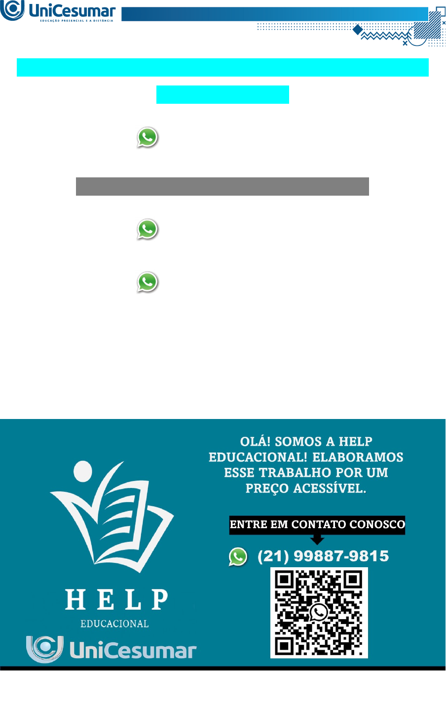 ATIVIDADE 1 – ENF – TRABALHO DE CONCLUSÃO DE CURSO - 53_2025 (21) 99887-9815 ASSESSORIA NOS SEUS TRABALHOS (21) 99887-9815 (21) 99887-9815 Caro(a) aluno(a), seja bem-vindo(a) à Atividade de Estudo 1 da disciplina de Trabalho de Conclusão de Curso (TCC). O TCC é componente curricular obrigatório do curso de Enfermagem e um dos requisitos para a obtenção do título de Bacharel. Consiste em um trabalho acadêmico de sistematização do conhecimento construído ao longo da formação, permitindo ao futuro profissional demonstrar habilidades de análise crítica, produção científica, domínio técnico e ética. Nesta Atividade 1, o acadêmico deverá elaborar a primeira parte do manuscrito científico, denominada estruturação, com base no tema escolhido (dentro das áreas e linhas de pesquisa disponibilizadas pela instituição) e conforme as orientações repassadas nas aulas 1 a 4. Seguindo exatamente as orientações e formatação do TEMPLATE DO TRABALHO DE CONCLUSÃO DE CURSO – MODELO EXPLICATIVO e MANUAL DE ORIENTAÇÕES PARA PESQUISA E PRODUÇÃO DE TCC. A entrega deverá contemplar todos os itens abaixo: Título Autoria do trabalho Objetivo geral da pesquisa Palavras-chave (3 descritores retirados dos Descritores em Ciências da Saúde) Introdução ORIENTAÇÕES INICIAIS: Leia todos os materiais disponibilizados no ambiente da disciplina. Utilize obrigatoriamente TEMPLATE AE1 oficial da Atividade 1, disponível no Material da Disciplina. O uso do template é obrigatório e ele será a folha de resposta para a entrega da atividade. Respeite as orientações de formatação descritas no TEMPLATE DO TRABALHO DE CONCLUSÃO DE CURSO – MODELO EXPLICATIVO e MANUAL DE ORIENTAÇÕES PARA PESQUISA E PRODUÇÃO DE TCC. O título pode ser provisório nesta etapa e será revisado na segunda atividade. A qualidade da escrita será considerada na avaliação: evite textos confusos, copiados ou com erros conceituais. A atividade é individual ou em dupla. Casos de cópias entre colegas ou plágio resultarão em nota zero. ORIENTAÇÕES FINAIS: O arquivo deve ser enviado exclusivamente pelo ambiente Studeo, no campo “Atividade de Estudo 1”, no formato PDF. Qualquer outro meio de envio não será considerado. A IES não se responsabiliza por arquivos corrompidos, em branco, errados ou fora do prazo de envio. Atente-se para data limite de envio. COMO ENVIAR O SEU ARQUIVO: Ao final do enunciado desta Atividade de Estudo 1, no Studeo, tem uma caixa de envio de arquivo. Basta clicar e selecionar sua atividade, ou arrastar o arquivo até ela Antes de clicar em “Finalizar”, certifique-se de que o arquivo anexado é o correto, pois uma vez finalizado você não poderá mais modificar o arquivo. Sugerimos que você clique no link gerado da sua atividade e faça o download para conferir OLÁ! SOMOS A HELP EDUCACIONAL! ELABORAMOS ESSE TRABALHO POR UM PREÇO ACESSÍVEL. ENTRE EM CONTATO CONOSCO (21) 99887-9815 image1.png image2.png image3.png