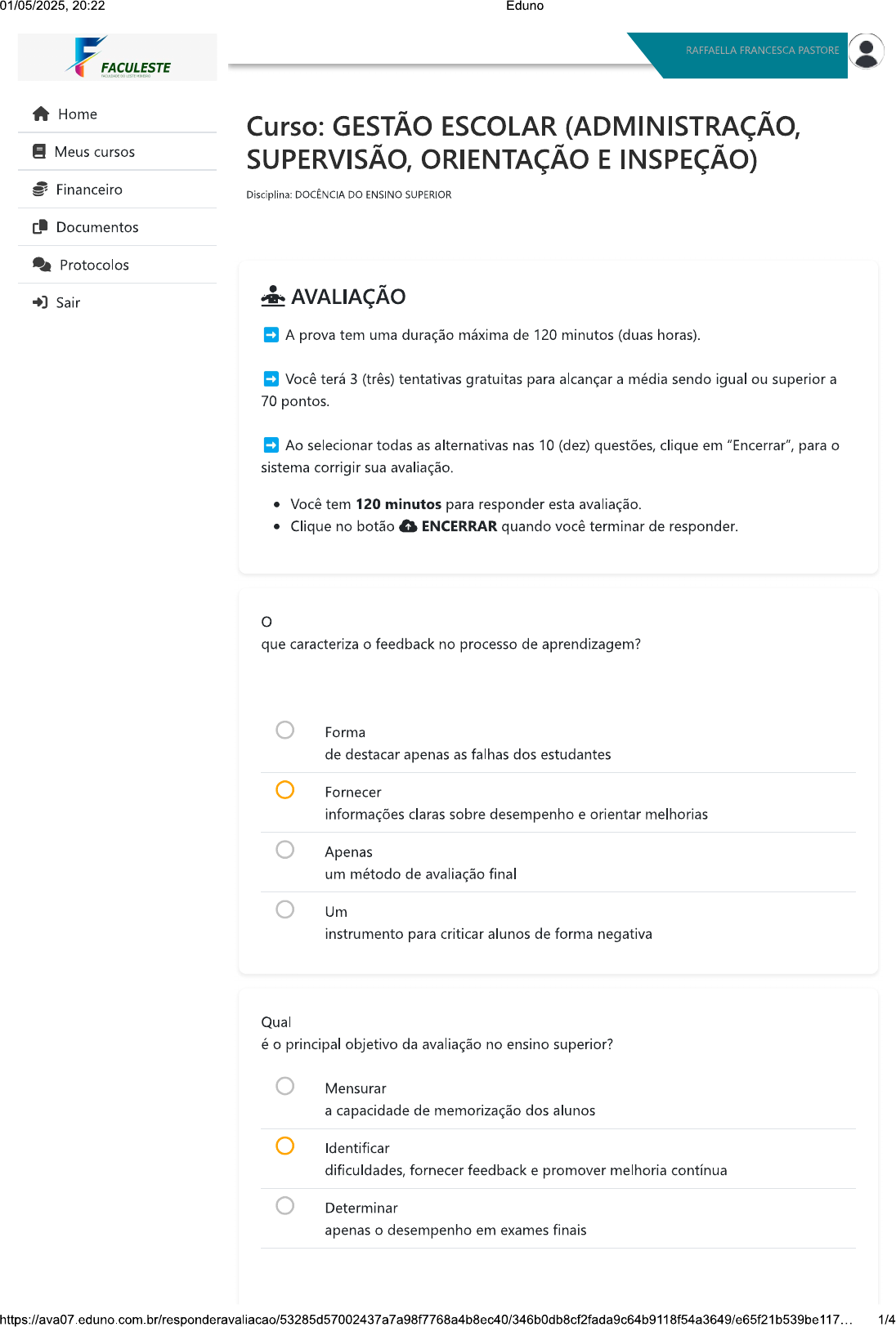 01/05/2025, 20:22 Eduno RAFFAELLA FRANCESCA PASTORE FACULESTE Home Curso: GESTÃO ESCOLAR (ADMINISTRAÇÃO, Meus cursos SUPERVISÃO, ORIENTAÇÃO E INSPEÇÃO) Financeiro Disciplina: DOCÊNCIA DO ENSINO SUPERIOR Documentos Protocolos Sair AVALIAÇÃO A prova tem uma duração máxima de 120 minutos (duas horas). Você terá 3 (três) tentativas gratuitas para alcançar a média sendo igual ou superior a 70 pontos. Ao selecionar todas as alternativas nas 10 (dez) questões, clique em "Encerrar", para o sistema corrigir sua avaliação. Você tem 120 minutos para responder esta avaliação. Clique no botão ENCERRAR quando você terminar de responder. que caracteriza o feedback no processo de aprendizagem? Forma de destacar apenas as falhas dos estudantes Fornecer informações claras sobre desempenho e orientar melhorias Apenas um método de avaliação final Um instrumento para criticar alunos de forma negativa Qual é o principal objetivo da avaliação no ensino superior? Mensurar a capacidade de memorização dos alunos Identificar dificuldades, fornecer feedback e promover melhoria contínua Determinar apenas o desempenho em exames finais 1/401/05/2025, 20:22 Eduno RAFFAELLA FRANCESCA PASTORE FACULESTE Home Meus cursos Quais são os aspectos fundamentais que compõem a identidade docente no ensino Financeiro superior? Documentos Exclusivamente Protocolos domínio de conteúdo específico Formação acadêmica, experiência profissional, postura ética e interação com os alunos Aplicação irrestrita de tecnologias digitais Habilidades em gestão financeira e logística Qual é o objetivo principal do plano de ensino no contexto da docência universitária? Garantir o controle absoluto dos alunos pelo professor Estruturar objetivos, conteúdos, métodos e avaliações para nortear o processo de ensino-aprendizagem Cumprir exigências administrativas da instituição Detalhar exclusivamente os conteúdos teóricos da disciplina Qual é o papel central do professor universitário na educação superior? Focar exclusivamente na formação técnica dos alunos Ser mediador do conhecimento, construtor de aprendizagens e agente de transformação social Repassar informações sem questionar o conteúdo Transmitir apenas o conhecimento científico 2/401/05/2025, 20:22 Eduno RAFFAELLA FRANCESCA PASTORE FACULESTE métodos são considerados parte das metodologias ativas de Home Aulas expositivas sem interação Meus cursos Discussões Financeiro teóricas sem aplicação prática Documentos Aprendizagem Protocolos baseada em projetos e problemas, e ensino híbrido Exclusividade no uso de livros didáticos que caracteriza o perfil do professor universitário contemporâneo? Exclusividade no uso de aulas expositivas Foco apenas na pesquisa, sem interação com os alunos Domínio de conteúdos da área, comunicação eficaz, criatividade e flexibilidade Rejeição ao uso de tecnologias no ensino Qual é a importância da reflexão crítica para o professor universitário? Analisar e aprimorar continuamente sua prática pedagógica Cumprir tarefas sem questionar os métodos usados Evitar inovações no ensino Apenas adaptar-se às demandas administrativas Qual das opções abaixo é uma competência essencial para a docência no ensino superior? Gestão de recursos financeiros 3/401/05/2025, 20:22 Eduno RAFFAELLA FRANCESCA PASTORE FACULESTE Foco Home unicamente na pesquisa acadêmica Meus cursos Comunicação eficaz e avaliação crítica Financeiro Documentos Protocolos Qual é o papel das TICs (Tecnologias da Informação e Comunicação) na educação superior? Criar um ambiente de aprendizagem mais interativo e personalizado Ser utilizada apenas em cursos técnicos Substituir completamente o papel do professor Tornar as aulas mais burocráticas ENCERRAR Ações ENCERRAR VOLTAR 4/4