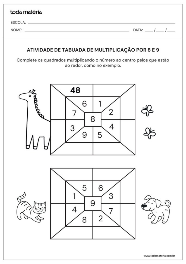 toda ESCOLA: NOME: DATA: / / ATIVIDADE DE TABUADA DE MULTIPLICAÇÃO POR 8E 9 Complete OS quadrados multiplicando número ao centro pelos que estão ao redor, como no exemplo. 48 6 1 7 2 8 3 4 9 5 5 6 1 3 9 4 7 8 2 www.todamateria.com.br