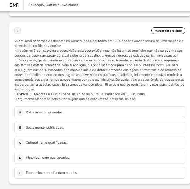 SM1 Educação, Cultura e Diversidade 7 Marcar para revisão Quem acompanhasse os debates na dos Deputados em 1884 poderia ouvir a leitura de uma moção de fazendeiros do Rio de Janeiro: Ninguem no Brasil sustenta a escravidão pela escravidão, mas não um brasileiro que não se oponha aos perigos da desorganização do atual sistema de trabalho. Livres os negros, as cidades seriam invadidas por turbas ignaras, gente refratária ao trabalho e ávida de ociosidade. A produção seria e a segurança das estaria ameaçada. Veio a Abolição, Apocalipse ficou para depois e 0 Brasil melhorou (ou será que duvida?). Passados dez anos do inicio do debate em torno das ações afirmativas e do recurso as cotas para facilitar acesso dos negros universidades brasileiras, felizmente conferir a consistência dos argumentos apresentados contra essa iniciativa. De saida, veio a advertência de que as cotas exacerbariam a questão racial. Essa ameaça vai completar 18 anos e não se registraram casos significativos de exacerbação. GASPARI. E. As cotas e a urucubaca. In: Folha de S. Paulo. Publicado em: 3 jun. 2009. argumento elaborado pelo autor sugere que as censuras cotas raciais são: A Politicamente ignoradas. B Socialmente justificadas. C Culturalmente qualificadas. D Historicamente equivocadas. E Economicamente fundamentadas.