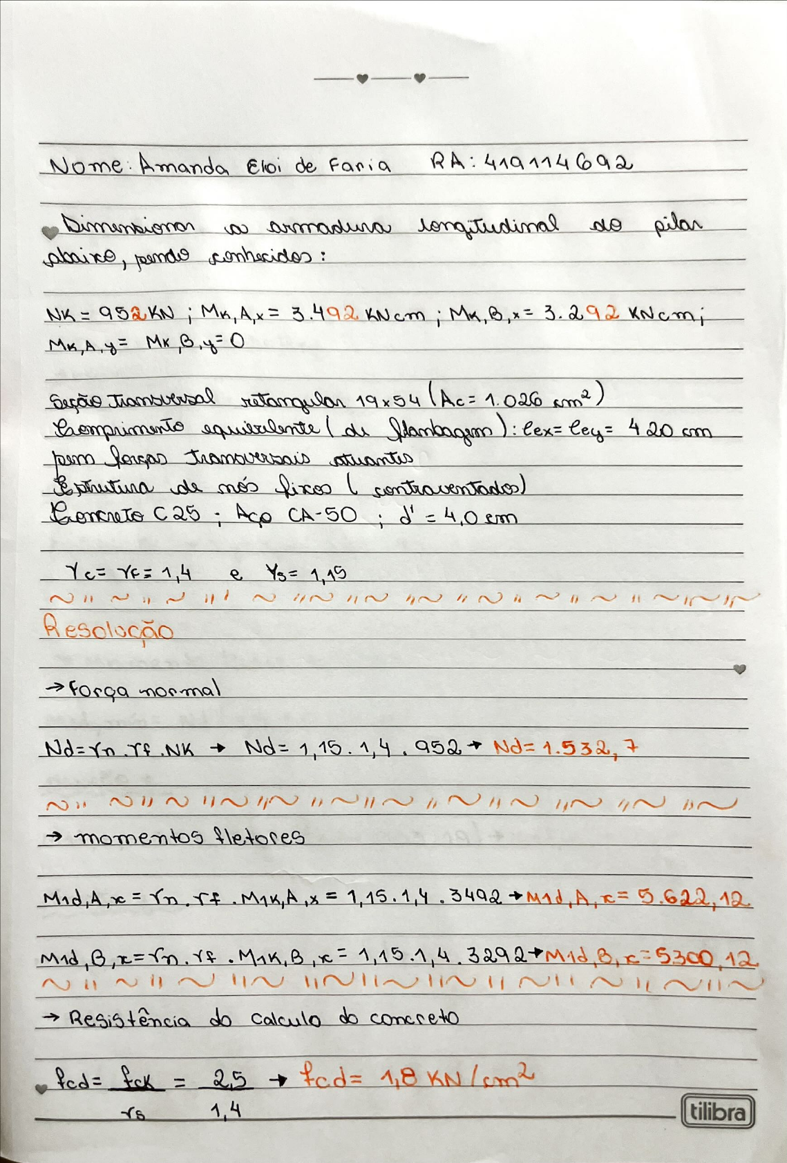 Nome: Amanda Eloi de Faria RA: 419114692 a armadura do pilar pendo NK = 952KN i = B, 3.292 Seção retangular 19x54 (Ac= = 1.026 Comprimento equilalente de lex= ley= 420 am de contraventados) Concreto C25 ; CA-50 d' = 4,0 em Ye= = 1,4 e Ys= 1,15 Resolução Força normal Nd= Nd= 1.532,7 momentos fletores = rf. = 1,15.1,4 3492 Mad, A, x= 5.622,12 B, ,x= rn. Mak, B, = 1,15.1,4. 3292 Mid B, 5300,12 Resistência do calculo do concreto fed= fck = 2,5 fcd= 1,8 KN cm2 rs 1,4 tilibrade calculo do Aço fyd = fyk fyd= 50 = 43,478 cm rs 1,15 Indice de esbeltez direção 3,46, 420 = = 76,5 h 19 direção y y= 420 26,9 h 54 Momento fletor Mad, min= = Nd + direção x, 1.532,7 min = cm y y, min= KN 11 Esbeltez limite (25+ 12,5 e1 35 ≤direção e1= e1= 5622,12 e1= 3,67 3, Nd 1532,7 h=19 = 0,6+ MB 0,4 xb MA xb=0,942 Xb= 5622,12 = 29,1 0,942 29,1 1,0 357 calcular a momento tilibraMomento fletor total de cálculo força normal admensional Nd = 1532,7 0,83 fed 1026, 1,8 11 aproximada 1 = 0,005 = 0,005 = r ≤ 0,005 = 0,005 = 5 19 momento fletor total = 5622,12 + 10 5 KNcm ≤ 5622,12 Md, tot, = 1,0 3172, 7 +0 3172, 7KN 11 2 11 2 11 2 11 11 director normal adimensional =0,83 tilibra-momento fletor adimensional Mx= 5351,2 h.Ac. 19.1026.1,8 = = 19 ÁBACO A4 0,62 As = As= As= 26,34 fyd 43,478 = 14616mm Adotado tilibra