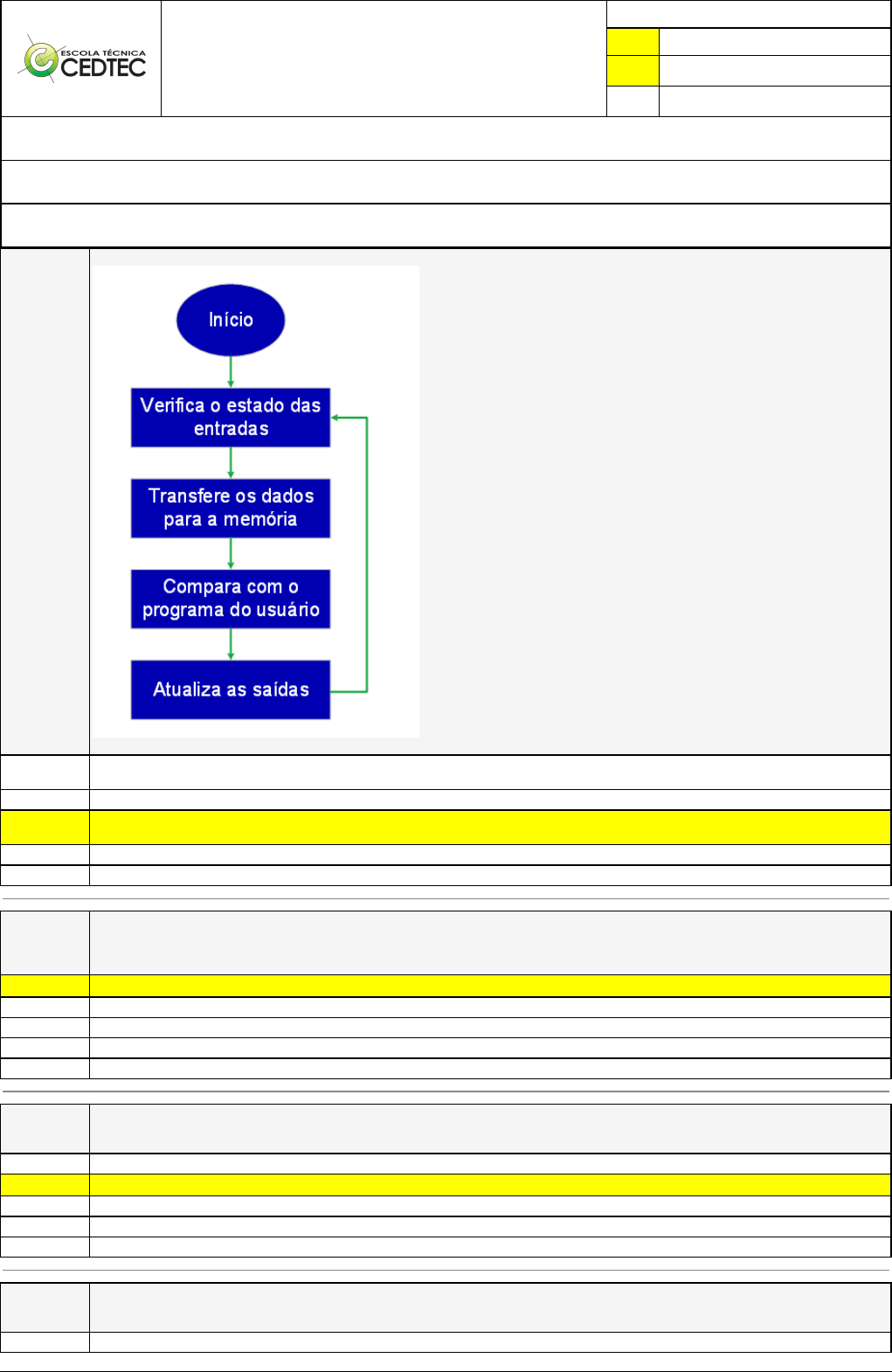 Pincel Atômico - 03/08/2025 18:15:20 1/5 Avaliação Presencial (EAD) Atividade finalizada em 28/07/2025 17:55:03 (4541082 / 1) LEGENDA Resposta correta na questão # Resposta correta - Questão Anulada X Resposta selecionada pelo Aluno Disciplina: CONTROLADOR LÓGICO PROGRAMÁVEL [1414144] - Avaliação com 20 questões, com o peso total de 51,00 pontos [capítulos - Todos] Turma: Curso Técnico: Eletromecânica - Grupo: EAD - 01/25 - EAD ELTM [151437] Aluno(a): 91720874 - MATHEUS AZEVEDO FARIAS - Respondeu 13 questões corretas, obtendo um total de 33,15 pontos como nota [350097_1268 92] Questão 001 Dada a seguinte figura do funcionamento de um CLP: É característica do início (inicialização): Após consultar a Memória Imagem das Entradas, atualiza o estado da Memória Imagem das Saídas, de acordo com as instruções definidas pelo usuário em seu programa. O CLP armazena os resultados obtidos em uma região chamada de Imagem das Entradas e Saídas. X Ao Inicializar Ao ligar o CLP, é verificado o funcionamento da CPU, memórias, circuitos auxiliares e existência de programa, desativando todas as saídas. O CLP realiza um processo de varredura que recebe o nome de Ciclo de Varredura (Scan) e normalmente é de alguns microssegundos (scan time). O CLP escreve o valor contido na Memória das Saídas, atualizando as interfaces. [350097_1268 89] Questão 002 Qual das alternativas NÃO é característica de um CLP: X Não poderem realizar operações aritméticas. Podem ser reutilizados. Grande confiabilidade. Permitem interface de comunicação com outros CLPs. São programáveis. [350097_357] Questão 003 A função SENÃO() do portugol se equivale a que função da linguagem C? IF() X Else Scanf() Printf() Main() [350097_350] Questão 004 A linguagem C é uma linguagem: Orientada a objeto e compilada Pincel Atômico - 03/08/2025 18:15:20 2/5 X Estruturada e compilada Linguagem web Estruturada e interpretada Orientada a objeto e interpretada [350097_5418] Questão 005 Sobre um CLP, é correto afirmar que: Os pontos de saída são atualizados à medida que o programa é executado. O Watchdog Timer é reinicializado a cada três ciclos de Scan. O tempo de duração de um ciclo de scan depende apenas do desempenho da CPU. A execução do programa Ladder é feito a partir do primeiro rung, executando-o da esquerda para a direita e de cima para baixo. X Durante um ciclo de execução (ciclo de scan), o estado lógico das entradas é constantemente verificado. [350097_354] Questão 006 O que é um algoritmo? Algoritmo é uma técnica utilizada para programação em linguagens orientadas a objeto Algoritmo é uma linguagem de programação estruturada Algoritmo é uma linguagem de programação orientada a objeto X Algoritmo é uma sequência de instruções ordenadas de forma lógica para a resolução de uma determinada tarefa ou problema Algoritmo é uma linguagem de programação utilizada exclusivamente para problemas mais simples [350097_1408 4] Questão 007 Um sistema automatizado é composto por 2(duas) partes principais, sendo elas: Parte analógica e parte digital. Parte operacional e parte comandada. X Parte operacional e parte de controle. Parte comandada e parte controlada. Parte física e parte de controle. [350097_4259] Questão 008 A Figura 1 ilustra uma plataforma semissubmersível sendo movimentada pelas ondas. O alarme de nível alto é constantemente atingido por causa do movimento do fluido dentro do separador (tanque de armazenagem e separação de óleo, gás e água). Neste caso, é comumente utilizado um filtro no ladder, onde somente ocorrerá o alarme se o sensor permanecer atuado por 3 segundos ou mais (Figura 2). A que tipo de temporizador corresponde esta forma de atuação? Timer - Pulse – TP Timer On-Delay – TON X Timer In-Delay – TIN Timer Off-Delay – TOF Timer - Delay – TD [350097_4260] Questão 009 Um sistema de controle de nível é composto dos seguintes componentes: • 01 x medidor de nível do tipo capacitivo • 02 x lâmpadas para sinalização de nível máximo e nível mínimo • 01 x chave de nível • 01x válvula de controle proporcional • 02 x válvulas solenoide • 01 x botão de liga sistema Será utilizado um Controlador Lógico Programável (CLP) para realizar a automação do sistema. Com base nos componentes utilizados, o número de entradas digitais, saídas digitais, entradas analógicas e saídas analógicas são, respectivamente: 3, 5, 0, 0 1, 2, 2, 3 2, 2, 1, 3 X 2, 4, 1, 1 Pincel Atômico - 03/08/2025 18:15:20 3/5 1, 3, 2, 2 [350097_7190 3] Questão 010 No programa Logix Pro qual das alternativas abaixo possui o endereçamento correto de uma chave de Entrada: I:1 O:1 O:1/0 X I:1/0 E:1/0 [350098_7190 7] Questão 011 O Programa Logix Pro é um programa de Simulação, sabendo desta afirmativa podemos concluir que: O programa simula apenas um PLC X O programa simula um PLC e um supervisório O Programa simula um Relé Programável O programa simula um SDCD O programa simula apenas um supervisório [350098_1269 78] Questão 012 No fim do código abaixo valor armazenado na variável “Resultado” será: inteiro x, y, resultado; x = 3; y = 2; resultado = (x*y)+5; 21 19 15 X 11 9 [350098_1274 96] Questão 013 Para a planta abaixo, marque a opção INCORRETA: O conjunto MOTOR UP e MOTOR DOWN são saídas que podem atuar na posição da porta. Para um controle completo as lâmpadas não são estritamente necessárias. X O conjunto AJAR, OPEN E SHUT são saídas que podem indicar a posição da porta. O conjunto OPEN, CLOSE e STOP são saídas que controlam a posição da porta. O conjunto LS1 e LS2 são entradas que indicam a posição da porta. [350098_1268 93] Questão 014 Dada a seguinte figura do funcionamento de um CLP: É característica de verificar o estado das entradas: Pincel Atômico - 03/08/2025 18:15:20 4/5 O CLP executa uma série de operações pré-programadas, gravadas em seu Programa Monitor. O CLP arma