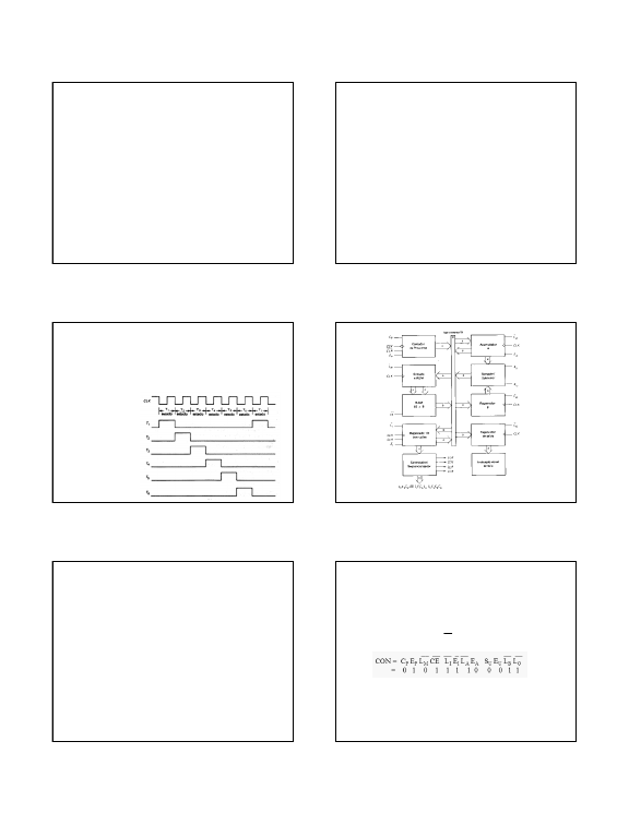 1 Microarquitetura SAP-1 (Parte 2) Professor: Alexandre Scaico alexandre.scaico@gmail.com Faculdade de Ciências Sociais Aplicadas Curso de Sistemas de Informações Organização e Arquitetura de Computadores 2 Temporização no SAP-1 A unidade de controle gera as palavras de controle que causam a BUSCA e EXECUÇÃO de cada instrução em 6 ESTADOS DE TEMPORIZAÇÃO (estados T) gerados por pulsos sucessivos do relógio Os 3 primeiros estados são comuns a todas as instruções e formam o ciclo de busca O 3 últimos estados dependem da instrução a ser executada e formam o ciclo de exeução 3 Temporização no SAP-1 Os estados T são gerados por um contador em anel, que gera os seguintes códigos T1 = 000001 T2 = 000010 T3 = 000100 T4 = 001000 T5 = 010000 T6 = 100000 4Arquitetura do SAP-1 5 Ciclo de Busca Composto pelos seguintes estados: Estado de Endereço Estado de Incremento Estado de Memória 6 Ciclo de Busca Estado de Endereço (T1) Endereço contido no PC é transferido pro REM Sinais ativo→ EP e LM Estado de Incremento (T2) O conteúdo do contador de programa (PC) é incrementado Sinal ativo→ CP 2 7 Ciclo de Busca Estado de Memória (T3) A instrução endereçada na memória é transferida da memória para o registrador de instrução (RI) Sinais ativo→ CE e LI 8 Ciclo de Busca Ciclo de busca – (a) Estado T1, (b) Estado T2 e (c) Estado T3 9 Ciclos de Execução Ocorre após o ciclo de busca e os sinais de controle gerados dependem da instrução a ser executada O controlador-sequencializador possui um circuito combinacional (matriz de controle) que gera suas saídas de acordo com o estado T e o código da operação presente no RI No ciclo de busca a saída do controlador depende apenas dos estados T 10 Ciclos de Execução Rotina LDA Em T4 os bits da instrução são enviados ao controlador-sequencializador e os bits de endereço do operando (dado) são enviados ao REM → sinais ativos: EI e LM Em T5 o dado da RAM (a partir do endereço no REM) é enviado ao registrador A → sinais ativos: CE e LA T6 é um estado sem operação (a palavra de controle gerada possui todos os sinais de controle desativos) 11 Ciclos de Execução Rotina LDA Ciclo de execução LDA – (a) Estado T4, (b) Estado T5 e (c) Estado T6 12Diagrama de temporização do ciclo completo da instrução LDA 3 13 Ciclos de Execução Rotina ADD Em T4 os bits da instrução são enviados ao controlador-sequencializador e os bits de endereço do operando (dado) são enviados ao REM → sinais ativos: EI e LM Em T5 o dado da RAM (a partir do endereço no REM) é enviado ao registrador B → sinais ativos: CE e LB Em T6 a soma é realizada e seu resultado é armazenado em Acc→ sinais ativos: EU e LA 14 Ciclos de Execução Rotina ADD Ciclo de execução ADD – (a) Estado T4, (b) Estado T5 e (c) Estado T6 15Diagrama de temporização do ciclo completo da instrução ADD 16 Ciclos de Execução Rotina SUB Tem praticamente o mesmo ciclo de execução do ADD, a exceção do sinal SU, que neste caso é ativo indicando a subtração Rotina OUT Possui apenas o ciclo T4, com T5 e T6 sendo estados sem operação Nesta instrução os 4 bits menos significativos da palavra que contém o código são irrelevantes Sinais ativos em T4→ EA e LO 17 Ciclos de Execução Rotina HLT Não possui rotina de execução O controlador ao receber o código de operação HLT (1111) interrompe o processamento gerando uma palavra de controle onde todos os sinais estão desativos, e interrompendo o contador em anel Sem o contador o sistema não tem mais como funcionar,a menos que se reinicie o sistema 18 Microprograma do SAP-1 Microinstruções São as palavras geradas pelo controlador a cada estado T do processamento Macroinstruções São instruções de mais alto nível, compostas por um certo número de microinstruções Cada macroinstrução do SAP-1 é formada por 3 microinstruções (não levamos em conta as microinstruções do ciclo de busca) 4 19 Microprograma do SAP-1 Macroinstrução LDA 20 Microprograma do SAP-1 21 Microprograma do SAP-1 Sinais ativos de acordo com o estado T e a instrução 22 Microprogramação do SAP-1 Com o aumento do número de instruções a contrução da matriz de contole (que gera os sinais de controle) se torna muito complexa Alternativa→ microprogramação Na microprogramação, as palavras de controle são previamente armazenadas em uma memória ROM, e são lidas ao longo da execução das instruções 23 Microprogramação do SAP-1 Estrutura de microprogramação do SAP-1 24 Microprogramação do SAP-1 Controle microprograma do SAP-1 ROM de endereços Contador pré-ajustável ROM de controle Etapas do controle microprogramado Endereçamento inicial da rotina da instrução Escalonamento através dos endereços da rotina Aplicação dos endereço à ROM de controle 5 25 Microprogramação do SAP-1 ROM de endereços Recebe o código da operação do RI e gera o endereço onde fica a rotina de cada instrução 26 Microprogramação do SAP-1 Contador pré-ajustável Inicia em 0000 (T1) e vai até 0010 (T3) Em T3 o valor da ROM de endereços é reconhecida pelo contador, mudando o seu valor de contagem em T4 De T4 a T6 o valor do contador irá iniciar com o valor proveniente da ROM de endereços e será incrementado, endereçando assim a ROM de controle 27 Microprogramação do SAP-1 Estrutura de microprogramação do SAP-1 28 Microprogramação do SAP-1 ROM de controle Armazena as microinstruções De T1 a T3 recebe o valor do contador (0000, 0001 e 0010) Em T3 o endereço da rotina da instrução é reconhecida pelo contador mudando o valor da contagem Com isso temos a correta execução dos estados T4, T5 e T6 para cada instrução 29 Microprogramação do SAP-1 ROM de controle Entrada→ saída do contador pré-ajustável - endereços do microprograma Saída → palavras de controle (microinstruções) que executam a operação correspondente à instrução 30Conteúdo da ROM de controle
