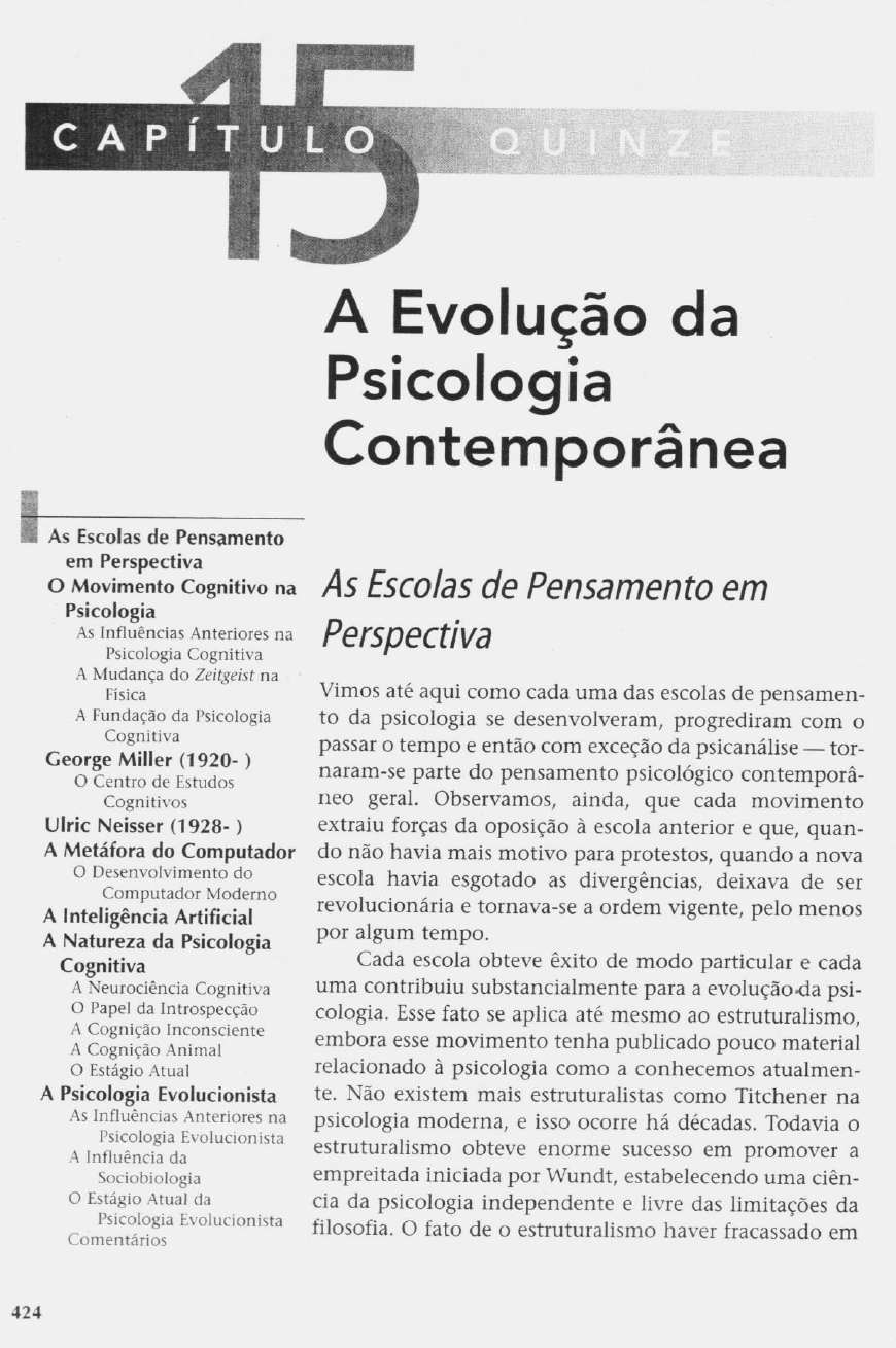 CAPÍTULO QUINZE A Evolução da Psicologia Contemporânea As Escolas de Pensamento em Perspectiva Movimento Cognitivo na As Escolas de Pensamento em Psicologia As Influências Anteriores na Perspectiva Psicologia Cognitiva A Mudança do Zeitgeist na Física Vimos até aqui como cada uma das escolas de pensamen- A Fundação da Psicologia to da psicologia se desenvolveram, progrediram com o Cognitiva passar tempo e então com exceção da psicanálise tor- George Miller (1920- ) Centro de Estudos naram-se parte do pensamento psicológico contemporâ- Cognitivos neo geral. Observamos, ainda, que cada movimento Ulric Neisser (1928- ) extraiu forças da oposição à escola anterior e que, quan- A Metáfora do Computador do não havia mais motivo para protestos, quando a nova Desenvolvimento do escola havia esgotado as divergências, deixava de ser Computador Moderno A Inteligência Artificial revolucionária e tornava-se a ordem vigente, pelo menos A Natureza da Psicologia por algum tempo. Cognitiva Cada escola obteve êxito de modo particular e cada A Neurociência Cognitiva uma contribuiu substancialmente para a evolução da psi- Papel da Introspecção cologia. Esse fato se aplica até mesmo ao estruturalismo, A Cognição Inconsciente A Cognição Animal embora esse movimento tenha publicado pouco material Estágio Atual relacionado à psicologia como a conhecemos atualmen- A Psicologia Evolucionista te. Não existem mais estruturalistas como Titchener na As Influências Anteriores na psicologia moderna, e isso ocorre há décadas. Todavia o Psicologia Evolucionista A Influência da estruturalismo obteve enorme sucesso em promover a Sociobiologia empreitada iniciada por Wundt, estabelecendo uma ciên- Estágio Atual da cia da psicologia independente e livre das limitações da Psicologia Evolucionista filosofia. fato de estruturalismo haver fracassado em Comentários 424CAPÍTULO 15 A EVOLUÇÃO DA PSICOLOGIA CONTEMPORÂNEA 425 dominar a psicologia, fazendo-o apenas por um curto período, não desvaloriza a sua rea- lização revolucionária como a primeira escola de pensamento da nova ciência e a fonte vital de oposição para sistemas seguintes. Analisemos sucesso do funcionalismo, que não conseguiu persistir como escola separada. Os funcionalistas buscavam apenas impor uma atitude ou um ponto de vista e, nesse aspecto, funcionalismo obteve êxito em penetrar no pensamento psicológico americano. Na medida em que a psicologia americana atual é vista mais como uma pro- fissão científica e suas descobertas são aplicadas praticamente em todos os aspectos da vida, a atitude funcional e utilitária realmente mudou a natureza da psicologia. E que dizer da psicologia da Gestalt? A escola da Gestalt, em uma escala mais modesta, também cumpriu sua missão. A oposição ao elementarismo, o apoio à aborda- gem da "totalidade" e o interesse na consciência influenciaram psicólogos da psicolo- gia clínica, da aprendizagem, da percepção, da psicologia social e do pensamento. Embora a escola da Gestalt não tenha transformado a psicologia da forma como espera- vam fundadores, exerceu considerável impacto e deve ser considerada um sucesso. Mesmo que as realizações do estruturalismo, do funcionalismo e da psicologia da Gestalt mereçam o devido destaque, esses movimentos ocupam o segundo lugar em comparação com impacto fenomenal do behaviorismo e da psicanálise. Os efeitos des- ses movimentos foram profundos, mantendo identidades próprias e independentes como escolas únicas de pensamento. Passada a época dos seus fundadores, Watson e Freud, tanto behaviorismo como a psicanálise dividiram-se internamente em várias posições. Nenhuma forma de beha- viorismo ou de psicanálise obteve adesão total dos membros de qualquer uma dessas escolas. surgimento de subescolas dividiu sistemas em concorrentes, cada uma com o próprio mapa para caminho da verdade. Todavia, apesar dessa diversidade interna, tanto behavioristas como psicanalistas mantêm-se firmes na oposição, uns contra outros, em relação às suas visões sobre a psicologia. Por exemplo: os behavio- ristas skinnerianos têm mais aspectos em comum com os sociobehavioristas seguidores de Bandura e de Rotter do que com adeptos da psicanálise de Jung e de Horney. A vita- lidade das duas escolas de pensamento é evidente na sua contínua evolução. Assim como a psicologia individual de Adler em relação à psicanálise, a psicologia de Skinner não é último estágio na evolução do behaviorismo. Vimos, ainda, que a psicologia humanis- ta, mesmo não conseguindo provocar impacto como escola de pensamento independen- te, influenciou a psicologia contemporânea, incentivando o crescimento do movimento da psicologia positiva. Por volta das décadas de 1960 e 1970, dois outros movimentos surgiram dentro da psicologia americana, cada um na tentativa de moldar uma nova definição para campo são eles a psicologia cognitiva e a psicologia evolucionista. Porém, façamos uma pausa para ler a história do mais famoso desafio de xadrez de todos os tempos, ocorrido na cidade de Nova York, em 1997. Não é necessário saber jogar xadrez para apreciar o inten- so drama humano envolvido. Garry Kasparov não era apenas mais um grande jogador de xadrez: ele era o mestre de todos grão-mestres. No consenso universal, era considerado o maior enxadrista da his- tória. Na primavera de 1997, com 34 anos, no auge do prolongado reconhecimento, vinha mantendo o título mundial por 12 anos. Jamais perdera uma única vez em uma competição de várias partidas contra um único oponente. Jamais exibira outra coisa que não a absoluta confiança na sua genialidade no xadrez. Sua atitude em relação a qual-426 HISTÓRIA DA PSICOLOGIA MODERNA quer rival chegava ao limite da indolência, traço exibido novamente ao vencer, como havia previsto, a primeira das seis partidas do anunciado reconfronto, naquele mês de maio em Nova York, contra o oponente