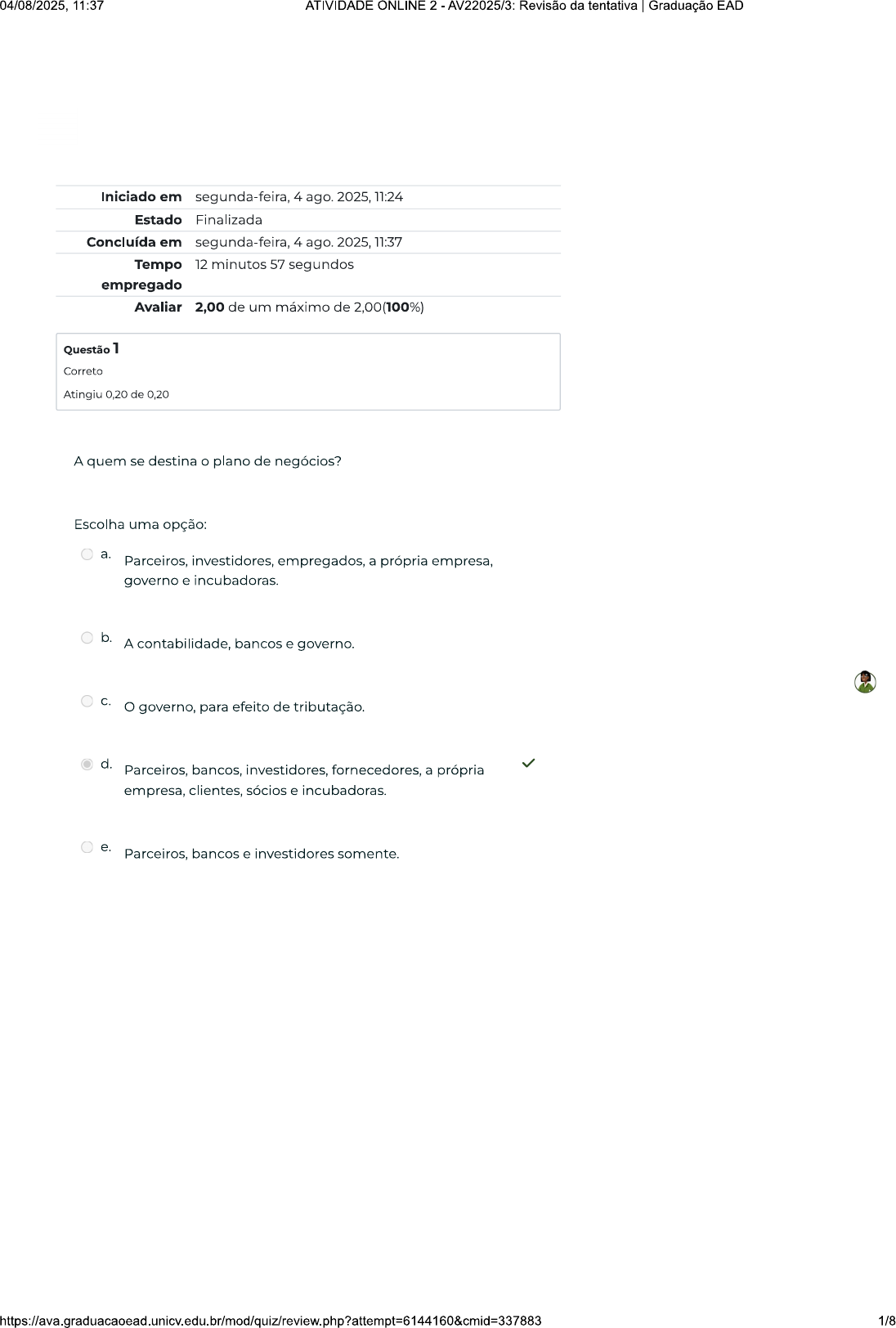 04/08/2025, 11:37 ATIVIDADE ONLINE 2 - AV22025/3: Revisão da tentativa Graduação EAD Iniciado em segunda-feira, 4 ago. 2025, 11:24 Estado Finalizada Concluída em segunda-feira, 4 ago. 2025, 11:37 Tempo 12 minutos 57 segundos empregado Avaliar 2,00 de um máximo de 2,00(100%) Questão 1 Correto Atingiu 0,20 de 0,20 A quem se destina plano de negócios? Escolha uma opção: a. Parceiros, investidores, empregados, a própria empresa, governo e e incubadoras. b. A contabilidade, bancos e governo. C. governo, para efeito de tributação. d. Parceiros, bancos, investidores, fornecedores, a própria empresa, clientes, sócios e incubadoras. e. Parceiros, bancos e investidores somente. 1/804/08/2025, 11:37 ATIVIDADE ONLINE 2 AV22025/3: Revisão da tentativa Graduação EAD Questão 2 Correto Atingiu 0,20 de 0,20 É verdadeiro que cada área de atuação nas organizações existe características específicas, bem como o empreendedor e intraempreendedores. Dessa forma, assinale a alternativa referente as principais características do intraempreendedores: Escolha uma opção: a. ser líder, formador de equipes, mas falta planejamento em suas atividades. b. Verificar oportunidades, pois sua meta é ficar rico, ser dinâmico e determinado. C. Possuire manter um boa rede de relacionamento, alto confiança em suas convicções, ter conhecimento dos processos da organizaçãoe identificar oportunidade. d. saber identificar os concorrentes que cercam seu mercado. e. criar valor para si somente, e não para a sociedade 2/804/08/2025, 11:37 ATIVIDADE ONLINE 2 AV22025/3: Revisão da tentativa Graduação EAD Questão 3 Correto Atingiu 0,20 de 0,20 Plano de Negócio é documento mais importante de uma empresa, pois se trata do planejamento do negócio, antes mesmo da abertura da empresa. Desse modo, sobre Plano de Negócios, avalie as afirmativas a seguir: É a organização das informações internas e externas para análise de uma empresa. Possui informações descritivas da empresa, do mercado e dos cálculos, com objetivo de apresentar informações de um negócio, novo ou não. III Esse é um documento que não é comum nas relações de franchising, visto que já existe conhecimento pela empresa franqueadora. IV Uma ideia de negócio nem sempre representa uma oportunidade de negócio. É correto que se afirma em: Escolha uma opção: a. I, e III, apenas. b. II, III e IV, apenas. C. I, III e IV, apenas. d. I, e IV, apenas. e. Todas. 3/804/08/2025, 11:37 ATIVIDADE ONLINE 2 AV22025/3: Revisão da tentativa Graduação EAD Questão 4 Correto Atingiu 0,20 de 0,20 Uma das fontes que pode ser utilizada na fase do Plano de Negócios é a fonte primária. Sobre a fonte primária, assinale a alternativa correta. Escolha uma opção: a. É a elaboração de um questionário ou roteiro utilizado para uma pesquisa, buscando entender melhor mercado. b. É a elaboração de um questionário ou roteiro utilizado para uma pesquisa, buscando entender melhor fornecedores. C. É a elaboração de um questionário ou roteiro utilizado para uma pesquisa, buscando entender melhor sócio. d. É a elaboração de um questionário ou roteiro utilizado para uma pesquisa, buscando entender melhor colaboradores. e. É a elaboração de um questionário ou roteiro utilizado para uma pesquisa, buscando entender melhor a instituição bancária. Questão 5 Correto Atingiu 0,20 de 0,20 Qual a importância do plano de negócios no processo empreendedor? Escolha uma opção: a. Ele procura organizar e demonstrar as questões legais do negócio e organizar a hierarquia da empresa, assim como a participação de capital de cada sócio. b. Ele é apenas um documento de apoio feito no início do empreendimento; após a abertura do negócio, mesmo é arquivado juntamente com documentos contábeis que ficam em poder do contador. C. É um documento obrigatório por lei e que serve para definir limites financeiros do empreendimento, bem como demonstrar investimento de capital aplicado por cada um dos sócios. d. Documento obrigatória que apresenta a intensão da empresa para com mercado. e. Ele procura organizar e demonstrar todas as ideias do empreendedor, desde como negócio irá se comportar, passando pela descrição de produtos, serviços, sócios, mercado, concorrentes, visão e missão de um negócio. 4/804/08/2025, 11:37 ATIVIDADE ONLINE 2 - AV22025/3: Revisão da tentativa Graduação EAD Questão 6 Correto Atingiu 0,20 de 0,20 Ao estudarmos o livro de empreendedorismo entendemos que para que haja uma cultura intraempreendedora deve-se estimular a criatividade dando suporte para desenvolvimento de ideias. Sobre a cultura assinale as alternativas com V para verdadeiro e F para falso: mudança para cultura intraempreendedorabusca revolucionar clima organizacional. cultura intraempreendedora é baseada em controle das atividades desenvolvidas e monitoramento dos departamentos. com os erros e encara as mudanças como uma oportunidade. ()Para que se atinja resultados esperados, busca incorporar a visão inovadora e criativa, gerando confiança mútua. Com base nas afirmações e no livro Empreendedorismo, assinale a opção CORRETA: Escolha uma opção: a. V,V,F,F. b. F,F,V,V. C. V,V,F,V. d. F,V,V,F. e. F,V,V,V. 5/804/08/2025, 11:37 ATIVIDADE ONLINE 2 AV22025/3: Revisão da tentativa Graduação EAD Questão 7 Correto Atingiu 0,20 de 0,20 modelo Canvas é, atualmente, muito utilizado, pois representa as áreas-chave para que o negócio atinja sucesso. Sobre os campos do Canvas, assinale a alternativa correta. Escolha uma opção: a. Os relacionamentos representam a estratégia para lidar com os fornecedores e obter vantagens sobre eles. b. Os recursos-chave são os materiais que serão utilizados para a fabricação dos produtos. C. Os canais são meios que a empresa utiliza, ou utilizará, para que os produtos ou serviços cheguem até os seus clientes. d. As parcerias-chave representam quais são os colaboradores que trabalharão n