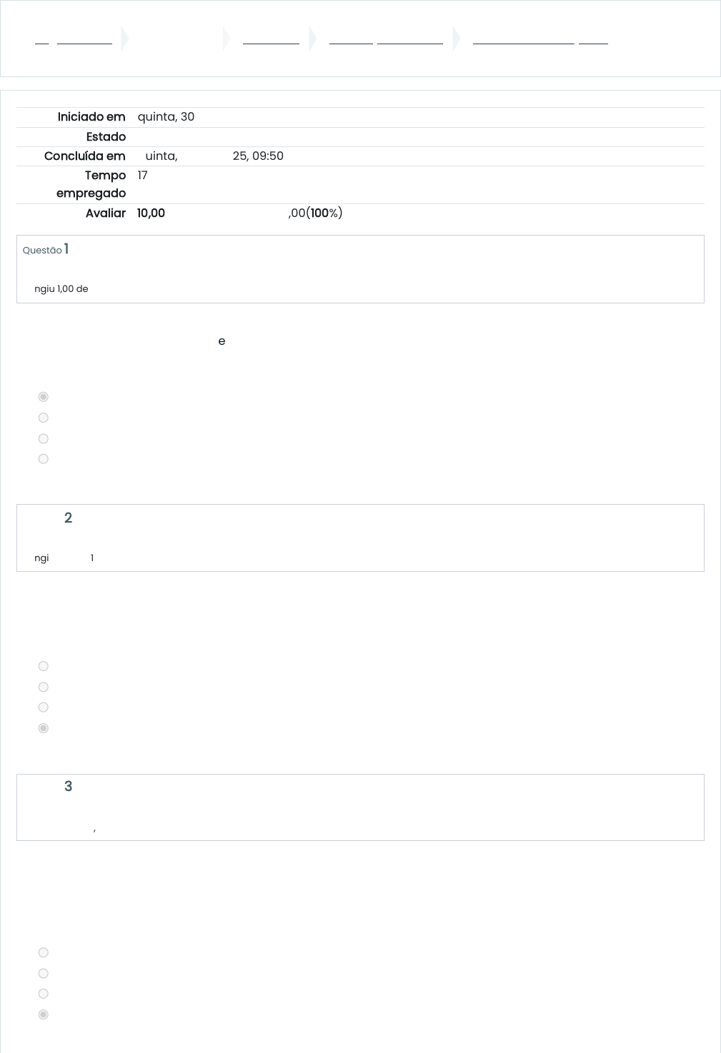 Página inicial Meus cursos IB - 2025.1 Introdução ao Excel Exercícios de Fixação IV Iniciado em quinta, 30 jan 2025, 09:33 Estado Finalizada Concluída em quinta, 30 jan 2025, 09:50 Tempo empregado 17 minutos Avaliar 10,00 de um máximo de 10,00(100%) Questão 1 Correto Atingiu 1,00 de 1,00 Questão 2 Correto Atingiu 1,00 de 1,00 Questão 3 Correto Atingiu 1,00 de 1,00 Maria precisa inserir um gráfico em sua planilha para visualizar a evolução das vendas de sua loja ao longo do ano. Qual aba do Excel permite a criação de gráficos? a. Inserir. b. Fórmulas. c. Layout de Página. d. Exibir. Juliana está trabalhando em uma planilha financeira e precisa calcular a soma total de uma coluna de valores. Qual função do Excel pode realizar essa operação automaticamente? a. SE. b. MÉDIA. c. PROCV. d. SOMA. Fernanda está finalizando uma planilha de controle de estoque e quer proteger as células com fórmulas para evitar que sejam alteradas acidentalmente por outros usuários. Qual aba oferece a opção de proteger a planilha? a. Exibir. b. Inserir. c. Dados. d. Revisão. 30/01/2025, 10:51 Exercícios de Fixação IV: Revisão da tentativa https://cursoslivres.ifms.edu.br/mod/quiz/review.php?attempt=782051&cmid=13995 1/4 https://cursoslivres.ifms.edu.br/ https://cursoslivres.ifms.edu.br/course/view.php?id=319 https://cursoslivres.ifms.edu.br/course/view.php?id=319§ion=7 https://cursoslivres.ifms.edu.br/mod/quiz/view.php?id=13995 Questão 4 Correto Atingiu 1,00 de 1,00 Questão 5 Correto Atingiu 1,00 de 1,00 Questão 6 Correto Atingiu 1,00 de 1,00 Questão 7 Correto Atingiu 1,00 de 1,00 João está criando uma planilha no Excel para calcular suas despesas mensais. Ele deseja aplicar uma formatação que destaque automaticamente as células que contenham valores acima de R$ 500,00. Qual recurso do Excel ele deve usar? a. Filtro avançado. b. Gráfico dinâmico. c. Tabela dinâmica. d. Formatação condicional. Amanda precisa destacar os produtos que estão com estoque baixo em sua planilha de controle de inventário, utilizando uma cor diferente para os itens com quantidade inferior a 10. Qual ferramenta do Excel permite essa personalização visual? a. Gráfico dinâmico. b. Filtro de dados. c. Formatação condicional. d. Validação de dados. Felipe precisa importar dados de outra planilha do Excel para realizar comparações com os dados já existentes em sua planilha atual. Qual aba ele deve acessar para realizar essa tarefa? a. Layout de Página. b. Inserir. c. Dados. d. Fórmulas. Carlos está organizando uma planilha com mais de 500 linhas de dados. Ele quer facilitar a visualização e ordenação dos dados, aplicando filtros para encontrar rapidamente informações específicas. Em qual aba ele pode ativar os filtros? a. Página Inicial. b. Exibir. c. Dados. d. Revisão. 30/01/2025, 10:51 Exercícios de Fixação IV: Revisão da tentativa https://cursoslivres.ifms.edu.br/mod/quiz/review.php?attempt=782051&cmid=13995 2/4 Questão 8 Correto Atingiu 1,00 de 1,00 Questão 9 Correto Atingiu 1,00 de 1,00 Questão 10 Correto Atingiu 1,00 de 1,00 Carla está utilizando o Excel para calcular o imposto de renda de seus clientes. Ela precisa de uma função que verifique se um valor é maior que R$ 2.000,00 e, se for, aplique uma alíquota específica. Qual função do Excel realiza essa verificação lógica? a. MÉDIA. b. PROCV. c. SE. d. SOMA. Lucas está criando uma planilha de controle de frequência dos funcionários e precisa calcular a média de horas trabalhadas por mês. Qual função do Excel ele deve utilizar para calcular a média? a. MÉDIA. b. SOMA. c. PROCV. d. SE. Paulo está criando uma planilha no Excel e quer garantir que o layout esteja adequado para impressão, ajustando as margens e a orientação da página. Em qual aba ele encontra essas opções? a. Exibir. b. Inserir. c. Fórmulas. d. Layout de Página. Atividade anterior ◄ Aula 22 - Excel: Gráficos Seguir para... Próxima atividade Aula 23 - Editor de Slides (Power Point) - Introdução ► 30/01/2025, 10:51 Exercícios de Fixação IV: Revisão da tentativa https://cursoslivres.ifms.edu.br/mod/quiz/review.php?attempt=782051&cmid=13995 3/4 https://cursoslivres.ifms.edu.br/mod/resource/view.php?id=14065&forceview=1 https://cursoslivres.ifms.edu.br/mod/resource/view.php?id=14066&forceview=1 Manter contato IFMS http://ifms.edu.br cursoslivres@ifms.edu.br Resumo de retenção de dados Baixar o aplicativo móvel. 30/01/2025, 10:51 Exercícios de Fixação IV: Revisão da tentativa https://cursoslivres.ifms.edu.br/mod/quiz/review.php?attempt=782051&cmid=13995 4/4 http://ifms.edu.br/ mailto:cursoslivres@ifms.edu.br https://www.facebook.com/ifms.oficial/ https://cursoslivres.ifms.edu.br/admin/tool/dataprivacy/summary.php https://download.moodle.org/mobile?version=2021051711.03&lang=pt_br&iosappid=633359593&androidappid=com.moodle.moodlemobile