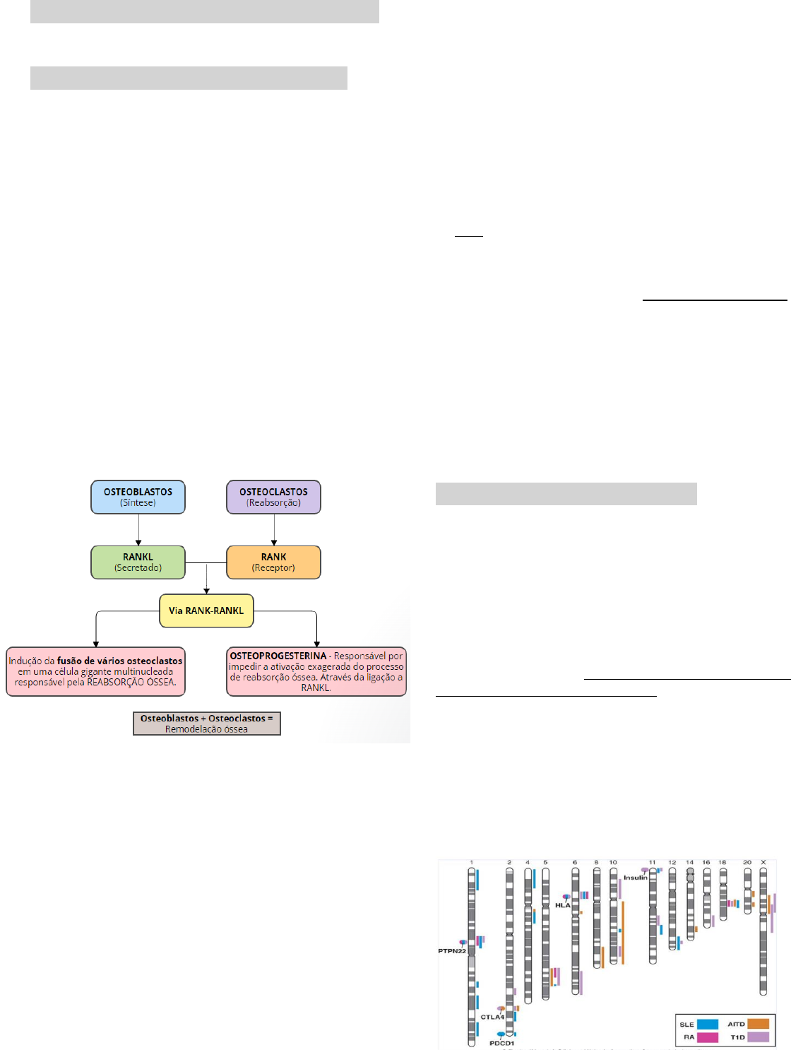 Distúrbios ósseos, articulares e reumatológicos Maria Nívea Bezerra da Silva – BIOMED 2023.2 Doenças Reumatológicas Não Autoimunes Artrite: Inflamação das articulações, caracterizada como SINTOMA quando dita de forma isolada. Termos como artrite reumatoide, osteoartrite, artrose, são considerados DOENÇAS. Osteoartrite/artrose/osteoartrose/reumatismo → Desgaste das cartilagens que revestem as articulações (principalmente as sinoviais), normalmente se manifestando de forma localizada. É a primeira mais prevalente dentre as não autoimunes, a segunda é a osteoporose. - As monoartrites são mais comuns. - Em doenças reumatológicas autoimunes, é comum que haja artrites simétricas ou poliartrites. - A osteoporose é muito comum em mulheres pós- menopausadas, isso acontece pois nesse período há uma baixa de estrógeno, que funciona como regulador positivo da osteoprogesterina, dessa forma, com baixos níveis, não há como impedir a superativação da via RANK-RANKL, a responsável pelo processo de reabsorção óssea. Seu diagnóstico padrão-ouro é a densitometria óssea. [Marcadores de Síntese (Formação óssea)] Osteocalcina – Principal proteína não-colagênica dos ossos. Possui algumas limitações como ser muito instável in vivo e pouco estável in vitro, além de aumentar seus níveis com a dieta. Osteoprogesterina Fosfatase alcalina óssea – Possui uma vantagem que é mensurá-la. Dentre os três marcadores citados, é considerada a melhor, uma vez que sua sensibilidade e especificidade são maiores. - Geralmente, os marcadores de bioquímicos de reabsorção óssea são considerados melhores que os de síntese, para informar se o seguimento de tratamento do paciente está ocorrendo de forma adequada ou necessita de ajustes. [Marcadores de Reabsorção Óssea] Cálcio urinário – Sofre muita interferência metabólica, apesar de ser um teste barato. Hidroxiprolina urinária (aminoácido modificado muito encontrado no colágeno tipo 1) – Representa de 10 – 13% da hidroxiprolina metabolizada no osso. Peptídeos interligadores do colágeno tipo 1 – Mais sensíveis e mais específicos que os outros marcadores de reabsorção e síntese. o Piridinolina (PYD) o Deoxipiridinolina (DPD) – Melhor das 2. - Ambos são marcadores urinários, o que se torna um interferente em pacientes com problemas renais. !!! OBS.: A fosfatase ácida também pode ser utilizada como marcador de reabsorção óssea. - As extremidades do colágeno tipo 1 se linearizam, formando regiões denominadas telopeptídeos terminais, esses telopeptídeos são também utilizados como marcadores, sendo considerados os melhores de todos, podem ser de dois tipos: o CTx (Carbono terminal) – Consegue ser medido no soro (vantagem), não sofre influência do ciclo circadiano, hormonal, nem da dieta, é estável in vitro e in vivo. o NTx (Amino terminal) – Sua única diferença em relação do CTx é que não pode ser mensurado no soro. Lúpus Eritematoso Sistêmico (LES) É uma doença inflamatória sistêmica crônica, de causa desconhecida, que não possui cura e que segue uma evolução de exarcebações e remissões alternadas. - Afeta predominantemente mulheres em idade reprodutiva (9-10x mais). - O que se sabe é que a reação começa na pele, através da exposição aos raios-UV, fazendo com que os queratinócitos entrem em apoptose, gerando autoanticorpos contra os antígenos nucleares dos apoptossomos. ▪ A idade de início da doença varia de 2 a 90 anos ▪ Prevalência na população = 1:2000 (estimativa conservadora) ▪ Brasil → 200mil + de mil diagnósticos por ano - É uma doença poligênica, normalmente é solicitado um HLAgrama para fazer um rastreio genético quando se tem suspeitas de LES ou outra condição autoimune. - A identificação de genes de susceptibilidade constitui uma área ativa de investigação: HLA-DR2 e HLA-DR3 conferem aumento moderado no risco de LES. [Comprometimentos durante fase de atividade] Comprometimento de múltiplos sistemas orgânicos durante os períodos de atividade da doença. - As manifestações menos frequentes são as cardíacas, pulmonares e linfáticas. Figura: Representação da vasculite periungueal, condição em que os vasos sanguíneos das extremidades dos dedos se tornam mais superficiais, sendo atacados pelo componente autoimune da doença, formando úlceras. - Normalmente o rash cutâneo só está presente em pacientes com atividade da doença. [Lesões Cutâneas] - Os autoantígenos nucleares (Exemplos.: snRNP, anti-Ro, etc.) concentram-se em vesículas encontradas na superfície dos queratinócitos que sofrem apoptose. - A luz UV, que exacerba a atividade da doença na maioria dos pacientes com LES, por poder induzir apoptose dos queratinócitos. [Associação do Lúpus Eritematoso Sistêmico com Deficiências Genéticas] O autoanticorpo se liga ao autoantígeno, sendo acrescidos pela ligação do sistema complemento na porção Fc do autoanticorpo, formando um grande imunocomplexo que é levado até o glomérulo, onde causará um dano físico no rim, induzindo a nefrite lúpica. Características Imunológicas do LES [Principais características imunológicas] → Presença de autoanticorpos dirigidos contra múltiplos antígenos nucleares: • DNA de filamento duplo • DNA de filamento simples • Histonas • Nucleossomos • snRNP (small nuclear ribonucleoprotein particle): Complexos nucleares de proteína e RNA altamente conservados que atuam no processamento do RNAm; → Presença de numerosos outros autoanticorpos: - Os complexos Ac+Ag podem lesar os tecidos ao ativar o complemento e ao ocupar receptores Fc dos macrófagos e em outras células inflamatórias. Autoanticorpos: Anti-plaquetas e anti-eritrócitos, causando trombocitopenia e anemia hemolítica. Também há baixa de plaquetas, eritrócitos e linfócitos, condição conhecida como pancitopenia. - Anormalidades das células T e B - Ocorre declí
