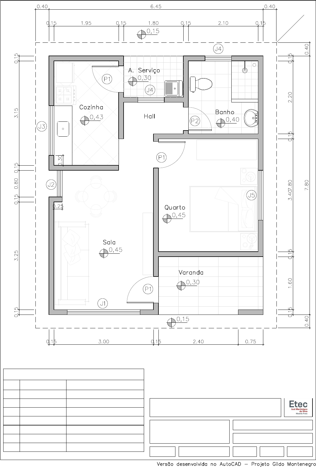 Planta baixa esc. 1:50 ESQUADRIAS LxAxP Tipo P1 0.80X2.10 Abrir P2 0.70X2.10 Abrir J1 2.20X1.10X1.00 Correr 3 folhas J2 0.80X0.20X1.90 Fixa J3 1.50X1.10,1.00 Correr 2 folhas J4 0.80X0.60X1.70 Basculante J5 1.50X1.10X1.00 Veneziana 1,95 3 , 1 5 1,8 0 , 9 5 1 , 2 5 1,8 2,1 2 , 2 1 , 1 5 0,8 3 , 4 3 2,75 3 3 , 2 5 4 , 2 1 , 6 3,15 Curso Técnico em Edificações Disciplina: Aluno Turma: Data: Esc. Folha: Assunto: Professores Desenho desenvolvido por: Joseane Ipolito Planta padrão hatch solid Simples com cotas 1:50 01 AutoCAD SHX Text Varanda AutoCAD SHX Text Quarto AutoCAD SHX Text Sala AutoCAD SHX Text Cozinha AutoCAD SHX Text Hall AutoCAD SHX Text Banho AutoCAD SHX Text A. Serviço AutoCAD SHX Text P1 AutoCAD SHX Text P2 AutoCAD SHX Text P1 AutoCAD SHX Text P1 AutoCAD SHX Text J1 AutoCAD SHX Text J2 AutoCAD SHX Text J3 AutoCAD SHX Text J4 AutoCAD SHX Text J4 AutoCAD SHX Text J5 AutoCAD SHX Text 0,43 AutoCAD SHX Text 0,40 AutoCAD SHX Text 0,30 AutoCAD SHX Text 0,15 AutoCAD SHX Text 0,30 AutoCAD SHX Text 0,45 AutoCAD SHX Text 0,45 AutoCAD SHX Text 0,15 AutoCAD SHX Text Versão desenvolvida no AutoCAD - Projeto Gildo Montenegro Planta baixa esc. 1:50 ESQUADRIAS LxAxP Tipo P1 0.80X2.10 Abrir P2 0.70X2.10 Abrir J1 2.20X1.10X1.00 Correr 3 folhas J2 0.80X0.20X1.90 Fixa J3 1.50X1.10,1.00 Correr 2 folhas J4 0.80X0.60X1.70 Basculante J5 1.50X1.10X1.00 Veneziana 1,95 3 , 1 5 1,8 0 , 9 5 1 , 2 5 1,8 2,1 2 , 2 1 , 1 5 0,8 3 , 4 3 2,75 3 3 , 2 5 4 , 2 1 , 6 3,15 Curso Técnico em Edificações Disciplina: Aluno Turma: Data: Esc. Folha: Assunto: Professores Desenho desenvolvido por: Joseane Ipolito Planta baixa Cotas internas 1:50 02 AutoCAD SHX Text Varanda AutoCAD SHX Text Quarto AutoCAD SHX Text Sala AutoCAD SHX Text Cozinha AutoCAD SHX Text Hall AutoCAD SHX Text Banho AutoCAD SHX Text A. Serviço AutoCAD SHX Text P1 AutoCAD SHX Text P2 AutoCAD SHX Text P1 AutoCAD SHX Text P1 AutoCAD SHX Text J1 AutoCAD SHX Text J2 AutoCAD SHX Text J3 AutoCAD SHX Text J4 AutoCAD SHX Text J4 AutoCAD SHX Text J5 AutoCAD SHX Text 0,43 AutoCAD SHX Text 0,40 AutoCAD SHX Text 0,30 AutoCAD SHX Text 0,30 AutoCAD SHX Text 0,45 AutoCAD SHX Text 0,45 AutoCAD SHX Text 0,15 AutoCAD SHX Text Versão desenvolvida no AutoCAD - Projeto Gildo Montenegro ESQUADRIAS LxAxP Tipo P1 0.80X2.10 Abrir P2 0.70X2.10 Abrir J1 2.20X1.10X1.00 Correr 3 folhas J2 0.80X0.20X1.90 Fixa J3 1.50X1.10,1.00 Correr 2 folhas J4 0.80X0.60X1.70 Basculante J5 1.50X1.10X1.00 Veneziana A A B B Curso Técnico em Edificações Disciplina: Aluno Turma: Data: Esc. Folha: Assunto: Professores Desenho desenvolvido por: Joseane Ipolito Planta baixa Padrão mais detalhado 1:50 03 AutoCAD SHX Text Planta baixa esc. 1:50 AutoCAD SHX Text Varanda AutoCAD SHX Text Quarto AutoCAD SHX Text Sala AutoCAD SHX Text Cozinha AutoCAD SHX Text Hall AutoCAD SHX Text Banho AutoCAD SHX Text A. Serviço AutoCAD SHX Text P1 AutoCAD SHX Text P2 AutoCAD SHX Text P1 AutoCAD SHX Text P1 AutoCAD SHX Text J1 AutoCAD SHX Text J2 AutoCAD SHX Text J3 AutoCAD SHX Text J4 AutoCAD SHX Text J4 AutoCAD SHX Text J5 AutoCAD SHX Text 0,45 AutoCAD SHX Text 0,40 AutoCAD SHX Text 0,30 AutoCAD SHX Text 0,15 AutoCAD SHX Text 0,30 AutoCAD SHX Text 0,45 AutoCAD SHX Text 0,45 AutoCAD SHX Text 0,15 AutoCAD SHX Text Versão desenvolvida no AutoCAD - Projeto Gildo Montenegro CORTE AA ESQUADRIAS LxAxP Tipo P1 0.80X2.10 Abrir P2 0.70X2.10 Abrir J1 2.20X1.10X1.00 Correr 3 folhas J2 0.80X0.20X1.90 Fixa J3 1.50X1.10,1.00 Correr 2 folhas J4 0.80X0.60X1.70 Basculante J5 1.50X1.10X1.00 Veneziana A A Planta baixa sem esc. Curso Técnico em Edificações Disciplina: Aluno Turma: Data: Esc. Folha: Assunto: Professores Desenho desenvolvido por: Joseane Ipolito Corte AA Transversal 1:50 04 AutoCAD SHX Text ESC. 1: AutoCAD SHX Text 50 AutoCAD SHX Text i=50% AutoCAD SHX Text 0,15 AutoCAD SHX Text 0,45 AutoCAD SHX Text 0,40 AutoCAD SHX Text Versão desenvolvida no AutoCAD - Projeto Gildo Montenegro CORTE BB B B Planta baixa sem esc. Curso Técnico em Edificações Disciplina: Aluno Turma: Data: Esc. Folha: Assunto: Professores Desenho desenvolvido por: Joseane Ipolito Corte BB Longitudinal 1:50 05 AutoCAD SHX Text ESC. 1: AutoCAD SHX Text 50 AutoCAD SHX Text 0,40 AutoCAD SHX Text 0,45 AutoCAD SHX Text 0,30 AutoCAD SHX Text 0,15 AutoCAD SHX Text 0,15 AutoCAD SHX Text Versão desenvolvida no AutoCAD - Projeto Gildo Montenegro FACHADA FRONTAL Curso Técnico em Edificações Disciplina: Aluno Turma: Data: Esc. Folha: Assunto: Professores Desenho desenvolvido por: Joseane Ipolito Fachada 1:50 06 AutoCAD SHX Text ESC. 1: AutoCAD SHX Text 50 AutoCAD SHX Text Versão desenvolvida no AutoCAD - Projeto Gildo Montenegro FACHADA LATERAL Curso Técnico em Edificações Disciplina: Aluno Turma: Data: Esc. Folha: Assunto: Professores Desenho desenvolvido por: Joseane Ipolito Fachada Lateral 1:50 07 AutoCAD SHX Text ESC. 1: AutoCAD SHX Text 50 AutoCAD SHX Text Versão desenvolvida no AutoCAD - Projeto Gildo Montenegro G u i a S a r j e t a Curso Técnico em Edificações Disciplina: Aluno Turma: Data: Esc. Folha: Assunto: Professores Desenho desenvolvido por: Joseane Ipolito Implantação 1:50 08 AutoCAD SHX Text Versão desenvolvida no AutoCAD - Projeto Gildo Montenegro ESQUADRIAS LxAxP Tipo P1 0.80X2.10 Abrir P2 0.70X2.10 Abrir J1 2.20X1.10X1.00 Correr 3 folhas J2 0.80X0.20X1.90 Fixa J3 1.50X1.10,1.00 Correr 2 folhas J4 0.80X0.60X1.70 Basculante J5 1.50X1.10X1.00 Veneziana A A B B 1,95 3 , 1 5 1,8 0 , 9 5 1 , 2 5 1,8 2,1 2 , 2 3 , 4 3 3 3 , 2 5 4 , 2 2,75 1 , 6 3,15 Curso Técnico em Edificações Disciplina: Aluno Turma: Data: Esc. Folha: Assunto: Professores Desenho desenvolvido por: Joseane Ipolito Plantas baixas em duas escalas Folha A3 ind AutoCAD SHX Text Planta baixa esc.1:50 AutoCAD SHX Text Varanda AutoCAD SHX Text Quarto AutoCAD SHX Text Sala AutoCAD SHX Text Cozinha AutoCAD SHX Text Hall AutoCAD SHX Text Banho AutoCAD SHX Text A. Serviço AutoCAD SHX Text P1 AutoCAD SHX Text P2 AutoCAD SHX Text P1 AutoCAD SHX Text P1 AutoCAD SHX Text 