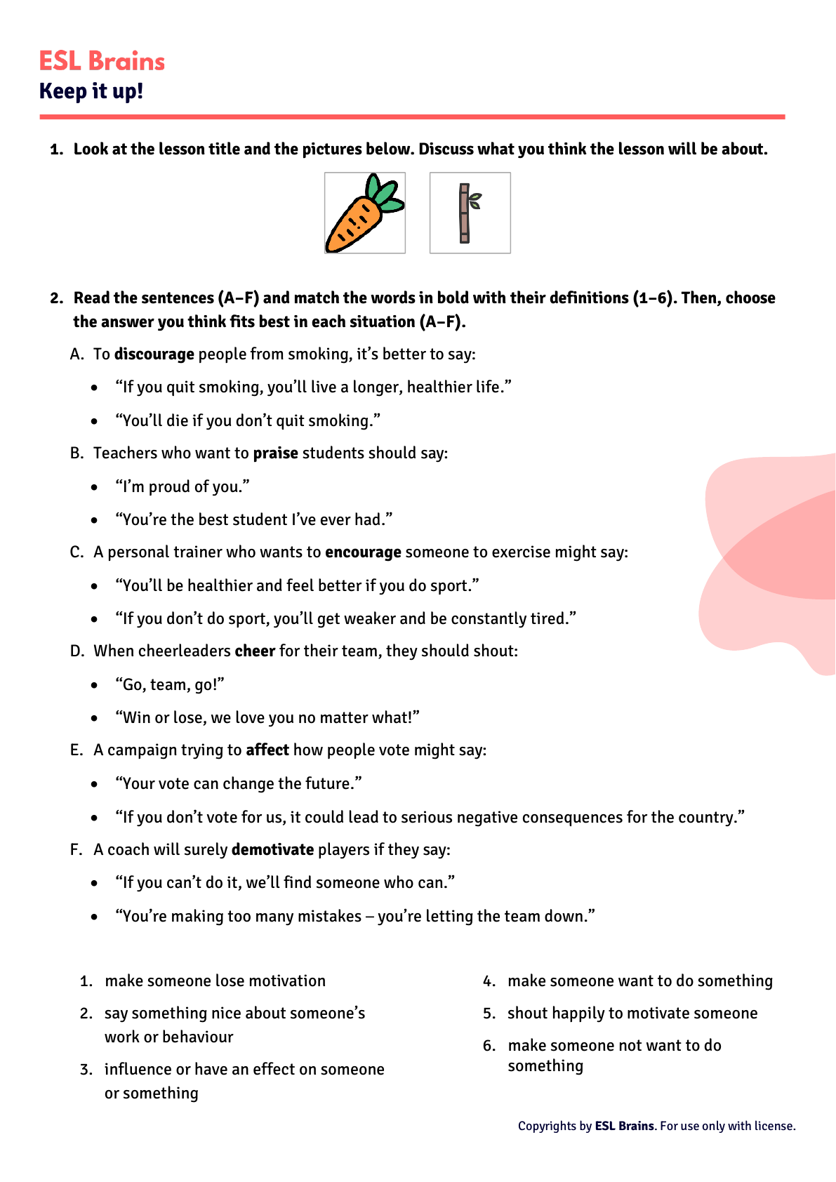 Copyrights by ESL Brains. For use only with license. Keep it up! 1. Look at the lesson title and the pictures below. Discuss what you think the lesson will be about. 2. Read the sentences (A–F) and match the words in bold with their definitions (1–6). Then, choose the answer you think fits best in each situation (A–F). A. To discourage people from smoking, it’s better to say: • “If you quit smoking, you’ll live a longer, healthier life.” • “You’ll die if you don’t quit smoking.” B. Teachers who want to praise students should say: • “I’m proud of you.” • “You’re the best student I’ve ever had.” C. A personal trainer who wants to encourage someone to exercise might say: • “You’ll be healthier and feel better if you do sport.” • “If you don’t do sport, you’ll get weaker and be constantly tired.” D. When cheerleaders cheer for their team, they should shout: • “Go, team, go!” • “Win or lose, we love you no matter what!” E. A campaign trying to affect how people vote might say: • “Your vote can change the future.” • “If you don’t vote for us, it could lead to serious negative consequences for the country.” F. A coach will surely demotivate players if they say: • “If you can’t do it, we’ll find someone who can.” • “You’re making too many mistakes – you’re letting the team down.” 1. make someone lose motivation 2. say something nice about someone’s work or behaviour 3. influence or have an effect on someone or something 4. make someone want to do something 5. shout happily to motivate someone 6. make someone not want to do something Licensed to Anna Beatriz Fernandes (142631) Copyrights by ESL Brains. For use only with license. Keep it up! 3. Read the definition in the box and discuss the questions. • What do you think the difference is between positive and negative reinforcement? • Which type of reinforcement (positive or negative) do you think works better for you? Why? • How might getting too much negative reinforcement affect people? • In your culture, is positive reinforcement more common than negative reinforcement? Can you give some examples? 4. Put the letters in bold in the correct order to make words associated with motivation. A. If you psarie someone too often, they may become less motivated. B. Not making progress can edoitavtem me. C. Negative comments always cfafte a person’s confidence in a bad way. D. When I fail at something, it will egrcudasoi me and make me want to give up. E. It’s more effective to rgeuceoan people to do their best rather than compare them with others. F. I try harder if others ecehr for me. 5. Discuss the statements from ex. 4. Say if you agree or disagree with each one and explain your choices. 6. Read the text below and answer the questions. Then, watch the first part of a video [https://youtu.be/kO1kgl0p-Hw] (to 01:17) and check your answers. The video is about a social experiment. In the experiment, a woman tried scoring ten basketball shots but she missed them all. Then, she was blindfolded and tried scoring ten shots again, but this time a crowd of people cheered for her and made her believe she scored the ten shots. Now she is going to try scoring ten shots without a blindfold again. • Do you think the woman will do better or worse this time? Why do you think so? • How many shots out of ten will she score? reinforcement: a way of influencing someone’s behaviour through rewards and punishments blindfold: cover someone’s eyes with a piece of cloth so they cannot see Licensed to Anna Beatriz Fernandes (142631) https://youtu.be/kO1kgl0p-Hw Copyrights by ESL Brains. For use only with license. Keep it up! 7. Watch the rest of the video (from 01:18) and answer the questions. A. How many shots did Josh make when the crowd wasn’t there? B. What did the crowd do when Josh missed the shots blindfolded? C. How did Josh do after they took his blindfold off? 8. Discuss the questions. • Were you surprised by what you saw in the video? • Have you ever been in a situation when someone cheered for you? Was it motivating? • Would you like to take part in the experiment like the one in the video? • How do you stay motivated when you’re getting negative reinforcement, e.g. someone is criticizing you? 9. Read the situations below and answer the questions. • Do you think giving Maya a reward would help? If so, what kind of reward should she get and when should she get it? • Should Maya stop learning English or keep going and believe she will improve soon? • Do you think a clear goal, like passing an exam or visiting an English-speaking country, would motivate Maya more? Why/Why not? • Should Anna praise herself when she finishes a difficult task? Why/Why not? • Is punishment (e.g. taking away a phone or video games) a good way to motivate teenagers like Anna? Why/Why not? • Can a lack of support from teachers or parents discourage Anna? Anna wants to improve her grades at school. She studies hard but still gets bad marks. She feels tired and has lost motivation. Maya has been studying English for years but she feels like she’s not making progress. Licensed to Anna Beatriz Fernandes (142631) https://youtu.be/kO1kgl0p-Hw%20&t=77 Copyrights by ESL Brains. For use only with license. Keep it up! • What can Tom’s friends or family say to him to encourage him to keep trying? • How might Tom’s negative mood affect his ability to lose weight? • Do you think comparing himself to others will motivate or demotivate Tom? Why? Tom wants to lose weight. He started exercising and eating healthily. But after one month it turned out that he didn’t lose any weight – in fact he gained weight instead. Now, he wants to give up. Licensed to Anna Beatriz Fernandes (142631)