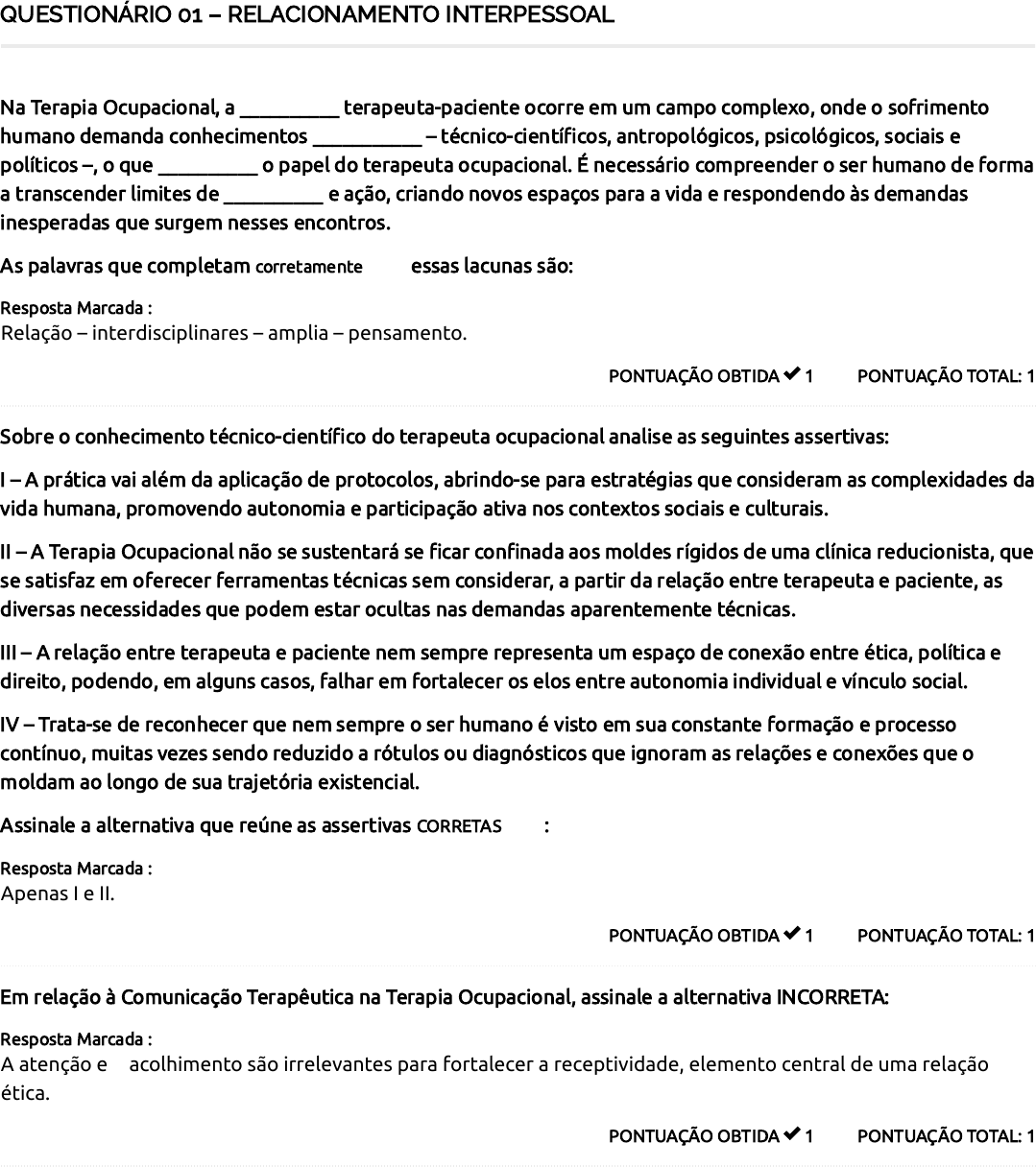QUESTIONÁRIO 01 – RELACIONAMENTO INTERPESSOAL PONTUAÇÃO TOTAL: 1PONTUAÇÃO OBTIDA 1 Na Terapia Ocupacional, a __________ terapeuta-paciente ocorre em um campo complexo, onde o sofrimento humano demanda conhecimentos ___________ – técnico-científicos, antropológicos, psicológicos, sociais e políticos –, o que __________ o papel do terapeuta ocupacional. É necessário compreender o ser humano de forma a transcender limites de __________ e ação, criando novos espaços para a vida e respondendo às demandas inesperadas que surgem nesses encontros. As palavras que completam corretamente essas lacunas são: Resposta Marcada : Relação – interdisciplinares – amplia – pensamento. PONTUAÇÃO TOTAL: 1PONTUAÇÃO OBTIDA 1 Sobre o conhecimento técnico-científico do terapeuta ocupacional analise as seguintes assertivas: I – A prática vai além da aplicação de protocolos, abrindo-se para estratégias que consideram as complexidades da vida humana, promovendo autonomia e participação ativa nos contextos sociais e culturais. II – A Terapia Ocupacional não se sustentará se ficar confinada aos moldes rígidos de uma clínica reducionista, que se satisfaz em oferecer ferramentas técnicas sem considerar, a partir da relação entre terapeuta e paciente, as diversas necessidades que podem estar ocultas nas demandas aparentemente técnicas. III – A relação entre terapeuta e paciente nem sempre representa um espaço de conexão entre ética, política e direito, podendo, em alguns casos, falhar em fortalecer os elos entre autonomia individual e vínculo social. IV – Trata-se de reconhecer que nem sempre o ser humano é visto em sua constante formação e processo contínuo, muitas vezes sendo reduzido a rótulos ou diagnósticos que ignoram as relações e conexões que o moldam ao longo de sua trajetória existencial. Assinale a alternativa que reúne as assertivas CORRETAS : Resposta Marcada : Apenas I e II. PONTUAÇÃO TOTAL: 1PONTUAÇÃO OBTIDA 1 Em relação à Comunicação Terapêutica na Terapia Ocupacional, assinale a alternativa INCORRETA: Resposta Marcada : A atenção e o acolhimento são irrelevantes para fortalecer a receptividade, elemento central de uma relação ética. 4 / 5 PONTUAÇÃO TOTAL: 1PONTUAÇÃO OBTIDA 0 Sobre a relação entre terapeuta e paciente na Terapia Ocupacional, marque V para as alternativas verdadeiras e F para as falsas: ( ) A atenção e o acolhimento evocam a imagem do terapeuta como uma porta, que se abre para estabelecer uma forma de comunicação, escuta e ação no relacionamento com o outro. ( ) Essa porta aberta simboliza a ausência de mediação do terapeuta ocupacional entre a pessoa e um conjunto de recursos técnico-científicos, sociais e ambientais. ( ) A relação entre terapeuta e paciente pode, assim, ser vista como um dispositivo que abrange diversas questões – filosóficas, ético-políticas, sociais e ambientais. ( ) A dinâmica desse território não gera uma nova temporalidade compartilhada entre terapeuta e paciente. A sequência CORRETA é: Resposta Marcada : F, V, F, V. PONTUAÇÃO TOTAL: 1PONTUAÇÃO OBTIDA 1 De acordo com a investigação das histórias de vida na Terapia Ocupacional, marque a opção CORRETA : Resposta Marcada : Investigar a história de vida do paciente proporcionará uma compreensão de sua existência dentro de um contexto social, cultural e histórico específico. A narrativa da vida de um indivíduo é uma construção da sua identidade, na qual ele expressa quem é e como tem vivido. Total de Pontos