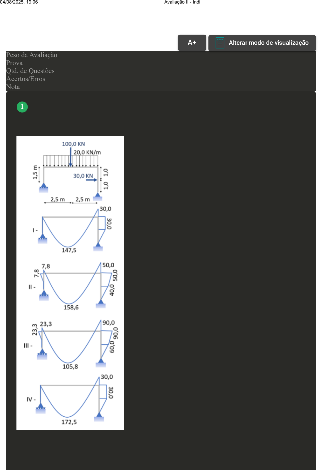 Prova Impressa GABARITO | Avaliação II - Individual (Cod.:1527327) Peso da Avaliação 2,00 Prova 103033100 Qtd. de Questões 10 Acertos/Erros 10/0 Nota 10,00 O momento fletor representa a soma algébrica dos momentos relativos à seção YX, contidos no eixo da peça, gerados por cargas aplicadas transversalmente ao eixo longitudinal. Produzindo esforço que tende a curvar o eixo longitudinal, provocando tensões normais de tração e compressão na estrutura. Para o pórtico a seguir, verifique qual desenho corresponde ao diagrama de momento fletor: A Diagrama I. B Diagrama II. VOLTAR A+ Alterar modo de visualização 1 04/08/2025, 19:06 Avaliação II - Individual about:blank 1/7 C Diagrama III. D Diagrama IV. Uma viga biapoiada, com 20,0 metros de vão entre eixo de apoios, está submetida a um carregamento vertical distribuído em toda a sua extensão, cujo valor é de Q = 25 KN.m. A viga também recebe uma carga concentrada de 10 KN a uma distância de 7,0 metros do apoio esquerdo. Foi denominado o apoio esquerdo de A e o apoio direito de B. Tendo em vista a descrição da viga, analise as sentenças a seguir: I- A reação de apoio vertical em A possui valor de 270,0 KN. II- O momento máximo da viga possui valor de 1285,2 KN.m. III- No local onde a viga recebe a carga concentrada de 10KN, o diagrama de esforço cortante apresenta uma descontinuidade. Assinale a alternativa CORRETA: A Somente a sentença III está correta. B Somente a sentença II está correta. C As sentenças I e II estão corretas. D As sentenças II e III estão corretas. Esforço cortante, força cortante ou força de cisalhamento é a força interna desenvolvida em membros estruturais que atua tangencialmente sobre a área de seção transversal de uma peça (HIBBELER, 2010). Para a viga a seguir, verifique qual desenho corresponde ao diagrama de esforço CORTANTE da viga: 2 3 04/08/2025, 19:06 Avaliação II - Individual about:blank 2/7 FONTE: HIBBELER, R. C. Resistência dos materiais. São Paulo: Pearson Educação, 2010. A Diagrama II. B Diagrama IV. C Diagrama III. D Diagrama I. Em uma estrutura denominam-se as ações sobre a estrutura como cargas atuantes e as reações de apoio como cargas resistentes. Em atenção à viga biapoiada da figura anexa, considerando as distâncias "a" e "b" diferentes, analise as sentenças a seguir: I- A reação de apoio VA e igual a VB, com valor de [P / 2]. II- O momento fletor no ponto C equivale a [(P*a*b) / L]. III- O esforço cortante na metade da distância "b" equivale a [(P*b - P*L) / L]. 4 04/08/2025, 19:06 Avaliação II - Individual about:blank 3/7 Assinale a alternativa CORRETA: A As sentenças II e III estão corretas. B As sentenças I e II estão corretas. C Somente a sentença III está correta. D Somente a sentença II está correta. A mecânica dos corpos rígidos divide-se em duas áreas: estática e dinâmica. A estática trata do equilíbrio dos corpos, ou seja, aqueles que estão em repouso ou em movimento, com velocidade constante; enquanto a dinâmica preocupa-se com o movimento acelerado dos corpos (HIBBELER, 2010). Sobre o exposto, classifique V para as sentenças verdadeiras e F para as falsas: ( ) O momento em um determinado ponto P pode ser calculado se conhecermos a área do diagrama de esforços cortantes no trecho considerado. ( ) A ligação entre as barras dos pórticos é realizada através de engates ou rótulas internas, resultando comportamentos iguais na estrutura. ( ) O momento fletor e o esforço cortante nos cabos são nulos, estes apresentando apenas esforços de tração. ( ) Um carregamento distribuído em uma barra inclinada, atuando perpendicularmente a ela, apresentará os mesmos esforços internos do que um carregamento distribuído no sentido vertical. Assinale a alternativa que apresenta a sequência CORRETA: FONTE: HIBBELER, R. C. Resistência dos materiais. São Paulo: Pearson Educação, 2010. A F - V - F - V. B F - F - V - F. C V - V - V - F. D V - F - V - F. Os esforços que uma estrutura está submetida podem ser descritos através de expressões analíticas. Em atenção à viga anexa, classifique V para as sentenças verdadeiras e F para as falsas: ( ) A viga é simétrica, desta forma, as reações de apoio possuem o mesmo valor e sentido. ( ) O esforço normal ao longo da viga é nulo, ou seja, em qualquer ponto N(x) = 0. ( ) A expressão analítica que representa o esforço cortante no tramo B-C é Q(x) = 200 - 30.x kN; 5 6 04/08/2025, 19:06 Avaliação II - Individual about:blank 4/7 considerando x=0 em B. ( ) A expressão analítica que representa o momento fletor no tramo B-C é M(x) = -15.x² + 200.x + 200 KNm; considerando x=0 em B. Assinale a alternativa que apresenta a sequência CORRETA: A V - F - V - V. B F - V - F - F. C V - V - V - F. D V - V - V - V. Considere uma viga inclinada, submetida a um carregamento distribuído de 40 kN/m, perpendicular à viga. Em atenção à estrutura descrita, classifique V para as sentenças verdadeiras e F para as falsas: ( ) A viga possui inclinação de 30 graus com a horizontal. ( ) O comprimento da viga é de 7,62 metros. ( ) A reação de apoio vertical em "A" é de 165,7 kN. ( ) A reação de apoio horizontal em "B" é de 130 kN. Assinale a alternativa que apresenta a sequência CORRETA: A F - V - V - V. B F - V - V - F. C V - F - V - F. D F - V - F - F. 7 04/08/2025, 19:06 Avaliação II - Individual about:blank 5/7 Pórticos são estruturas lineares constituídas por barras retas ligadas entre si. Para o pórtico da figura anexa, analise as sentenças a seguir: I- O diagrama de esforço cortante entre os pontos "C" e "D" é representado por uma reta inclinada. II- O esforço cortante na rótula em "E" é nulo. III- O momento fletor no ponto "C" equivale a 200 kN.m. IV- O diagrama de momento fletor em "G" apresenta uma descontinuidade de 100 kN.m. Assinale a alternativa CORRETA: A As sentenças I, III e IV estão corretas. B As sentenças II e IV estão c