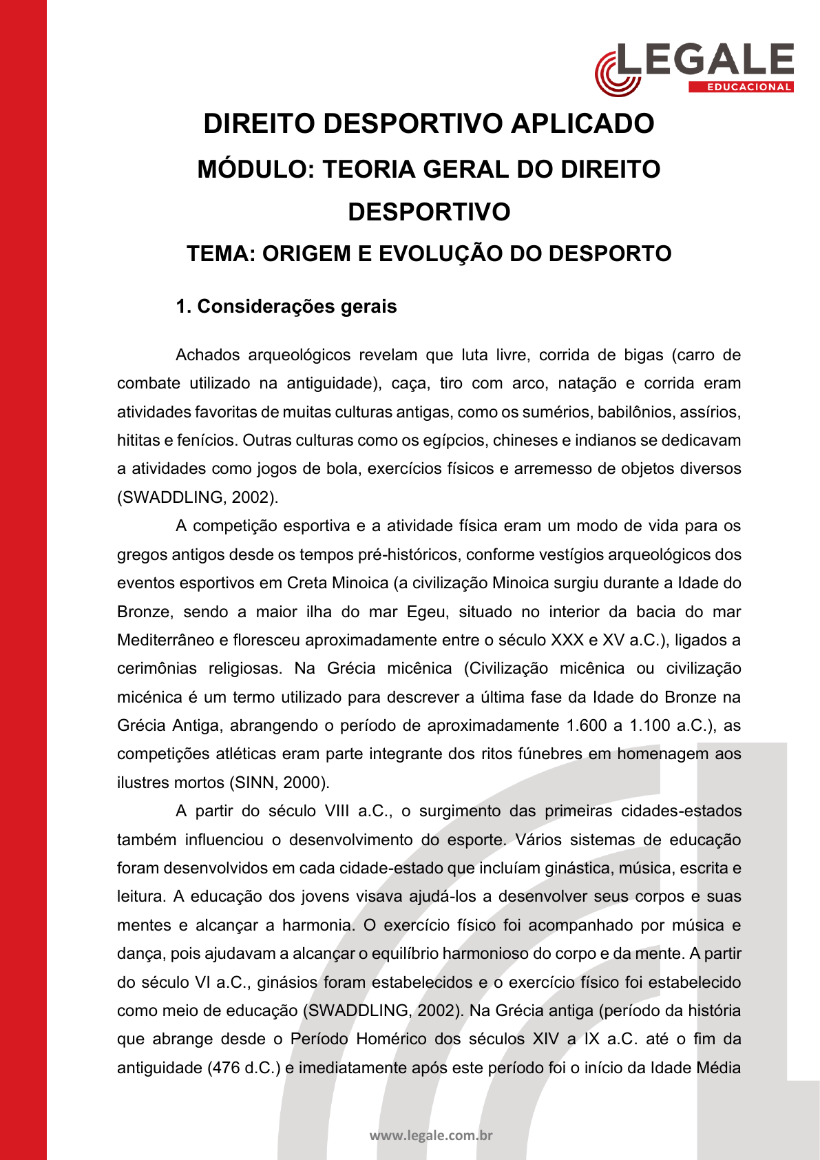 www.legale.com.br DIREITO DESPORTIVO APLICADO MÓDULO: TEORIA GERAL DO DIREITO DESPORTIVO TEMA: ORIGEM E EVOLUÇÃO DO DESPORTO 1. Considerações gerais Achados arqueológicos revelam que luta livre, corrida de bigas (carro de combate utilizado na antiguidade), caça, tiro com arco, natação e corrida eram atividades favoritas de muitas culturas antigas, como os sumérios, babilônios, assírios, hititas e fenícios. Outras culturas como os egípcios, chineses e indianos se dedicavam a atividades como jogos de bola, exercícios físicos e arremesso de objetos diversos (SWADDLING, 2002). A competição esportiva e a atividade física eram um modo de vida para os gregos antigos desde os tempos pré-históricos, conforme vestígios arqueológicos dos eventos esportivos em Creta Minoica (a civilização Minoica surgiu durante a Idade do Bronze, sendo a maior ilha do mar Egeu, situado no interior da bacia do mar Mediterrâneo e floresceu aproximadamente entre o século XXX e XV a.C.), ligados a cerimônias religiosas. Na Grécia micênica (Civilização micênica ou civilização micénica é um termo utilizado para descrever a última fase da Idade do Bronze na Grécia Antiga, abrangendo o período de aproximadamente 1.600 a 1.100 a.C.), as competições atléticas eram parte integrante dos ritos fúnebres em homenagem aos ilustres mortos (SINN, 2000). A partir do século VIII a.C., o surgimento das primeiras cidades-estados também influenciou o desenvolvimento do esporte. Vários sistemas de educação foram desenvolvidos em cada cidade-estado que incluíam ginástica, música, escrita e leitura. A educação dos jovens visava ajudá-los a desenvolver seus corpos e suas mentes e alcançar a harmonia. O exercício físico foi acompanhado por música e dança, pois ajudavam a alcançar o equilíbrio harmonioso do corpo e da mente. A partir do século VI a.C., ginásios foram estabelecidos e o exercício físico foi estabelecido como meio de educação (SWADDLING, 2002). Na Grécia antiga (período da história que abrange desde o Período Homérico dos séculos XIV a IX a.C. até o fim da antiguidade (476 d.C.) e imediatamente após este período foi o início da Idade Média - 63309025500 www.legale.com.br e da era bizantina) não havia cidade sem ginásio, ou seja, um espaço exclusivamente dedicado ao exercício físico dos cidadãos e um povoado sem ginásio (SINN, 2000). O exercício físico foi o elemento mais importante na educação da juventude de Esparta (Esparta ou Lacedemônia ou Lacedemónia foi uma relevante cidade da Grécia antiga em torno do século X a.C.). Seu sistema dava mais ênfase ao fortalecimento do corpo e menos ao cultivo do espírito. Espartanos de ambos os sexos se exercitavam diariamente para manter seus corpos fortes e saudáveis. Várias corridas, passeios a cavalo, natação, bem como jogos de bola, estiveram na programação diária (SINN, 2000). O programa de exercícios físicos tornou-se mais difícil com a idade avançada e incluía corrida, luta livre, dardo, arremesso de objetos diversos, pancrácio (Arte marcial da Grécia antiga e esporte gladiatório), caça de animais silvestres, equitação, boxe e tiro com arco (SWADDLING, 2002). O sistema educacional da juventude de Esparta foi criticado por grandes filósofos da antiguidade, como Platão e Aristóteles, por causa da unilateralidade que o caracterizava, com sua orientação exclusiva para o treinamento físico e a preparação militar. No entanto, apesar das desvantagens do sistema de educação que os espartanos implementaram com a dura formação de sua juventude, os mesmos filósofos admitiram a importância desse sistema de educação física, pois conseguiu incutir na juventude grandes virtudes, como a disciplina e bravura (SWADDLING, 2002). Em contraste com Esparta, a educação em Atenas significava o desenvolvimento harmonioso do corpo e do espírito. As letras, a música e a ginástica eram os elementos mais essenciais da educação da juventude ateniense. Cada uma das disciplinas supracitadas era ministrada por um professor especial. Embora a educação não fosse obrigatória e nem pública, o Estado supervisionava e regulava o funcionamento adequado de escolas individuais de educação em Atenas. O processo foi dirigido a todos os cidadãos atenienses do sexo masculino, mas não a meninas e escravos (SWADDLING, 2002). Deste modo, os pais buscavam o desenvolvimento harmonioso de seus filhos, enfatizando a música e a ginástica. Assim, desde muito cedo os atenienses enviavam seus filhos à Pedótriba (professor de ginástica para crianças) e Palaestra (local de ensino de luta corporal que funcionava como escola de treinamento e também como lugar de convívio social masculino, onde conversas sobre literatura, filosofia e música), para aprender as técnicas de luta e fortalecer seus corpos. Mais tarde, os - 63309025500 www.legale.com.br adolescentes se exercitavam fisicamente nos ginásios públicos da cidade, onde se envolveram em luta livre, pancrácio, boxe, corrida, salto, lançamento de dardo e disco e várias outras atividades e jogos (SINN, 2000). Os jogos sagrados pan-helênicos (termo coletivo utilizado para designar quatro festivais separados que se realizavam periodicamente na Grécia Antiga, sendo eles: Jogos Olímpicos, em homenagem à Zeus; Jogos Píticos, em homenagem à Apolo; Jogos Nemeus, em homenagem à Zeus e Herácles; e Jogos Ístmicos, em homenagem à Poseidon) foram uma das criações da antiguidade (os registos mais antigos que se referem os Jogos Olímpicos datam de 776 a.C., mas há indícios de que a sua origem remonte alguns séculos antes e os demais jogos foram instituídos no século VI a.C.) que mais ajudaram na coesão e comunicação entre os gregos. Esses jogos indicaram a oportunidade de lembrar suas características comuns (língua, religião, origem) e esquecer por um tempo o que os dividia (SINN, 2000). Gregos não apenas da Grécia continen