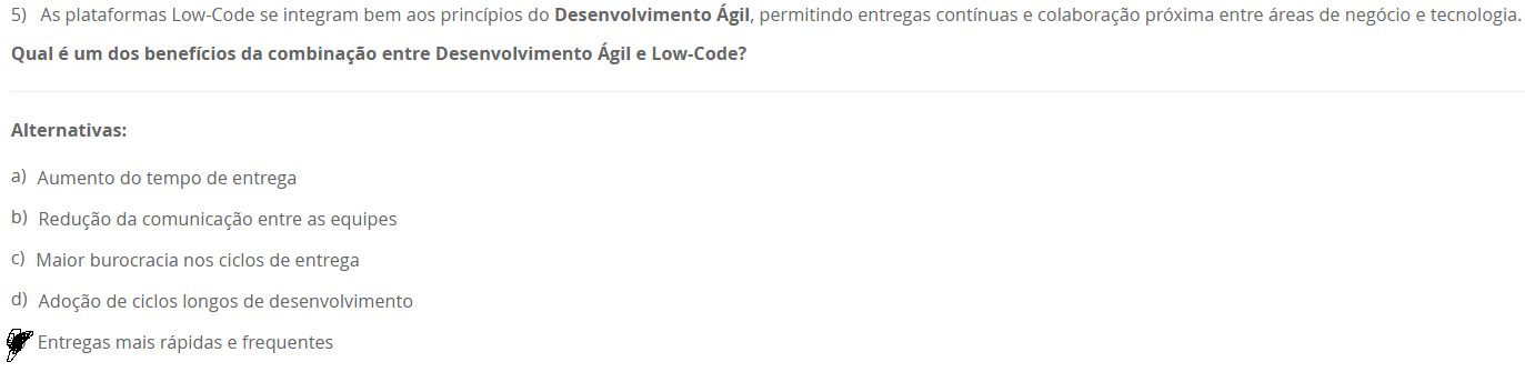 5) As plataformas Low-Code se integram bem aos princípios do Ágil, permitindo entregas contínuas e colaboração próxima entre áreas de negócio e tecnologia. Qual é um dos benefícios da combinação entre Desenvolvimento Ágil e Low-Code? Alternativas: a) Aumento do tempo de entrega b) Redução da comunicação entre as equipes c) Maior burocracia nos ciclos de entrega d) Adoção de ciclos longos de desenvolvimento Entregas mais rápidas e frequentes