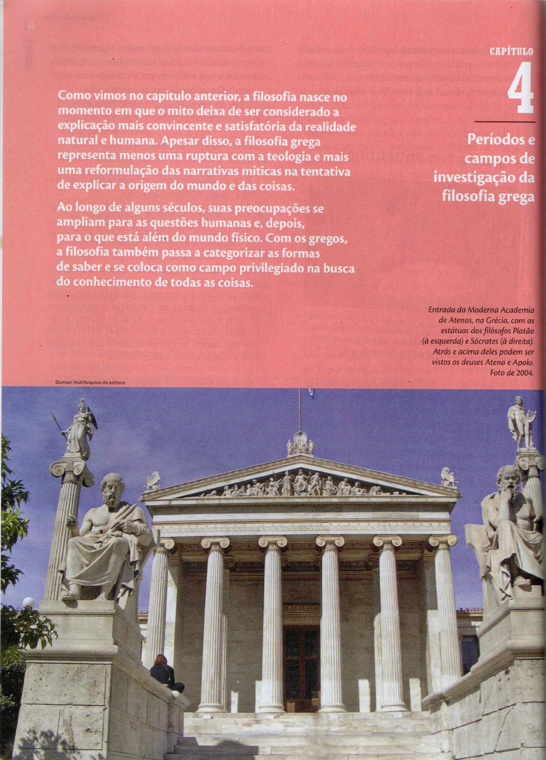 40 CAPÍTULO Como vimos no capítulo anterior, a filosofia nasce no 4 momento em que mito deixa de ser considerado a explicação mais convincente e satisfatória da realidade natural e humana. Apesar disso, a filosofia grega Períodos e representa menos uma ruptura com a teologia e mais campos de uma reformulação das narrativas míticas na tentativa de explicar a origem do mundo e das coisas. investigação da filosofia grega Ao longo de alguns séculos, suas preocupações se ampliam para as questões humanas e, depois, para que está além do mundo físico. Com os gregos, a filosofia também passa a categorizar as formas de saber e se coloca como campo privilegiado na busca do conhecimento de todas as coisas. Entrada da Moderna Academia de Atenas, na Grécia, com as estátuas dos filósofos Platão (à esquerda) e Sócrates (à direita). Atrás e acima deles podem ser vistos deuses Atena e Apolo. Foto de 2004. Duncan Hull/Arquivo da editoraOs PERÍODOS DA FILOSOFIA GREGA PERÍODO PRÉ-SOCRÁTICO OU COSMOLÓGICO Os quatro grandes períodos da filosofia grega, nos quais seu conteúdo se altera e se enriquece, são: A filosofia pré-socrática se desenvolve em cidades 1. Período pré-socrático ou cosmológico, do fim do da Jônia (na hoje chamada Ásia Menor): Mileto, Éfeso, século VII a.C. ao fim do século V a.C., quando a filo- Samos e Clazômena; em cidades da Magna Grécia (sul sofia se ocupa fundamentalmente com a origem do da atual Itália e ilha da Sicília): Crotona, Tarento, Eleia e mundo e as causas das transformações na natureza. Agrigento; e na cidade de Abdera, na Trácia (nordeste 2. Período socrático ou antropológico, do fim do do atual território da Grécia). século V a.C. ao fim do século IV a.C., quando a filo- sofia investiga as questões humanas isto é, a ética, Centros de desenvolvimento da filosofia cosmológica a política e as técnicas e busca compreender qual é 20°L o lugar do homem no mundo. Mar Negro EUROPA 3. Período sistemático, do fim do século IV a.C. ao fim Mar TRÁCIA do século III a.C., quando a filosofia busca reunir e Abdera ÁSIA Tarento sistematizar tudo quanto foi pensado pela cosmolo- Mar 40°N Maps World/Arquivo da editora Mar JONIA ÁSIA MENOR Crotona gia e pelas investigações sobre a ação humana na Tirreno Efeso MAGNA Clazômena Mar Samos Mileto Jônico Atenas ética, na política e nas técnicas. A filosofia se interes- Sicília PELOPONESO Esparta Agrigento Chipre sa em mostrar que tudo pode ser objeto do conheci- Creta N mento filosófico, desde que as leis do pensamento e M de suas demonstrações estejam firmemente estabe- ESCALA L 0 305 610 km lecidas para oferecer critérios da verdade e da ÁFRICA S ciência. Nesse período desenvolvem-se a teoria do Adaptado de: WORLD History Atlas Mapping the Human conhecimento, a psicologia e a lógica. Além disso, Journey. London: Dorling Kindersley, 2005. filósofos procuram encontrar fundamento último Os principais filósofos pré-socráticos foram: de todas as coisas. Essa investigação, séculos mais da Escola Jônica: Tales de Mileto, Anaxímenes de tarde, será designada metafísica. Mileto, Anaximandro de Mileto e Heráclito de Éfeso; 4. Período helenístico ou greco-romano, do fim do da Escola Itálica: Pitágoras de Samos, Filolau de século III a.C. ao século VI d.C. Nesse longo período, Crotona e Árquitas de Tarento; que abrange a época da hegemonia de Roma e do OS da Escola Eleata: Parmênides de Eleia e Zenão de surgimento do cristianismo, a filosofia se ocupa so- Eleia; bretudo com as questões da ética, do conhecimento humano e das relações entre o homem e a natureza, OS da Escola da Pluralidade: Empédocles de Agrigen- to, Leucipo de Abdera e Demócrito de Abdera. e de ambos com Deus. Os dois primeiros períodos da filosofia grega têm Vejamos as principais características da cosmologia: É uma explicação racional e sistemática sobre a ori- como referência filósofo Sócrates de Atenas, donde a divisão em filosofia pré-socrática e socrática. gem, ordem e transformação da natureza, da qual seres humanos fazem parte. Desse modo, ao explicar a natureza, a filosofia também explica a origem e as mudanças dos seres humanos. antropológico Busca princípio natural, eterno e imperecível, gera- Em grego, ântropos quer dizer 'homem'; por isso, dor de todos seres. A cosmologia não admite a período socrático, centrado nas questões humanas, criação do mundo a partir do nada; ela afirma a gera- foi chamado antropológico. ção de todas as coisas por um princípio natural deA filosofia 42 UNIDADE I onde tudo vem e para onde tudo retorna. Esse novo-velho, pequeno-grande, bom-mau, cheio-vazio, princípio é a physis, causa natural contínua e im- um-muitos, vivo-morto, etc., e também no sentido perecível da existência de todos seres e de suas inverso, noite-dia, escuro-claro, frio-quente, muitos- transformações. A physis não pode ser conhecida -um, etc. Essa passagem obedece a leis determinadas pela percepção, pelos sentidos (esses só nos ofere- pela physis. cem as coisas já existentes), mas apenas pelo pensa- Embora todos pré-socráticos afirmassem as mento. Em outras palavras, ela é aquilo que o ideias que acabamos de expor, nem por isso concor- pensamento descobre ao indagar a causa da existên- daram ao determinar que era a physis. Assim, Tales cia e da transformação de todos seres percebidos. dizia que a physis era a água ou úmido; Anaximan- A physis é a natureza em sua totalidade, isto é, enten- dro considerava que era o ilimitado, sem qualidades dida como princípio e causa primordial da existência definidas; Anaxímenes, que era ar ou frio; Pitágo- e das transformações das coisas naturais (os seres ras julgava que era número (entendido como estru- humanos aí incluídos) e como conjunto organiza- tura e relação proporcional entre elementos que do de todos seres naturais ou físicos. compõem as coisas); Her