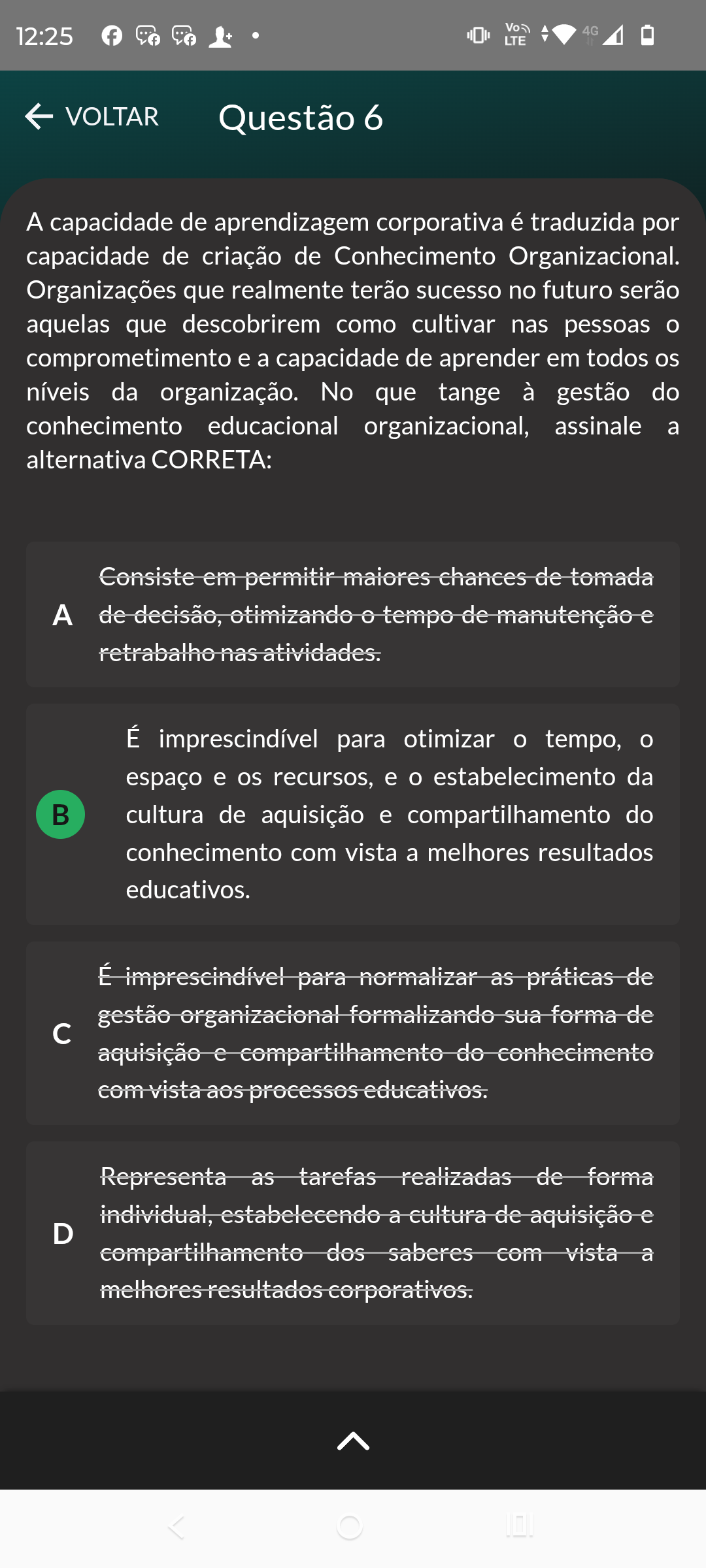 12:25 f I 4G LTE VOLTAR Questão 6 capacidade de aprendizagem corporativa é traduzida por capacidade de criação de Conhecimento Organizacional. Organizações que realmente terão sucesso no futuro serão aquelas que descobrirem como cultivar nas pessoas comprometimento e a capacidade de aprender em todos os níveis da organização. No que tange à gestão do conhecimento educacional organizacional, assinale a alternativa CORRETA: Consiste em permitir maiores chances de tomada de decisão, otimizando tempo de manutenção e retrabalho nas atividades. É imprescindível para otimizar tempo, espaço e os recursos, e estabelecimento da B cultura de aquisição e compartilhamento do conhecimento com vista a melhores resultados educativos. É imprescindível para normalizar as práticas de gestão organizacional formalizando sua forma de c aquisição e compartilhamento do conhecimento com vista aos processos educativos. Representa as tarefas realizadas de forma individual, estabelecendo a cultura de aquisição e D compartilhamento dos saberes com vista a melhores resultados corporativos.
