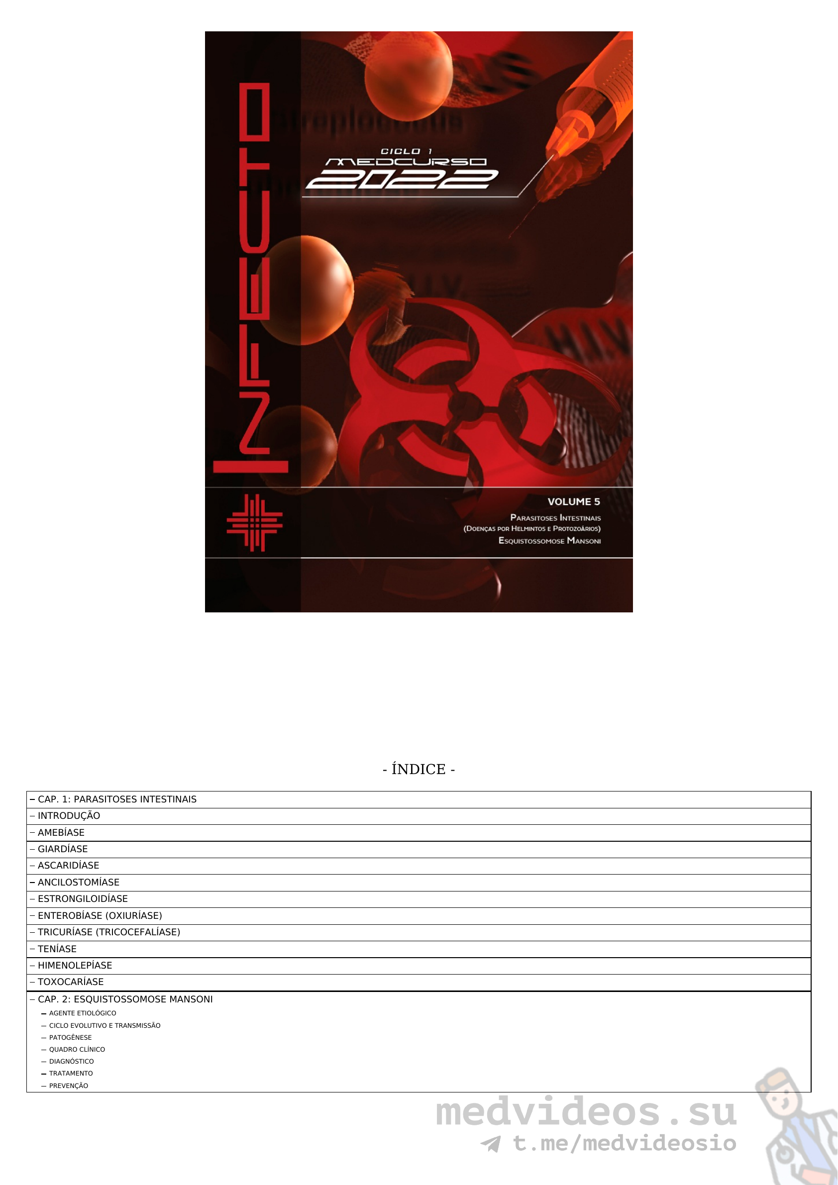 - ÍNDICE - CAP. 1: PARASITOSES INTESTINAIS INTRODUÇÃO AMEBÍASE GIARDÍASE ASCARIDÍASE ANCILOSTOMÍASE ESTRONGILOIDÍASE ENTEROBÍASE (OXIURÍASE) TRICURÍASE (TRICOCEFALÍASE) TENÍASE HIMENOLEPÍASE TOXOCARÍASE CAP. 2: ESQUISTOSSOMOSE MANSONI AGENTE ETIOLÓGICO CICLO EVOLUTIVO E TRANSMISSÃO PATOGÊNESE QUADRO CLÍNICO DIAGNÓSTICO TRATAMENTO PREVENÇÃO Intro_22281 CAP. 1 PARASITOSES INTESTINAIS DOENÇAS POR HELMINTOS E PROTOZOÁRIOS INTRODUÇÃO Neste momento entraremos na área de “Parasitologia”... O termo parasitismo, na verdade, indica a presença de qualquer ser vivo (o parasita) que se instala no interior de outro (o hospedeiro), com isso determinando um prejuízo à saúde deste último. Apesar do parasitismo ocorrer com vírus, bactérias e fungos, a parasitologia estuda basicamente as doenças humanas causadas por protozoários e helmintos (“vermes”). Os protozoários são seres unicelulares, eucarióticos (com membrana nuclear), de tamanho bem superior ao das bactérias e dos fungos – . Podem ser de vida livre (potencialmente independentes do ser humano), comensais (se hospedam no ser humano, sem lhe causar dano) ou parasitas. FIGURA 1 Eles extraem seus nutrientes pela forma osmotrófica (por osmose dos líquidos nutritivos presentes no hospedeiro ou na natureza) ou pela forma fagotrófica (fagocitose e ingestão de partículas alimentares). Podem ser aeróbios (ou oxibióticos), extraindo o O2 diretamente do meio externo, anaeróbios (ou anoxibióticos) ou microaerófilos. A reprodução pode ser tanto pela via assexuada, como observado nas amebas, nas tricomonas e na giárdia, que utilizam a divisão binária (uma célula dá origem a duas células-filhas idênticas), quanto sexuada. Um exemplo da via sexuada é o plasmódio (agente da malária), que apresenta alternância das duas vias. Neste caso, a fase assexuada utiliza uma outra forma de divisão, chamada esquizogonia. A forma sexuada depende da formação de dois gametas, o masculino e o feminino – os dois se juntam para formar o zigoto que evolui para a formação de vários novos protozoários. Os protozoários que parasitam o intestino de maior importância para nós são: Entamoeba histolytica (da classe Rhizopoda), agente da amebíase, e Giardia lamblia (da classe Mastigophora – flagelados), agente da giardíase. Os helmintos são seres pluricelulares, visíveis a olho nu ( ), que possuem órgãos internos de digestão, excreção e reprodução, além de um sistema nervoso e muscular rudimentares. A reprodução é do tipo sexuada, podendo ser do tipo heterofecundação (entre machos e fêmeas) ou autofecundação (em organismos hermafroditas, que ao mesmo tempo possuem órgãos genitais masculinos e femininos). Na maioria das vezes são ovíparos, depositando ovos no meio externo que depois irão se transformar em larvas e, posteriormente, serão maturadas na forma adulta. O ciclo evolutivo dos helmintos parasitários pode incluir apenas um hospedeiro (parasitas monoxenos) ou mais de um hospedeiro (parasitas heteroxenos). Os helmintos são divididos em dois grandes ramos: (1) os platelmintos, ou vermes achatados; e (2) os nematelmintos, ou vermes arredondados. O ramo platelminto inclui as classes Trematoda (Schistosoma mansoni – agente da esquistossomose mansônica, Fasciola hepatica) e Cestoda (Taenia solium, Taenia saginata – agentes da teníase, Equinococcus granulosus, Hymenolepis nana). O ramo nematelminto inclui a importante classe Nematoda (Ascaris lumbricoides – agente da ascaridíase, Strongyloides stercoralis – agente da estrongiloidíase, Ancylostoma duodenale e Necator americanus – agentes da ancilostomíase, Enterobius vermicularis – agente da enterobíase ou oxiuríase, Trichuris trichiura – agente da tricuríase ou tricocefalíase, Wuchereria bancrofti – agente da filariose). Os helmintos que parasitam o intestino de maior importância para nós são os agentes da ascaridíase, estrongiloidíase, ancilostomíase, oxiuríase (enterobíase) e tricuríase (tricocefalíase). Começaremos descrevendo as protozooses intestinais amebíase e giardíase e em seguida estudaremos as helmintoses intestinais ascaridíase, ancilostomíase, estrongiloidíase, oxiuríase (enterobíase), tricuríase (tricocefalíase), teníase e himenolepíase. Ao final, encontraremos ainda um texto sobre toxocaríase (larva migrans visceral e larva migrans ocular). Fig. 1 FIGURA 2 Fig. 2 Video_01_Inf5 AMEBÍASE AGENTE ETIOLÓGICO Entamoeba histolytica. A palavra “histolítica” quer dizer “destruidora de tecidos”. Das espécies de ameba que podem ser encontradas no intestino grosso, apenas a E. histolytica possui potencial patogênico comprovado! Duas espécies morfologicamente idênticas são a Entamoeba dispar e Entamoeba moshkovskii, que não causam doença no homem. A diferenciação com a E. histolytica pode ser feita pela demonstração de diferenças antigênicas e/ou genéticas. Outras espécies podem ser encontradas e também não são patogênicas, por exemplo: Entamoeba coli, Endolimax nana, E. hartmanni, Iodamoeba butschlii e Dientamoeba fragilis. CICLO EVOLUTIVO E TRANSMISSÃO A E. histolytica possui dois estágios evolutivos: cisto (arredondado, tetranucleado) e trofozoíta (pseudópodes, mononucleado, pode conter hemácias fagocitadas em seu interior). Os cistos representam a forma infectante, sendo adquiridos por meio da ingestão de água ou alimentos contaminados por fezes – . A aquisição pela via sexual raramente acontece, através do contato oral-anal. Os cistos sobrevivem no meio ambiente e resistem à acidez gástrica, eclodindo no intestino delgado onde liberam trofozoítas que amadurecerão no cólon. O homem é o principal reservatório. Os trofozoítas podem viver como comensais (sem causar doença), ou podem invadir a parede do cólon (causando colite amebiana). Eventualmente atingem a corrente circulatória, disseminando-se à distância (ex.: abscessos 