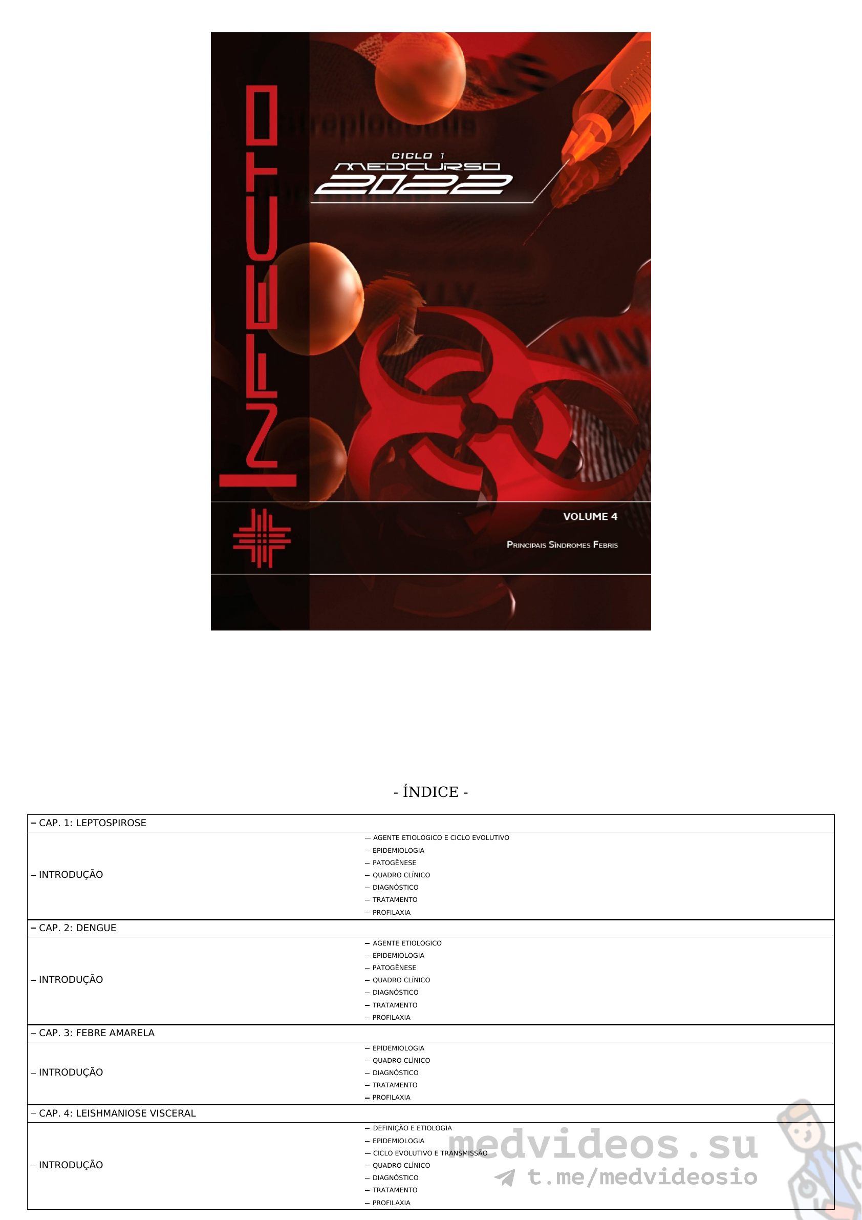 - ÍNDICE - CAP. 1: LEPTOSPIROSE INTRODUÇÃO AGENTE ETIOLÓGICO E CICLO EVOLUTIVO EPIDEMIOLOGIA PATOGÊNESE QUADRO CLÍNICO DIAGNÓSTICO TRATAMENTO PROFILAXIA CAP. 2: DENGUE INTRODUÇÃO AGENTE ETIOLÓGICO EPIDEMIOLOGIA PATOGÊNESE QUADRO CLÍNICO DIAGNÓSTICO TRATAMENTO PROFILAXIA CAP. 3: FEBRE AMARELA INTRODUÇÃO EPIDEMIOLOGIA QUADRO CLÍNICO DIAGNÓSTICO TRATAMENTO PROFILAXIA CAP. 4: LEISHMANIOSE VISCERAL INTRODUÇÃO DEFINIÇÃO E ETIOLOGIA EPIDEMIOLOGIA CICLO EVOLUTIVO E TRANSMISSÃO QUADRO CLÍNICO DIAGNÓSTICO TRATAMENTO PROFILAXIA CAP. 5: MALÁRIA INTRODUÇÃO CICLO EVOLUTIVO DIFERENÇAS ENTRE AS ESPÉCIES DE PLASMÓDIO EPIDEMIOLOGIA – MODOS DE TRANSMISSÃO PATOGÊNESE QUADRO CLÍNICO DIAGNÓSTICO TRATAMENTO PROFILAXIA CAP. 6: EBOLA, CHIKUNGUNYA E ZIKA EBOLA VIROLOGIA RESERVATÓRIO DISSEMINAÇÃO PATOGÊNESE MANIFESTAÇÕES CLÍNICAS LABORATÓRIO HISTÓRIA NATURAL DIAGNÓSTICO TRATAMENTO FATORES PROGNÓSTICOS PREVENÇÃO DA TRANSMISSÃO VACINAÇÃO CHIKUNGUNYA VIROLOGIA EPIDEMIOLOGIA MANIFESTAÇÕES CLÍNICAS LABORATÓRIO DIAGNÓSTICO TRATAMENTO E PREVENÇÃO ZIKA VIROLOGIA E EPIDEMIOLOGIA TRANSMISSÃO MANIFESTAÇÕES CLÍNICAS DIAGNÓSTICO DIFERENCIAL DIAGNÓSTICO TRATAMENTO E PREVENÇÃO APÊNDICE 1: FEBRE TIFOIDE INTRODUÇÃO PATOGÊNESE QUADRO CLÍNICO DIAGNÓSTICO TRATAMENTO PROFILAXIA APÊNDICE 2: COVID-19 INTRODUÇÃO VIROLOGIA VARIANTES EPIDEMIOLOGIA TRANSMISSIBILIDADE IMUNIDADE APRESENTAÇÃO CLÍNICA INFECÇÕES ASSINTOMÁTICAS INFECÇÕES SINTOMÁTICAS EVOLUÇÃO CLÍNICA DIAGNÓSTICO CRITÉRIO LABORATORIAL CRITÉRIO CLÍNICO CRITÉRIO CLÍNICO-EPIDEMIOLÓGICO CRITÉRIO CLÍNICO-IMAGEM TRATAMENTO MEDIDAS TERAPÊUTICAS GERAIS SUPORTE VENTILATÓRIO TRATAMENTO ESPECÍFICO SÍNDROME INFLAMATÓRIA MULTISSISTÊMICA PEDIÁTRICA (SIM-P OU MIS-C) PREVENÇÃO MEDIDAS FARMACOLÓGICAS MEDIDAS NÃO FARMACOLÓGICAS MEDIDAS ADICIONAIS DE CONTROLE DA INFECÇÃO HOSPITALAR VACINAS DECLARAÇÃO DE ÓBITO APÊNDICE 3: MONKEYPOX AGENTE ETIOLÓGICO SUSCEPTIBILIDADE E TRANSMISSÃO MANIFESTAÇÕES CLÍNICAS COMPLICAÇÕES DIAGNÓSTICO TRATAMENTO Intro_22280 CAP. 1 LEPTOSPIROSE Video_02_Inf4 INTRODUÇÃO A leptospirose é uma doença febril aguda causada pela espiroqueta Leptospira interrogans. Esta doença acomete praticamente todos os estados brasileiros, sendo considerada um importante problema de saúde pública. Na maioria das vezes, manifesta-se apenas como uma síndrome febril, muito semelhante à dengue. Porém, num percentual variável de casos, pode se apresentar com uma forma grave e potencialmente fatal – a doença de Weil, caracterizada pela tríade: icterícia, hemorragias e insuficiência renal aguda. Como veremos adiante, os surtos de leptospirose são muito comuns nas enchentes de verão nas zonas urbanas e periurbanas de nosso país. AGENTE ETIOLÓGICO E CICLO EVOLUTIVO As espiroquetas são bactérias, constituindo vários gêneros importantes na medicina, como Treponema (na sífilis), Borrelia (na doença de Lyme) e Leptospira (na leptospirose). Historicamente, o gênero Leptospira foi dividido em duas espécies: L. interrogans e L. biflexa, patogênica e não patogênica, respectivamente. Em cada espécie, um grande número de sorovares (sorotipos) foi descrito usando anticorpos de aglutinação... Mais de 250 sorotipos de leptospiras patogênicas já foram identificados, o que levou ao agrupamento destes em sorogrupos, tomando por base suas semelhanças antigênicas. Atualmente, foi determinada a existência de 20 espécies diferentes de leptospiras, incluindo as sabidamente patogênicas (L. interrogans), as saprófitas não patogênicas (L. biflexa) e espécies de patogenicidade indeterminada (L. inadai). Entre os sorogrupos principais em nosso meio, destacam-se a L. icterohaemorrhagiae e a L. pomona. Leptospira deriva do grego leptos (fina) e do latim spira (enrolada). São micro-organismos aeróbicos obrigatórios, helicoidais, flexíveis e móveis, podendo permanecer viáveis em solo úmido ou na água por semanas a meses, mas que precisam de um hospedeiro animal para manter seu ciclo vital. Diversas espécies de mamíferos, répteis e anfíbios podem albergar essa espiroqueta, porém, existe um especial – o rato ( ), que representa seu principal reservatório.FIGURA 2 Os roedores das espécies Rattus norvegicus (rato de esgoto), Rattus rattus (rato de telhado ou rato preto) e Mus musculus (camundongo ou “catita”) constituem os principais reservatórios da Leptospira. Ao se infectarem, tais animais não desenvolvem a doença e tornam-se portadores, albergando o germe nos rins, eliminando-o vivo no meio ambiente e contaminando, dessa forma, água, solo e alimentos. O R. norvegicus é o principal portador do sorovar Icterohaemorraghiae, um dos mais patogênicos para o homem. Os outros animais, na verdade, são hospedeiros acidentais, como é o caso do ser humano e de vários outros mamíferos que vivem em nossa proximidade (cão, gato, cavalo, gado bovino, suíno e ovino). Esses animais podem se infectar de forma assintomática ou desenvolver a doença. Podemos dizer então que a leptospirose é uma autêntica zoonose, isto é, uma doença habitualmente encontrada em animais vertebrados, porém, circunstancialmente transmissível ao homem em condições naturais. Tal como o rato, os outros mamíferos infectados (incluindo o homem) também podem eliminar a leptospira na urina. A leptospira é capaz de penetrar ativamente por pequenas abrasões cutâneas, através de membranas mucosas (oral, faríngea e conjuntiva) ou pela inalação de gotículas microscópicas. A infecção se dá pelo contato da pele ou mucosa com a urina contaminada. Como a L. interrogans sobrevive em meio úmido ou aquoso, o contato com solo ou água contaminada passa a ser uma importante forma de transmissão. É o caso das enchentes que colocam o ser humano em contato com as leptospiras provenientes da urina de ratos e outros animais. EPIDEMIOLOGIA Fig. 1: Espiroqueta Leptospira interro