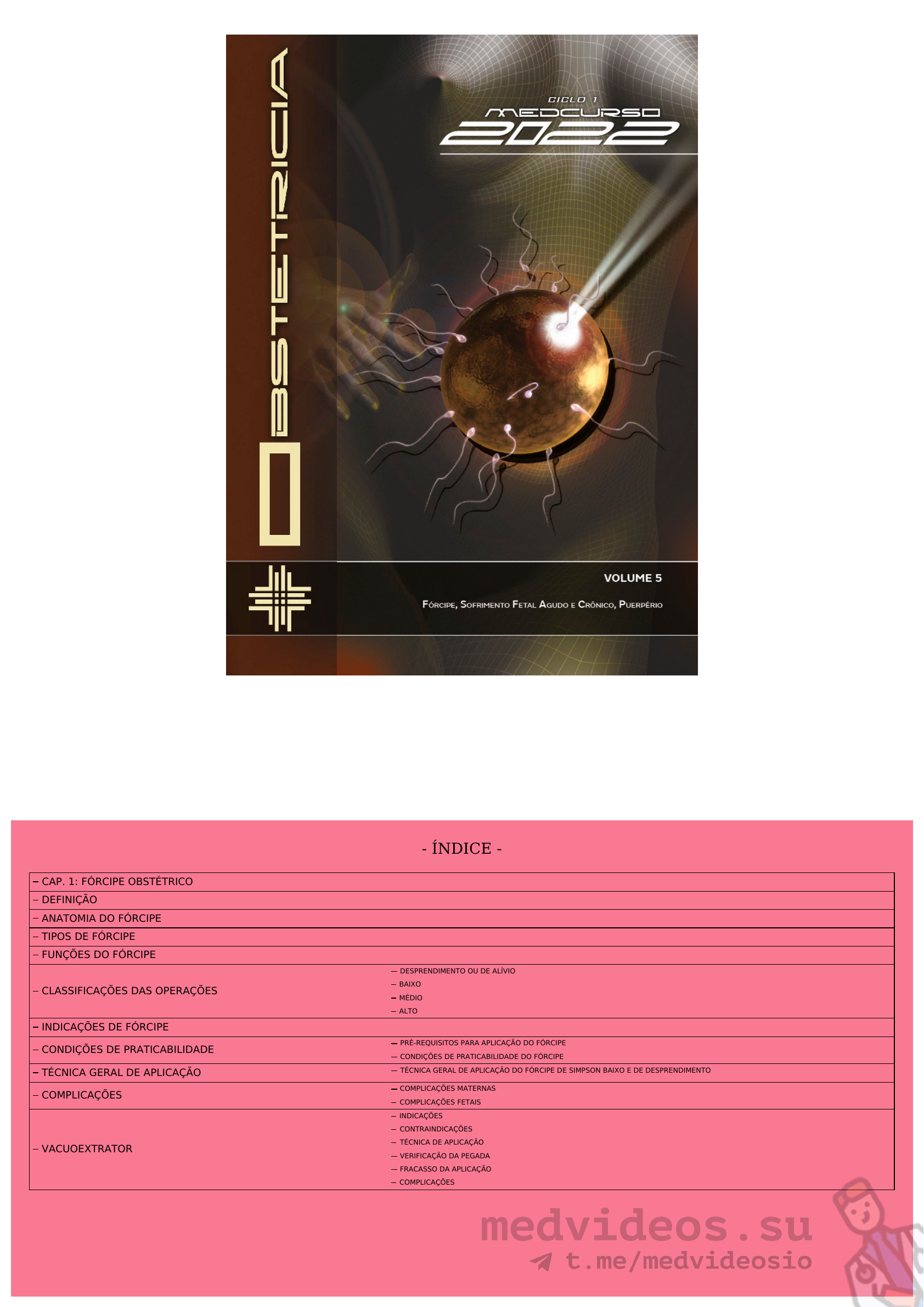 - ÍNDICE - CAP. 1: FÓRCIPE OBSTÉTRICO DEFINIÇÃO ANATOMIA DO FÓRCIPE TIPOS DE FÓRCIPE FUNÇÕES DO FÓRCIPE CLASSIFICAÇÕES DAS OPERAÇÕES DESPRENDIMENTO OU DE ALÍVIO BAIXO MÉDIO ALTO INDICAÇÕES DE FÓRCIPE CONDIÇÕES DE PRATICABILIDADE PRÉ-REQUISITOS PARA APLICAÇÃO DO FÓRCIPE CONDIÇÕES DE PRATICABILIDADE DO FÓRCIPE TÉCNICA GERAL DE APLICAÇÃO TÉCNICA GERAL DE APLICAÇÃO DO FÓRCIPE DE SIMPSON BAIXO E DE DESPRENDIMENTO COMPLICAÇÕES COMPLICAÇÕES MATERNAS COMPLICAÇÕES FETAIS VACUOEXTRATOR INDICAÇÕES CONTRAINDICAÇÕES TÉCNICA DE APLICAÇÃO VERIFICAÇÃO DA PEGADA FRACASSO DA APLICAÇÃO COMPLICAÇÕES CAP. 2: SOFRIMENTO FETAL AGUDO INTRODUÇÃO FISIOPATOLOGIA ETIOLOGIA ALTERAÇÕES UTEROPLACENTÁRIAS ALTERAÇÕES FETOPLACENTÁRIAS DIAGNÓSTICO MONITORIZAÇÃO DOS MOVIMENTOS FETAIS MICROANÁLISE DO SANGUE FETAL AVALIAÇÃO DA FREQUÊNCIA CARDÍACA FETAL INDICAÇÕES MONITORIZAÇÃO ANTEPARTO MONITORIZAÇÃO INTRAPARTO PROGNÓSTICO PREVENÇÃO E TRATAMENTO PROFILÁTICO DURANTE O PARTO CAP. 3: SOFRIMENTO FETAL CRÔNICO INTRODUÇÃO CLÍNICA CRESCIMENTO INTRAUTERINO RESTRITO (CIUR) DIAGNÓSTICO OLIGODRAMNIA AVALIAÇÃO DO BEM-ESTAR FETAL CARDIOTOCOGRAFIA PERFIL BIOFÍSICO FETAL (PBF) PERFIL HEMODINÂMICO FETAL CONDUTA CAP. 4: PUERPÉRIO FISIOLÓGICO DEFINIÇÃO FASES DO PUERPÉRIO RELEVÂNCIA CLÍNICA MANIFESTAÇÕES INVOLUTIVAS E FISIOLÓGICAS ÚTERO VAGINA E INTROITO VAGINAL FUNÇÃO OVULATÓRIA MAMAS TRATO URINÁRIO ALTERAÇÕES HEMODINÂMICAS ALTERAÇÕES HEMATOLÓGICAS MANIFESTAÇÕES CLÍNICAS DOR LÓQUIOS PERDA DE PESO ELEVAÇÃO DE TEMPERATURA CORPORAL DISTÚRBIOS DO HUMOR ASSISTÊNCIA PÓS-NATAL PUERPÉRIO IMEDIATO ORIENTAÇÕES NA ALTA HOSPITALAR USO DE MEDICAMENTOS DURANTE A LACTAÇÃO CLASSIFICAÇÃO DOS FÁRMACOS PARA USO DURANTE A AMAMENTAÇÃO CAP. 5: PUERPÉRIO PATOLÓGICO DEFINIÇÃO HEMORRAGIA PÓS-PARTO DEFINIÇÃO CLASSIFICAÇÃO DIAGNÓSTICO CAUSAS FATORES PREDISPONENTES PREVENÇÃO COMPLICAÇÕES FATORES DE RISCO MANIFESTAÇÕES CLÍNICAS CONDUTA INFECÇÕES PUERPERAIS OU MORBIDADE FEBRIL PUERPERAL DEFINIÇÃO CAUSAS FATORES DE RISCO CONDIÇÕES ASSOCIADAS À VIA DE PARTO MICROBIOLOGIA PROFILAXIA TIPOS DE INFECÇÃO PUERPERAL COMPLICAÇÕES ALTERAÇÕES NAS MAMAS LACTANTES INGURGITAMENTO MAMÁRIO FISSURAS MAMÁRIAS MASTITE PUERPERAL ABSCESSO MAMÁRIO DOENÇAS TROMBOEMBÓLICAS TRANSTORNOS PSIQUIÁTRICOS DO PÓS-PARTO DISTÚRBIOS DO HUMOR Intro_22387 FÓRCIPE OBSTÉTRICO pontos principais ● Conhecer as indicações do uso de fórcipe. ● Saber o instrumento apropriado para cada situação clínica. ● Conhecer as condições obrigatórias de praticabilidade. ● Saber a técnica geral de aplicação. ● Conhecer as principais complicações do uso do instrumento. DEFINIÇÃO O fórcipe é um instrumento para auxiliar a extração fetal durante o período expulsivo. Sua principal função é a tração da cabeça fetal, porém ele também pode ser utilizado para rotação. Muitas vezes, ele é uma solução melhor do que a cesariana para terminar o parto, considerando o tempo para realização do procedimento cirúrgico. ANATOMIA DO FÓRCIPE Os vários modelos de fórcipe variam consideravelmente em tamanho e forma. No entanto, eles basicamente consistem de dois ramos cruzados, cada um com quatro componentes: colher, pedículo, articulação e cabo. Nos fórcipes de modelo clássico, cada colher tem três curvaturas: a cefálica, a pélvica e a perineal – . A curvatura cefálica adapta-se à cabeça do feto, a curvatura pélvica adapta-se à forma curva do canal do parto e a curvatura perineal serve para reduzir o risco de lesão do períneo. TIPOS DE FÓRCIPE O conhecimento dos tipos de instrumento, com suas vantagens, desvantagens e complicações potenciais, é necessário para a correta escolha e emprego do fórcipe obstétrico. Vários fórcipes foram desenvolvidos ao longo dos anos, porém os mais utilizados na prática obstétrica atual são o de Simpson-Braun, de Kielland e de Piper ( e ). Figura 1 FIG. 1 ANATOMIA DO FÓRCIPE. Tabela 1 Figura 2 TAB. 1 TIPOS DE FÓRCIPE E SUAS INDICAÇÕES. MEMORIZE APLICAÇÃO DO FÓRCIPE DE SIMPSON E VARIEDADE DE POSIÇÃO O fórcipe de Simpson pode ser aplicado em qualquer variedade de posição, menos na transversa! O fórcipe de Simpson é o mais utilizado entre eles, sendo aplicado em 90% dos casos. Ele serve para praticamente todos os tipos de aplicações, exceto para aplicação quando a apresentação está em variedade de posição transversa. Neste caso específico, o instrumento mais adequado é o fórcipe de Kielland. O fórcipe de Kielland é um excelente instrumento para realizar rotações mais amplas da cabeça na pelve e é usado por muitos para apresentações em variedades de posições posteriores, apesar de também poder ser utilizado o fórcipe de Simpson nesta situação. O Kielland é útil também na correção de assinclitismos, devido à sua articulação móvel, e é o instrumento de escolha em variedades de posições transversas. O fórcipe de Piper é um instrumento especialmente desenhado para extração da cabeça derradeira na apresentação pélvica – Na falta do fórcipe de Piper, pode-se utilizar o de Kielland ou mesmo o de Simpson para extração da cabeça derradeira, apesar de ambos apresentarem algumas limitações técnicas. TIPO Indicação Simpson Todas as variedades, exceto as transversas. Kielland Variedade transversa, rotações amplas e correção dos assinclitismos. Piper Cabeça derradeira. FIG. 2 TIPOS DE FÓRCIPES MAIS USADOS ATUALMENTE. (A) Simpson-Braun. (B) Kielland. (C) Piper. Figura 3. BIZU Assim fica fácil de memorizar: P de Piper é P de Pélvico. FUNÇÕES DO FÓRCIPE O fórcipe é instrumento desenhado para desempenhar a função de apreender a cabeça do feto (preensão ou pegada), rodá-la, se necessário (rotação), e extraí-la por tração através da pelve materna (tração). A única posição considerada adequada atualme