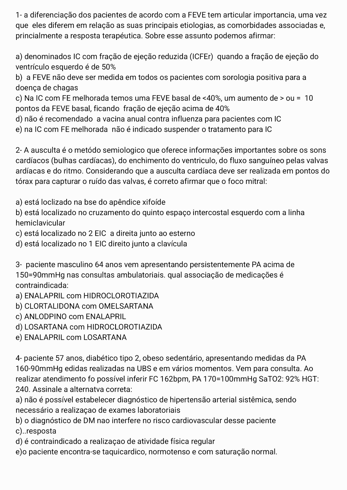 1- a diferenciação dos pacientes de acordo com a FEVE tem articular importancia, uma vez que eles diferem em relação as suas principais etiologias, as comorbidades associadas e, princialmente a resposta terapéutica. Sobre esse assunto podemos afirmar: a) denominados IC com fração de ejeção reduzida (ICFEr) quando a fração de ejeção do ventrículo esquerdo é de 50% b) a FEVE não deve ser medida em todos os pacientes com sorologia positiva para a doença de chagas c) Na IC com FE melhorada temos uma FEVE basal de ou = 10 pontos da FEVE basal, ficando fração de ejeção acima de 40% d) não é recomendado a vacina anual contra influenza para pacientes com IC e) na IC com FE melhorada não é indicado suspender tratamento para IC 2- A ausculta é metódo semiologico que oferece informações importantes sobre os sons cardíacos (bulhas cardíacas), do enchimento do ventriculo, do fluxo sanguíneo pelas valvas ardíacas e do ritmo. Considerando que a ausculta cardíaca deve ser realizada em pontos do tórax para capturar ruído das valvas, é correto afirmar que foco mitral: a) está loclizado na bse do apêndice xifoíde b) está localizado no cruzamento do quinto espaço intercostal esquerdo com a linha hemiclavicular c) está localizado no 2 EIC a direita junto ao esterno d) está localizado no 1 EIC direito junto a clavícula 3- paciente masculino 64 anos vem apresentando persistentemente PA acima de 150=90mmHg nas consultas ambulatoriais. qual associação de medicações é contraindicada: a) ENALAPRIL com HIDROCLOROTIAZIDA b) CLORTALIDONA com OMELSARTANA c) ANLODPINO com ENALAPRIL d) LOSARTANA com HIDROCLOROTIAZIDA e) ENALAPRIL com LOSARTANA 4- paciente 57 anos, diabético tipo 2, obeso sedentário, apresentando medidas da PA 160-90mmHg edidas realizadas na UBS e em vários momentos. Vem para consulta. Ao realizar atendimento fo possível inferir FC 162bpm, PA 170=100mmHg SaTO2: 92% HGT: 240. Assinale a alternatva correta: a) não é possível estabelecer diagnóstico de hipertensão arterial sistêmica, sendo necessário a de exames laboratoriais b) o diagnóstico de DM nao interfere no risco cardiovascular desse paciente c)..resposta d) é contraindicado a de atividade física regular e)o paciente encontra-se taquicardico, normotenso e com saturação normal.5- dentre os quadros de dispneia asinal a altenativa que caraceriza melhor a semiologia edste referido sintoma no que diz a respeito às doenças cardiologicas, ex: IC valvulopaticas e etc a) disneia precipitada pela exposiçao a poeiras e irritantes e que melhora com o uso de broncodilatadore. b)dispneia que surge durante quadro de tosse com esverdiada e febre ata c) dispneia súbita acompanhada de dor torácica, hemoptise cianose d) dispneia acompanhada de disfagia tosse, cornagem e colateral no tórax e) dispneia de início insidioso, presente aos esforços e após alumas horas de sono leva o paciente a necessidade de elevar sua cabeçeira 6- sobre o refluxo hepatojugular é incorreto afirmar que: a) faz parte dos cirtérios de de Framingham para diagnóstico de IC b) o sinal ppode estar presente na vigência de IC c) é de difícil execução, nao podendo ser realizado em enfermarias ou ambulatórios d) indivíduos com disfunçao ventricular direita podem ter o pulso venoso prolongadamente aumentado com a manobra e) é o aumento do pulso venoso jugular consequente à compressão forte e sustentada do hipocôndrio direito 7- na ICFEr podemos afirmar que: a) DIU de alça, usados no controle de congestão eduzem mortalidade e remodelamento cardíaco b) A espironolactona está indicada em pacientes sintomáticosom disfunçao sistólica do VE, em classe funcinal IV da nao apresentando efeitos contundentes sobre a mortalidade c) SACUBITRIL e VALSARTANA é contraindicado em substituição ao IECA- BRA para ddisfunçao do VE sintomática, já em so de terapêutica otimizada com terapia tripla para reduzir morbidade e mortalidade d) os inibidores SGLT2 promovem de morte cardiovascular e hospitalização por IC e) beta bloqueadores, considerados fármacos de primeira linha no tratamento da ICFEr nao... 8- palpitação do pulso arterial permite avaliar: a) a fração de ejeção do ventículo esquerdo e frequência cardíaca b) FR, pressão arterial FC c) regularidade do ritmo, FCe inferir a presença de cardioatias estruturais... d) FC e pressão venosa central e) isquemia cardíaca, FC e alteração do ritmo 9- um médico assistente constatou que um homem de 35 anos de id apresentou, em duas visitas ao consultório, níveis de PA = 130 X 80 mmHg (1° visita) e 135 X 80 mmHg (2°visita). paciente realizou exames de monitorização ambulatorial da PA (MAPA). resultado apresentou valores anormais na média da PA 10- sobre exame pulso arterial, considere as afirmativas seguir: 1- a palpação do pulso radial é importante, atravé dele podemos avaliar a FC, ritmo e amplitude 2- pulso alternante é definido pela variabilidade da amplitude do pulso cada batimento, e pode ocorrer na ICG 3- pulso bífido pode ser encontrado em indivíduo normal, especialmente após esforço físico ou na vigência de febre Assinale a alternativa correta. a) Somente a afirmativa 1 é verdadeira. b) Somente as afirmativas 1 e 2 são verdadeiras. c) Somente as afirmativas 1 e 3 são verdadeiras. d) Somente as afirmativas 2 e 3 são verdadeiras. e) As afirmativas 1, 2 e 3 são verdadeiras. 2. Sobre a avaliação do Ictus cordis podemos afirmar: a) Deve ser realizado com paciente sentado com membros inferiores fletidos. b) Em indivíduos normais, observa-se a presença do ictus cordis simultaneamente a palpação do pulso arterial carotídeo. c) Na tentativa de palpar ictus é contraindicado a manobra de lateralização do paciente. d) No decúbito dorsal, em indivíduos normais, ele pode ser percebido no 6°espaço intercostal esquerdo, na linha axilar média. e) Cardiopatias que aumentam ventrículo direito não são capazes de deslocar ictus po