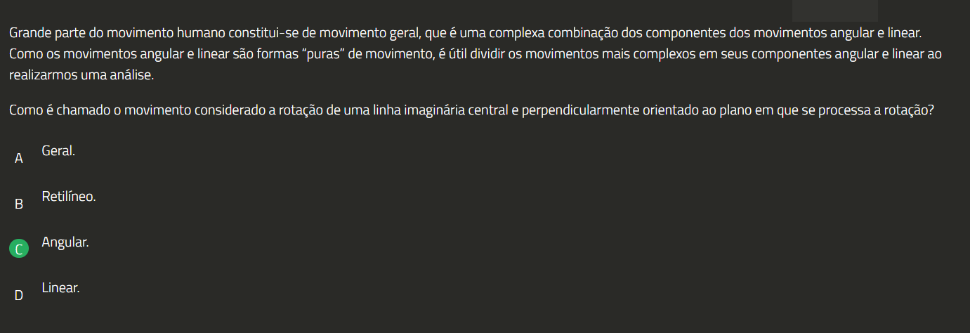Grande parte do movimento humano constitui-se de movimento geral, que é uma complexa combinação dos componentes dos movimentos angular e linear. Como movimentos angular e linear são formas "puras" de movimento, é útil dividir movimentos mais complexos em seus componentes angular e linear ao realizarmos uma análise. Como é chamado 0 movimento considerado a rotação de uma linha imaginária central e perpendicularmente orientado ao plano em que se processa a rotação? Geral. A Retilíneo. B Angular. Linear. D