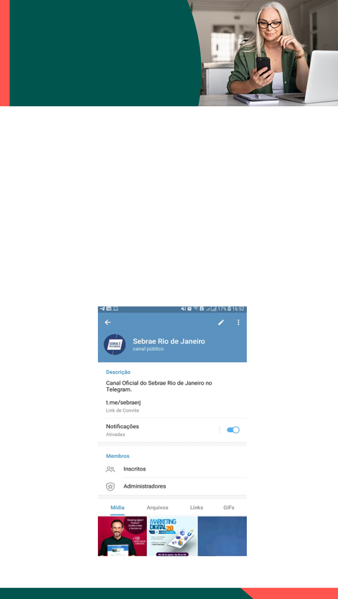 Crie um canal para divulgar o seu negócio CANAIS DO TELEGRAM No canal somente a marca e/ou empresa faz as publi- cações, mas é possível ter mais de um administrador. Assim, mesmo que a postagem seja feita por celulares e pessoas diferentes, para o cliente vai sempre apare- cer que a publicação foi feita pelo canal e não por pes- soas aleatórias. Mensagens publicadas em um canal, são assinadas com o nome do canal. No exemplo abaixo o canal do SEBRAE RJ no Telegram. Um Canal pode ser público ou privado. A grande dife- rença é que um canal público pode ser encontrado por meio de pesquisa no Telegram, já o canal privado não aparece nos resultados de busca e com isso somente as pessoas com o link de acesso podem ingressar no canal. Uma outra distinção entre as duas opções é que o canal privado não tem link personalizado, já o canal público terá um link com a nomenclatura do seu negócio e/ou marca. Confira o passo a passo que preparamos sobre como criar um Canal no Telegram: Na tela inicial do Telegram, clique no botão Menu que está circulado na imagem: Abrirá a tela com vários Menus do App. Para criar um canal clique em “Novo Canal” como está circulado na imagem abaixo: Hora de dar um nome para o seu Canal. Você poderá colocar o nome da sua marca. Como os clientes conhe- cem sua empresa? Não esqueça também de colocar uma descrição e escolher uma foto bem legal. Após nomear o canal, é preciso se o canal será privado ou público. Se você optar pelo canal público, nesse mo- mento precisará escolher o nome do seu link. Veja na imagem: Um canal público pode ser encontrado por meio de pesquisa no Telegram, já o canal privado não aparece nos resultados de busca e com isso somente as pesso- as com o link de acesso, ou seja, aqueles que foram convidados poderão ingressar no canal. Veja o exemplo de link personalizado do Canal do SEBRAE do Rio de Janeiro: O canal privado não tem um link personalizado. Veja o exemplo: Além de não ser personalizado, o link do canal privado pode ser revogado sempre que você precisar. Após re- vogar o link, ele não irá mais funcionar e com isso as pessoas não conseguirão mais entrar no grupo com esse link, mas você pode criar um novo quando quiser. A próxima tela irá pedir que você adicione membros, você pode fazer isso agora, ou depois. Caso escolha adicionar no momento de criação do canal, basta pes- quisar o nome das pessoas que deseja inserir. Em um canal público só é permitido adicionar os 200 primeiros inscritos. Lembre-se de antes perguntar se essas pessoas aceitam e têm interesse em participar do canal. Se você não quiser adicionar ninguém no momento de criação do canal, não tem problema. Basta clicar na seta e passar para a próxima tela. Veja abaixo: Pronto! Seu Canal foi criado! Como Atrelar Um Grupo Ao Seu Canal Para atrelar um grupo ao canal: abra o seu canal já criado, clique no nome do canal para visualizar o ícone do lápis, que significa editar. Feito esse caminho, abrirá para você a seguinte tela: Na imagem acima está destacada a opção de “Conver- sa”. Clicando ali você chegará na tela de configuração para grupo do seu canal. Você pode atrelar um grupo já existente ou até mesmo criar um novo nesse momento. Agora divulgue nas redes sociais convidando seus clientes para acompanharem os conteúdos exclusivos no seu Canal do Telegram! Para saber mais sobre os Canais no Telegram acesse: [clique aqui] https://telegram.org/faq_channels/br