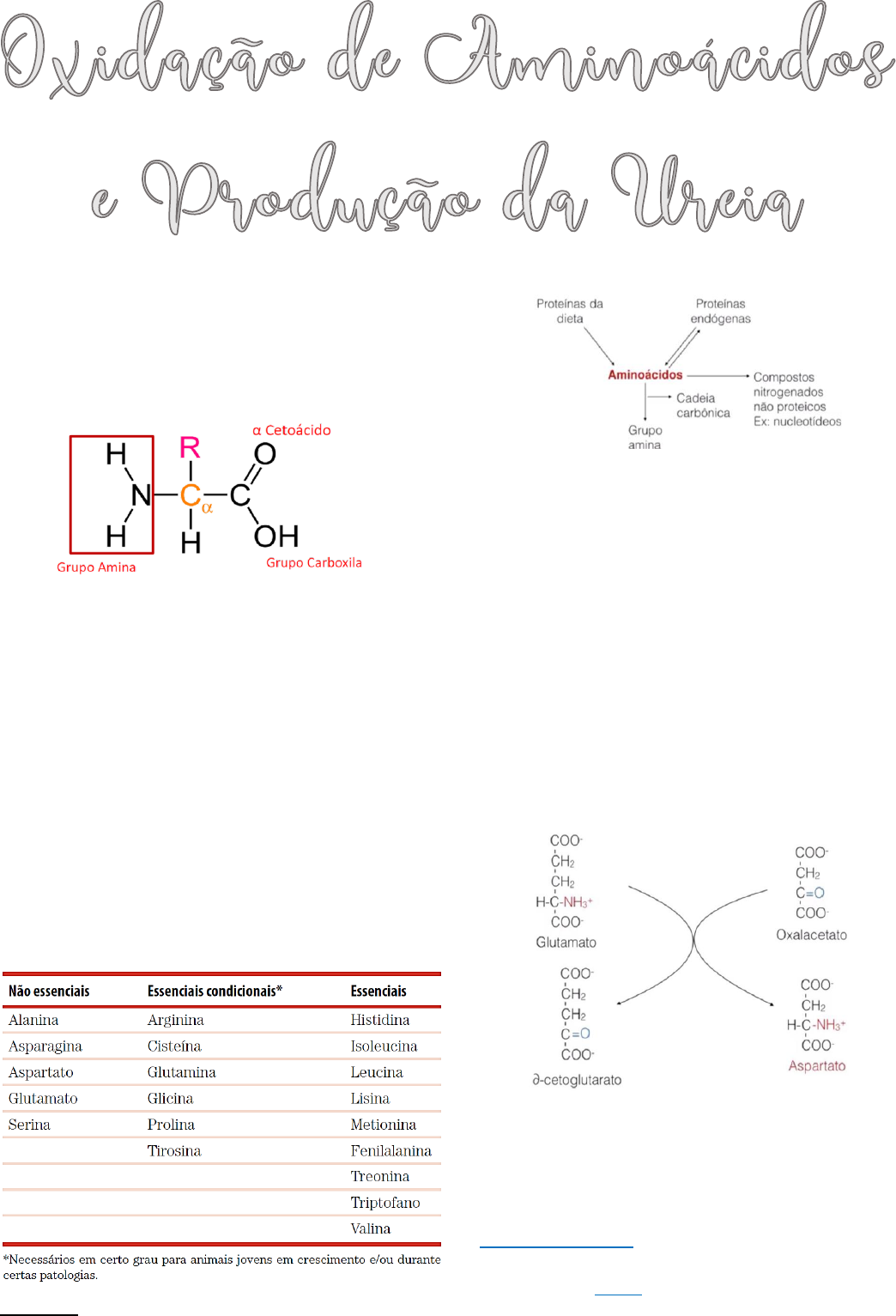 Estrutura dos aminoácidos Ao retirar o grupo amina resta o α cetoácido, no centro temos um carbono quiral (4 ligantes diferentes) e tem a presença de um radical (muda em cada aminoácido) Sofrem degradação oxidativa em 3 condições: 1. Aminoácidos não necessários para biossíntese de novas proteínas 2. Aminoácidos em grande quantidade, que excedem as necessidades 3. Jejum ou diabetes melito não controlada, quando carboidratos estão indisponíveis ou sendo usados de forma inadequada (Aminoácidos usados como combustível) Aminoácidos perdem seu grupo amino, os α-cetoácidos são oxidados a CO2 e H2O ou fornecem estruturas de 3 e 4 carbonos que entram na gliconeogênese Lembrete: O radical da glicina é um H, assim o Cα tem apenas 3 ligantes diferentes Destinos Metabólicos dos Grupos Amino Maior parte dos aminoácidos são metabolizados no Fígado, o excesso de amônia (tóxica) produzido nos tecidos extra-hepáticos é transportado para ele Quatro aminoácidos têm papéis centrais no metabolismo do nitrogênio: glutamato, glutamina, alanina e aspartato Eles são facilmente convertidos em intermediários do ciclo de Krebs Glutamato e Glutamina -> α-cetoglutarato Alanina -> Piruvato Aspartato -> Oxaloacetato No citosol dos hepatócitos, os grupos amino da maior parte dos aminoácidos são transferidos (Transaminação) para o α-cetoglutarato, formando glutamato, que entra na mitocôndria e perde seu grupo amino (Desaminação) para formar NH4 + (Entra no ciclo da Ureia) Músculo esquelético: grupos amino que excedem as necessidades geralmente são transferidos ao piruvato para formar alanina, molécula importante para o transporte de grupos amino até o fígado (Ciclo Glicose- alanina) Transaminação – Transferência de um grupo amina de um aminoácido para outro através de uma molécula (Citosol) Remoção do grupo amino é realizado por enzimas chamadas AMINOTRANSFERASES (ou transaminases) O grupo α-amino é transferido para o α-cetoglutarato, liberando o α-cetoácido correspondente Desaminação – Remoção do grupo amina dos aminoácidos com formação de amônio livre (Mitocôndria) É catalisada pela L-glutamato-desidrogenase presente na matriz mitocondrial O α-cetoglutarato formado pode ser utilizado no ciclo de Krebs e para síntese de glicose O amônio é destinado para o ciclo da ureia para ser excretado Lembrete: poucos aminoácidos pulam a via de transdesaminação e sofrem diretamente desaminação oxidativa Transporte de amônia na forma de glutamina – excesso de amônia nos tecidos é adicionado ao glutamato para formar glutamina (glutamina-sintetase), que é transportada no sangue até o fígado e o NH4 + é liberado na mitocôndria pela glutaminase Lembrete: Na acidose metabólica, há um aumento do processamento da glutamina pelos rins. Nem todo o excesso de NH4 + assim produzido é liberado para a corrente sanguínea ou convertido em ureia; parte é excretado diretamente na urina. No rim, o NH4 + forma sais com ácidos metabólicos, facilitando sua remoção na urina. O bicarbonato produzido pela descarboxilação do a-cetoglutarato no ciclo do ácido cítrico também pode funcionar como tampão no plasma sanguíneo. Tomados em conjunto, esses efeitos do metabolismo da glutamina no rim tendem a contrabalançar a acidose Ciclo da Glicose-alanina – alanina transporta amônia dos músculos esqueléticos para o fígado Grupo α-amino transportado para o piruvato pela alanina- aminotransferase, formando a alanina que é transportada no sangue No fígado, são separados por transaminação formando glutamato (entra na mitocôndria para desaminação ou sofre transaminação com o oxaloacetato para formar aspartato) e piruvato Semelhante ao Ciclo de Cori (Lactato Glicose) Excreção de Nitrogênio e Ciclo da Ureia Produção da ureia ocorre quase exclusivamente no FÍGADO Inicia na mitocôndria dos hepatócitos e três de suas etapas ocorrem no citosol Fígado recebe também pela veia porta a amônia que vem do intestino produzido pela oxidação bacteriana de aminoácidos NH4 + na mitocôndria logo reage com o CO2 (como HCO3 -) produzido pela respiração mitocondrial para formar carbamoil-fosfato na matriz (catalisado pela carbamoil-fosfato-sintetase I) Carbamoil-fosfato funciona como um doador de grupos carbamoila e entra no ciclo da ureia O ciclo tem apenas 4 etapas enzimáticas Etapa 1: Carbamoil-fosfato doa seu grupo carbamoila para a ornitina formando a citrulina (vai para o citosol) e liberando um Pi, reação catalisada pela ornitina- transcarbamoilase Etapa 2: ASPARTATO (oxaloacetato sofre transaminação com o glutamato na mitocôndria) traz o segundo grupo amino, reação de condensação ocorre com o grupo ureido (carbonila) da citrulina e forma Arginino-succinato, reação catalisada pela arginino- succinato-sintetase Etapa 3: Arginino-succinato é clivado pela arginino- succinase, formando arginina e fumarato (convertido em MALATO e entra na mitocôndria para o ciclo de Krebs), única reação reversível do ciclo Etapa 4: Arginase cliva a arginina, produzindo UREIA e ornitina (que volta para a mitocôndria) “Bicicleta de Krebs” – conexão dos dois ciclos descobertos por Krebs Destino da Cadeia Carbônica As vinte cadeias carbônicas diferentes são oxidadas por vias próprias que, todavia, convergem para a produção de apenas alguns compostos: Piruvato, Acetil-CoA ou intermerdiários do Ciclo de Krebs (oxaloacetato, α- cetoglutarato, succinil-CoA e fumarato) O destino final dos α-cetoácidos que dependerá do tecido e do estado fisiológico considerados, poderá ser: 1. Oxidação pelo Ciclo de Krebs, fornecendo energia 2. Utilização pela gliconeogênese para a produção de glicose 3. Conversão a triacilgliceróis e armazenamento Podem ir para a Cetogênese também
