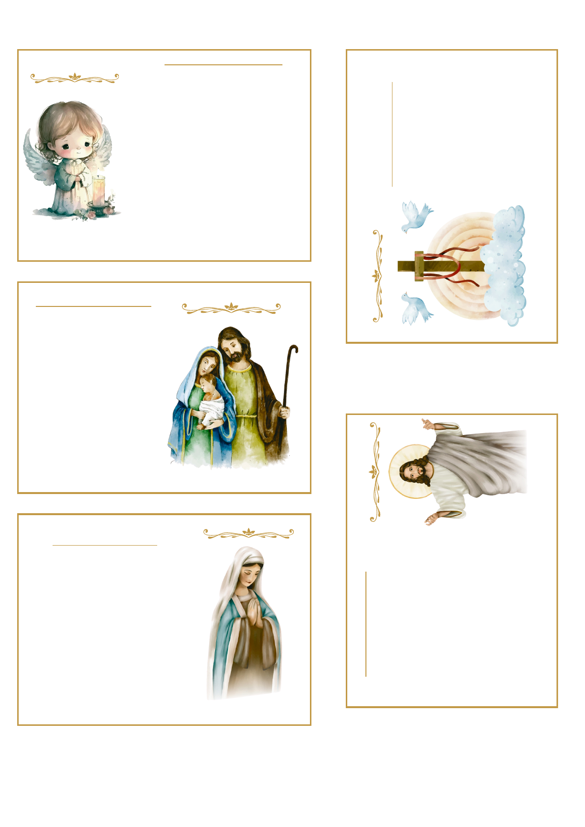 Santo Anjo da Guarda, meu poderoso protetor, guardai-me sempre na paz de vosso amor. Dos perigos, livrai-me; do mal, libertai-me; e nos momentos de angústia, consolai-me! Durante o sono, velai sobre o meu descanso, não deixais o mal de mim se aproximar. Sob as asas do seu amor, possa meus sonhos habitar! Nesta noite de luz, afugentai as trevas do medo, afastai também as tentações, para que minha alma tranquila descanse sem aflições. E que no alvorecer de um novo dia, eu acorde feliz e restaurado, e seja para o mundo testemunha de ser sempre por vós amado! Anjo da Guarda Pai Nosso que estais nos Céus, santificado seja o vosso Nome, venha a nós o vosso Reino, seja feita a vossa vontade assim na terra como no Céu. O pão nosso de cada dia nos dai hoje, perdoai-nos as nossas ofensas assim como nós perdoamos a quem nos tem ofendido, e não nos deixeis cair em tentação, mas livrai-nos do Mal. Amém Pai Nosso Ave Maria Ave Maria, cheia de graça, o Senhor é convosco; bendita sois Vós entre as mulheres e bendito é o fruto do Vosso ventre, Jesus. Santa Maria, Mãe de Deus, rogai por nós, pecadores, agora e na hora da nossa morte. Amém. Gl ór ia G ló ria a o Pa i, ao F ilh o e ao E sp íri to S an to . As sim c om o er a no pr in cí pi o, a go ra e s em pr e, pe lo s sé cu lo s do s sé cu lo s. Am ém C re io e m D eu s Pa i t od o- po de ro so , cr ia do r do c éu e d a te rr a; e e m J es us C ris to , se u ún ic o Fi lh o, n os so S en ho r, qu e fo i c on ce bi do pe lo p od er d o Es pí rit o Sa nt o; na sc eu d a Vi rg em M ar ia ; pa de ce u so b Pô nc io P ila to s; fo i c ru ci fic ad o, m or to e s ep ul ta do ; de sc eu à m an sã o do s m or to s; re ss us ci to u ao t er ce iro d ia ; su bi u ao s cé us , es tá s en ta do à d ire ita d e D eu s Pa i t od o- po de ro so ; do nd e há d e vi r a ju lg ar o s vi vo s e os m or to s. C re io n o Es pí rit o Sa nt o, n a Sa nt a Ig re ja C at ól ic a, na c om un hã o do s sa nt os ; na r em iss ão d os p ec ad os , na r es su rr ei çã o da c ar ne , na v id a et er na . Am ém ! Cr ed o São José Ó Deus que por uma Inefável providencia Vos dignastes escolher o bem-aventurado São José para esposo de Vossa mãe Santíssima: concedei-nos que aquele mesmo que na Terra veneramos como Protetor, mereçamos tê-lo no céu por nosso Intercessor. Vos que viveis e Reinais por todos os Séculos dos séculos Amém. Consagração a Nossa Senhora Ó Senhora minha, ó minha Mãe, eu me ofereço todo(a) a vós, e, em prova da minha devoção para convosco, vos consagro neste dia e para sempre, os meus olhos, os meus ouvidos, a minha boca, o meu coração e inteiramente todo o meu ser; E porque assim sou vosso(a), ó incomparável Mãe, guardai-me e defendei-me como coisa e propriedade vossa. Lembrai-vos que vos pertenço, terna Mãe, Senhora nossa. Ah, guardai-me e defendei-me como coisa própria vossa. Amém. Oração do Espírito Santo Vinde Espírito Santo, enchei os corações dos vossos fiéis e acendei neles o fogo do vosso amor. Enviai o vosso Espírito e tudo será criado. E renovareis a face da terra. OREMOS: Ó Deus, que instruístes os corações dos vossos fiéis com a luz do Espírito Santo, fazei que apreciemos retamente todas as coisas segundo o mesmo Espírito e gozemos sempre da sua consolação. Por Cristo, Senhor Nosso. Amém. Si na l d a S an ta Cr uz 1- P EL O S IN AL D A SA N TA C RU Z (N AT ES TA ) Co m e ss as p al av ra s e ge st os p ed im os a D eu s qu e ab en ço e os n os so s pe ns am en to s, no s da nd o pe ns am en to s pu ro s, no br es , b en ig no s e af as ta nd o to do p en sa m en to n eg at iv o. 2- LI VR AI -N O S, D EU S, N O SS O S EN H O R (N A BO C A) Ao p ro fe rir e ss as p al av ra s e ge st os , p ed im os a D eu s qu e da n os sa b oc a, s ó sa ia m p al av ra s do b em , lo uv or es , q ue a n os sa f al a sir va p ar a ed ifi ca r o Re in o de D eu s e tr az er o b em p ar a o pr óx im o. 3- D O S N O SS O S IN IM IG O S (N O C O RA Ç ÃO ) Co m e st e ge st o e pa la vr as , p ed im os a o Se nh or p ar a qu e cu id e do n os so c or aç ão , p ar a qu e ne le s ó re in e o am or e o b em , n os a fa st an do d e se nt im en to s ru in s co m o o ód io , a a va re za , a lu xú ria , a in ve ja , e tc . Or aç ão M ar ia Pa ss a n a F re nt e M ar ia , e u te p eç o: p as sa n a fr en te ! Va i c on du zi nd o, a ju da nd o e cu ra nd o os f ilh os q ue n ec es si ta m d e ti. N in gu ém f oi d ec ep ci on ad o po r ti de po is d e ha ve r te in vo ca do e pe di do a t ua p ro te çã o. Só t u, c om o p od er d e te u Fi lh o, po de s re so lv er a s co is as d ifí ce is e im po ss ív ei s. Salve Rainha Salve, Rainha, Mãe de Misericórdia, vida, doçura e esperança nossa, Salve. A Vós bradamos, os degredados filhos de Eva. A Vós suspiramos, gemendo e chorando neste vale de lágrimas. Eia, pois, Advogada nossa, esses Vossos olhos misericordiosos a nós volvei; e depois deste desterro mostrai-nos Jesus, bendito Fruto do Vosso ventre. Ó clemente, ó piedosa, ó doce sempre Virgem Maria. Rogai por nós, Santa Mãe de Deus, Para que sejamos dignos das promessas de Cristo. Amém. Oração da Família "Ó Deus, Pai de misericórdia, generoso e bondoso, hoje Vos peço a bênção para minha família. Ó Deus, que deste a esta Terra uma família perfeita, eternizada nos pais Maria e José e em seu Filho amado, Nosso Senhor Jesus Cristo. Senhor, louva a todos aqueles que me são queridos. Oração da Criança Jesus, eu estou crescendo não só por fora, para ter um corpo bonito e forte, mas, ajude-me a crescer também por dentro, para ter um coração cheio de bondade. Jesus, ajude-me a ser feliz porque eu existo. Jesus, eu gosto do Senhor, de todo coração e vou gostar de todo mundo, como o Senhor gosta de mim. Amém. Al m a d e C ri st o Al m a de C ris to , s an tif ic ai -m e. C or po d e C ris to , s al va i- m e. Sa ng ue d e C ris to , i ne br i