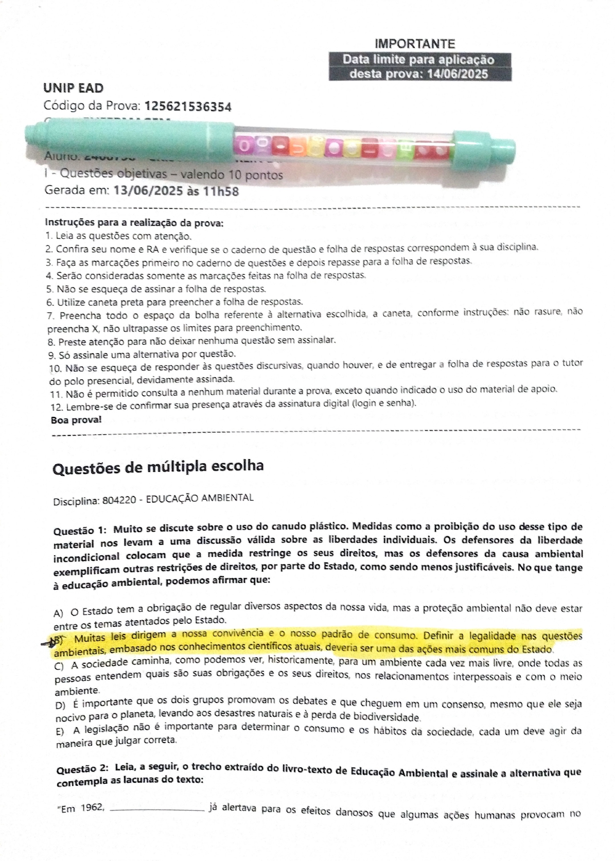 IMPORTANTE Data limite para aplicação desta prova: 14/06/2025 UNIP EAD Código da Prova: 125621536354 Questões objetivas valendo 10 pontos Gerada em: 13/06/2025 às 11h58 Instruções para a realização da prova: 1. Leia as questões com atenção. 2. Confira seu nome e RA e verifique se caderno de questão e folha de respostas correspondem à sua disciplina. 3. Faça as marcações primeiro no caderno de questões e depois repasse para a folha de respostas. 4. Serão consideradas somente as marcações feitas na folha de respostas. 5. Não se esqueça de assinar a folha de respostas. 6. Utilize caneta preta para preencher a folha de respostas. 7. Preencha todo espaço da bolha referente à alternativa escolhida, a caneta, conforme instruções: não rasure, não preencha X, não ultrapasse os limites para preenchimento. 8. Preste atenção para não deixar nenhuma questão sem assinalar. 9. Só assinale uma alternativa por questão. 10. Não se esqueça de responder às questões discursivas, quando houver, e de entregar a folha de respostas para tutor do polo presencial, devidamente assinada. 11. Não é permitido consulta a nenhum material durante a prova, exceto quando indicado uso do material de apoio. 12. Lembre-se de confirmar sua presença através da assinatura digital (login e senha). Boa prova! Questões de múltipla escolha Disciplina: 804220 EDUCAÇÃO AMBIENTAL Questão 1: Muito se discute sobre o uso do canudo plástico. Medidas como a proibição do uso desse tipo de material nos levam a uma discussão válida sobre as liberdades individuais. Os defensores da liberdade incondicional colocam que a medida restringe os seus direitos, mas os defensores da causa ambiental exemplificam outras restrições de direitos, por parte do Estado, como sendo menos justificáveis. No que tange à educação ambiental, podemos afirmar que: A) O Estado tem a obrigação de regular diversos aspectos da nossa vida, mas a proteção ambiental não deve estar entre os temas atentados pelo Estado. Muitas leis dirigem a nossa convivência e nosso padrão de consumo. Definir a legalidade nas questões ambientais, embasado nos conhecimentos científicos atuais, deveria ser uma das ações mais comuns do Estado. C) A sociedade caminha, como podemos ver, historicamente, para um ambiente cada vez mais livre, onde todas as pessoas entendem quais são suas obrigações e os seus direitos, nos relacionamentos interpessoais e com o meio ambiente. D) É importante que os dois grupos promovam os debates e que cheguem em um consenso, mesmo que ele seja nocivo para o planeta, levando aos desastres naturais e à perda de biodiversidade. E) A legislação não é importante para determinar o consumo e os hábitos da sociedade, cada um deve agir da maneira que julgar correta. Questão 2: Leia, a seguir, trecho extraído do livro-texto de Educação Ambiental e assinale a alternativa que contempla as lacunas do texto: "Em 1962, já alertava para os efeitos danosos que algumas ações humanas provocam noambiente. Por meio da publicação de questionou de forma incisiva a confiança cega da humanidade no progresso tecnológico. Essa obra abriu espaço para movimento ambientalista que se seguiu. Sua maior contribuição foi a conscientização pública de que a natureza é frágil diante da intervenção humana, fomentando uma inquietação internacional sobre a perda da qualidade de vida (GUIMARÃES, 2006)." A) Paulo Nogueira Neto/Nosso Futuro Comum. B) José Lutzenberger/O Manifesto Ecológico Brasileiro. C) Darcy Vargas/Cidade dos Meninos. Rachel Carson/Primavera Silenciosa. E) Ravi Kumar/Reza por chuva. Questão 3: Segundo Silva (2007), conforme citado na sessão "4-Tendências atuais" do livro texto da disciplina, a educação ambiental pode ser classificada, basicamente, em três grupos: conservadora, pragmática e crítica. Seguindo a linha da evolução histórica, esses grupos buscam descrever a forma de atuação da sociedade frente aos desafios ambientais. o primeiro grupo coloca o Estado como responsável pela manutenção do meio ambiente, o segundo grupo traz a sociedade para junto do Estado e o terceiro grupo, definindo uma visão mais moderna, coloca cada indivíduo e suas atitudes cotidianas como responsável pela manutenção do ambiente natural e pela fiscalização das atividades degradadoras. Isso implica que: Cada vez mais a sociedade como um todo delega poderes ao indivíduo, tanto singularmente quanto como organizações sociais, para fiscalizar e denunciar as atividades das indústrias para Estado e para a sociedade, que devem exigir do degradador ações reparatórias, assim como indivíduo recebe a obrigação de apresentar cada vez mais atitudes pessoais sustentáveis no seu cotidiano. B) O Estado vem perdendo a obrigação de fiscalizar as atividades das indústrias, deixando para os indivíduos fazerem essa cobrança, pressionando diretamente as indústrias, sem intermédio do Estado. C) O Estado e as indústrias são responsáveis pela transmissão de informações para os indivíduos, e a sociedade não tem voz ativa nas atividades exploratórias feitas tanto pelo Estado quanto pelas indústrias. D) Os agentes exploradores vêm se tornando cada vez mais ecologicamente funcionais, a ponto de não ser necessária a fiscalização de suas atividades a partir da sociedade. E) A indústria desenvolve, ao longo do tempo, formas de explorar os recursos naturais de forma não degradadora, mantendo a qualidade ambiental. Questão 4: Em relação à elaboração de programas e atividades de educação ambiental, assinale a alternativa INCORRETA: A) O planejamento das atividades e as formas de abordagem devem ter plena aderência ao perfil do educando. É necessário que o educador compreenda os vários contextos aos quais se aplica a educação ambiental e a diversidade dos educandos resultante dessa variação contextual. B) Devem ser levados em conta a maturidade e estado motivacional da
