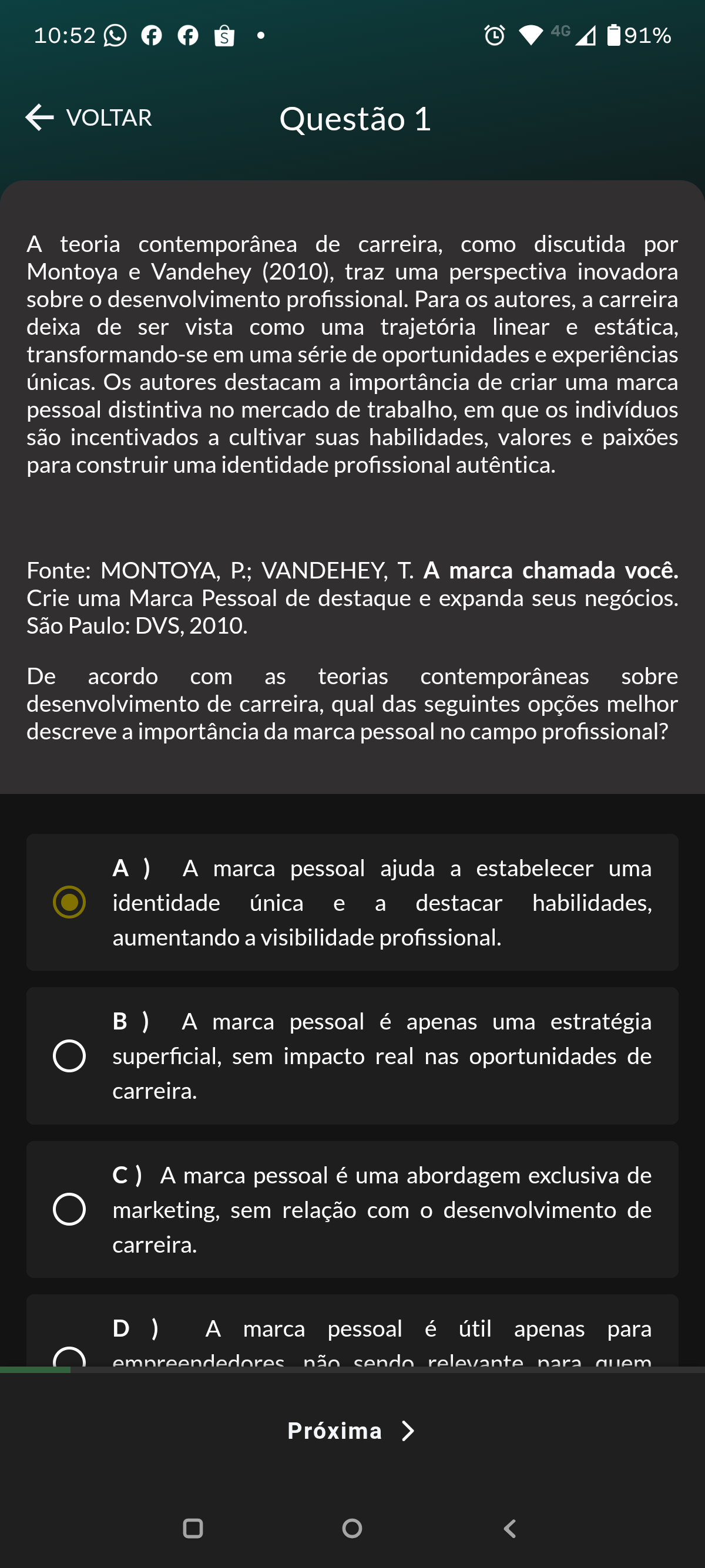 10:52 f S 4G 91% VOLTAR Questão 1 teoria contemporânea de carreira, como discutida por Montoya e Vandehey (2010), traz uma perspectiva inovadora sobre desenvolvimento profissional. Para os autores, a carreira deixa de ser vista como uma trajetória linear e estática, transformando-se em uma série de oportunidades e experiências únicas. Os autores destacam a importância de criar uma marca pessoal distintiva no mercado de trabalho, em que os indivíduos são incentivados a cultivar suas habilidades, valores e paixões para construir uma identidade profissional autêntica. Fonte: MONTOYA, P.; VANDEHEY, T. marca chamada você. Crie uma Marca Pessoal de destaque e expanda seus negócios. São Paulo: DVS, 2010. De acordo com as teorias contemporâneas sobre desenvolvimento de carreira, qual das seguintes opções melhor descreve a importância da marca pessoal no campo profissional? ) marca pessoal ajuda a estabelecer uma identidade única e a destacar habilidades, aumentando a visibilidade profissional. marca pessoal é apenas uma estratégia superficial, sem impacto real nas oportunidades de carreira. C) A marca pessoal é uma abordagem exclusiva de marketing, sem relação com desenvolvimento de carreira. D ) A marca pessoal é útil apenas para empreendedores não sendo relevante quem Próxima >