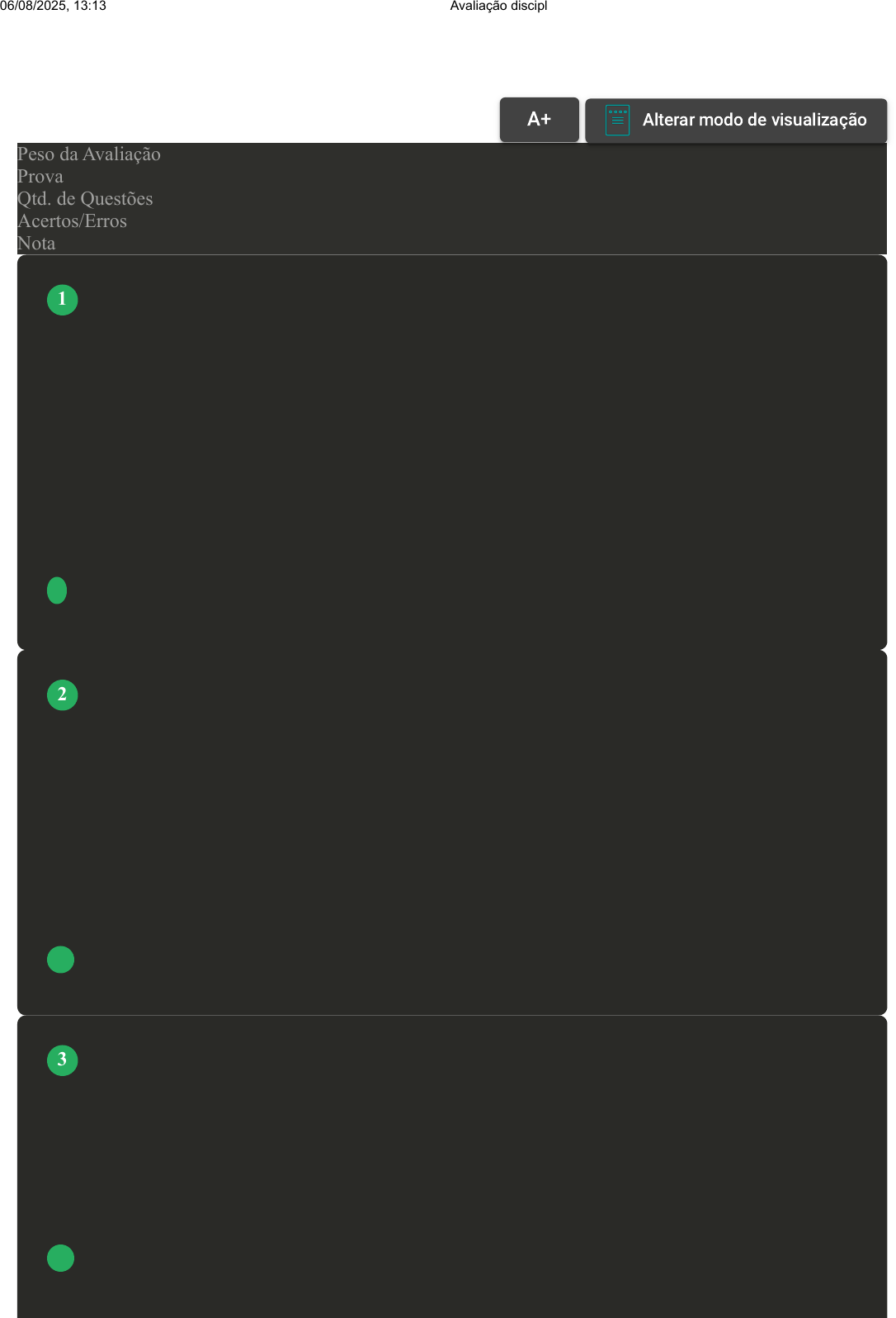 Prova Impressa GABARITO | Avaliação disciplina on-line (Cod.:1523187) Peso da Avaliação 10,00 Prova 103740216 Qtd. de Questões 10 Acertos/Erros 9/1 Nota 9,00 Algumas técnicas já foram formuladas e testadas para auxiliar na administração de conflitos, resultando em consequências benéficas às entidades e profissionais que se utilizam delas. Assinale a alternativa CORRETA que trata sobre a técnica de Suavização: A Consiste em cada uma das partes abrir mão de algo valioso em prol de atingir uma situação em que ambas ainda saiam satisfeitas. B A pessoa envolvida na administração usa sua autoridade formal para resolver o conflito e depois comunica seu desejo às partes envolvidas. C Utilização de técnicas de mudança comportamental com o objetivo de modificar atitudes e comportamentos praticados pelas partes que possam estar causando o conflito. D Técnica de minimizar as diferenças entre as partes envolvidas na situação de conflito, de modo a enfatizar seus interesses comuns. Chiavenato (2014) elaborou um esquema analisando cinco técnicas de administração de conflitos, de acordo com dois tipos de graus diferentes. Quais são esses dois graus? FONTE: Chiavenato, I. Introdução à Teoria Geral da Administração. 9. ed. São Paulo: Manole, 2014. A Grau diário e Grau esporádico. B Grau de gestão e Grau de funcionalismo. C Grau tangível e Grau intangível. D Grau de cooperação e Grau de assertividade. Uma das causas mais comuns de conflitos é a existência de diferenças de personalidade. Sobre isso, analise as sentenças a seguir: I- É a causa mais difícil de ser percebida. II- Uma das principais justificativas das pessoas para isso é terem "personalidades opostas". III- O negociador, ao conhecer a outra parte, consegue antever o conflito. Assinale a alternativa CORRETA: A As sentenças II e III estão corretas. B VOLTAR A+ Alterar modo de visualização 1 2 3 06/08/2025, 13:13 Avaliação disciplina on-line about:blank 1/4 As sentenças I e III estão corretas. C Somente a sentença I está correta. D As sentenças I e II estão corretas. A existência de conflitos é próprio das relações interpessoais. Não há como pensar na existência de convívio humano sem conflitos, mesmo que sejam esporádicos. A administração de conflitos surge na intenção de evitar que se chegue a situações de: A Integração entre as partes de uma entidade. B Debate pacífico. C Agressividade e confronto verbal ou físico. D Mudança de mentalidade por uma das partes envolvidas. Em geral, quando se fala sobre conflitos, situações desagradáveis vem à tona. Briga entre colegas, dificuldade de atingir metas, e demais aspectos negativos são os primeiros a aparecerem. Sobre o exposto, assinale a alternativa CORRETA: A Conflitos podem ser solucionados ou estimulados, dependendo dos interesses do negociador ou da empresa que ele representa. B Lidar com conflitos, quando ocorrem em empresas, exige dos gestores a contratação de profissionais preparados em negociação interpessoal. C Todos os conflitos precisam ser exterminados assim que possível, pois quanto mais rápido são solucionados, menos perda deriva da situação. D Como todos os conflitos trazem algo de positivo, o correto é que sempre se aguarde um período antes de solucioná-los, para garantir que os benefícios sejam usufruídos. Há cinco estágios em uma situação conflituosa, cada um com suas características específicas. É importante compreender essa sequência para conseguir administrar o conflito ocorrido. Assinale a alternativa CORRETA que trata do estágio da OPOSIÇÃO POTENCIAL: A Estágio em que há a decisão de agir de uma determinada maneira. B Estágio no qual a parte coloca em prática o que decidiu fazer para lidar com a oposição. C Estágio no qual aparecem as condições e os fatores para o surgimento do conflito. D Estágio no qual condições anteriores levam ao conflito caso uma ou mais partes envolvidas tenha sido afetada e esteja consciente disso. 4 5 6 Revisar Conteúdo do Livro 06/08/2025, 13:13 Avaliação disciplina on-line about:blank 2/4 Há ferramentas que auxiliam na administração de conflitos, de modo que o resultado traga benefícios para a entidade. Algumas delas foram discutidas durante nosso estudo. Assinale a alternativa CORRETA que trata sobre a técnica de Expansão de Recursos: A Consiste na promoção de encontros entre as partes conflitantes, com o intuito de identificar os problemas e resolvê-los por meio de discussão aberta. B É a técnica de evitar o conflito. Normalmente, é utilizada quando o conflito não é vantajoso para uma das partes ou quando esta se encontra em grande desvantagem. C Consiste na criação de uma meta compartilhada para as partes envolvidas, definida de tal forma que não possa ser atingida sem a cooperação entre as partes conflitantes. D Uma decisão pela expansão do recurso pode criar uma solução em que ambas as partes saem ganhando, logo, o conflito se extingue. Na administração de conflitos, existem duas técnicas que tratam de Alterações de Variáveis: a Alteração de Variáveis Humanas e a Alterações de Variáveis Estruturais. Assinale a alternativa CORRETA que trata sobre a técnica de Alteração de Variáveis Estruturais: A Utilização de técnicas de mudança comportamental com o objetivo de modificar atitudes e comportamentos praticados pelas partes que possam estar causando o conflito. B Pode ser necessário um redesenho na estrutura, transferências ou reacomodações, e pode ser utilizada em conflitos mais sérios no ambiente de trabalho. C Consiste em cada uma das partes abrir mão de algo valioso em prol de atingir uma situação em que ambas ainda saiam satisfeitas. D A pessoa envolvida na administração usa sua autoridade formal para resolver o conflito e depois comunica seu desejo às partes envolvidas. Como em todas as relações interpessoais existirão conflitos em algum momento, e isso abr