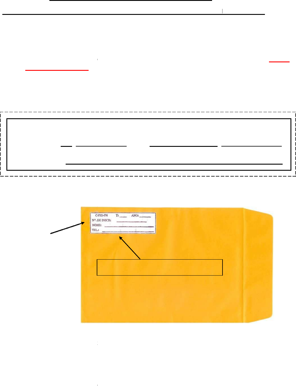 CP-C-FSD-FN Nº de Inscrição: _ Nome Completo: INSTRUÇÕES PARA 1º) GUIA DE ORIENTAÇÃO PARA APRESENTAÇÃO a) INSTRUÇÕES GERAIS As cópias dos documentos com a sequência descrita TAMANHO A4 (branco ou pardo) Preencha as informações em letra de forma, SUPERIOR ESQUERDO do envelope de Não serão recebidos documentos O envelope deverá estar na posição b) AS CÓPIAS DOS DOCUMENTOS As cópias devem ser em PRETO Usar folha A4 (não deverá Cada cópia DEVE apresentar Usar face única, ou seja, fazer Quando o documento for face da folha (Exemplo: Carteira verso, mas não couber na folhas separadas; (Exemplo: Comprovante de As cópias DEVEM ser LEGÍVEIS PREFERENCIALMENTE concentrar NÃO HÁ NECESSIDADE D estar rubricadas, sendo de inteira responsabilidade do candidato a das cópias. ETIQUETA (canto superior esquerdo) TURMA: I/2026 Tel.(s): / PARA VERIFICAÇÃO DE DOCUMENTOS (VD) APRESENTAÇÃO DAS CÓPIAS E ORIGINAIS DOS DOCUMENTOS As cópias dos documentos (01 cópia de cada documento) deverão ser organizadas de acordo descrita no edital do concurso e entregues dentro ou pardo) em boas condições de uso; Preencha as informações em letra de forma, RECORTE A ETIQUETA ABAIXO do envelope de acordo com o modelo abaixo; e documentos fora do período estipulado no calendário O envelope deverá estar na posição “PAISAGEM” conforme exemplo abaixo DOCUMENTOS DEVEM SEGUIR AS ESPECIFICAÇÕES ABAIXO PRETO e BRANCO; deverá ser em papel colorido); apresentar somente UM DOCUMENTO por folha; seja, fazer a cópia em SOMENTE UM lado da folha; for pequeno, deve-se fazer a cópia, com frente Carteira de Identidade) Quando o documento na mesma face da folha, o mesmo deve ser de Escolaridade); LEGÍVEIS e apresentar boa definição; concentrar as imagens no CENTRO da folha; e DAS CÓPIAS ESTAREM ENCADERNADAS, porém as p sendo de inteira responsabilidade do candidato a FRENTE DO ENVELOPE (campo destinado as informações do candidato) DOCUMENTOS deverão ser organizadas de acordo dentro de um ENVELOPE RECORTE A ETIQUETA ABAIXO e cole no CANTO abaixo; e calendário do concurso. conforme exemplo abaixo ABAIXO folha; frente e verso, na mesma documento contar com frente e ser entregue em duas porém as páginas deverão entrega correta ou não 2º) LISTA DE DOCUMENTOS PARA VERIFICAÇÃO DE DOCUMENTOS (VD) a) REGISTRO CIVIL DE PESSOAS NATURAIS Certidão de Nascimento b) ALISTAMENTO MILITAR Certificado de Alistamento Militar (CAM); ou Certificado de Dispensa de Incorporação (CDI); ou Certificado de Reservista (CR); ou Se Militar da ativa: Declaração da Unidade informando a condição de militar e a data incorporação no serviço militar. c) DOCUMENTAÇÃO ESCOLAR Diploma, Certificado ou Declaração de Conclusão do Ensino Médio; e Histórico-escolar. d) ALISTAMENTO ELEITORAL Certidão de Quitação Eleitoral, disponível no endereço www.tse.jus.br. e) CERTIDÃO DE ANTECEDENTES DA JUSTIÇA MILITAR, disponível no endereço www.stm.jus.br f) CERTIDÃO DA JUSTIÇA FEDERAL, site da Justiça Federal da região que reside o candidato. g) CERTIDÃO DA JUSTIÇA ESTADUAL (site do Tribunal de Justiça do Estado a que pertence o candidato). No caso dos candidatos do Rio de Janeiro que possuem carteira de identidade emitida pelo DETRAN ou Instituto Félix Pacheco (IFP), deverão acessar o link (https://certidaocacciifppcerj.detran.rj.gov.br/) e imprimir a referida Certidão. h) CADASTRO DE PESSOAS FÍSICAS CPF; e Comprovante de Situação Cadastral no CPF, na situação cadastral “REGULAR”, disponível no endereço www.receita.fazenda.gov.br i) IDENTIFICAÇÃO CIVIL (RG) / IDENTIFICAÇÃO MILITAR / CNH (atualizada) Identidade civil (dentro do prazo de validade); Identidade militar (dentro do prazo de validade); ou Carteira Nacional de Habilitação (CNH). j) CARTEIRA DE TRABALHO E PREVIDÊNCIA SOCIAL (CTPS) Carteira de Trabalho (se possuir) (no caso de ser digital deverá ser impressa) ou cópia da rimeira página onde consta a foto do cidadão; cópia da página com a identificação do cidadão; e cópia da página com o primeiro registro de emprego.; e PIS/PASEP (para aqueles com registro na Carteira de Trabalho). k) DEPENDENTE DE MILITAR OU FUNCIONÁRIO CIVIL MARINHA DO BRASIL Cópia do contracheque do pai ou responsável; ou Cópia do cartão de identidade expedido pelo SIM. Declaração de bons antecedentes, de acordo com o modelo do anexo F; Declaração de bons antecedentes militares, se militar das Forças Armadas, das Polícias Militares e dos Corpos de Bombeiros Militares, no serviço ativo, conforme modelo constante no anexo G; l) ATO DA ENTREGA DOS DOCUMENTOS (finalização) Declaração de Veracidade Documental (preenchida e assinada pelo candidato). Os documentos constantes nas alíneas c e d, do subitem 11.2 do edital, poderão ser apresentados até a data de incorporação no Curso de Formação, devendo os candidatos, que não estejam com tais documentos disponíveis, preencherem o modelo constante no anexo M. SEGUE GUIA DE ORIENTAÇÃO PARA AS CÓPIAS DE DOCUMENTOS GUIA DE ORIENTAÇÃO PARA AS CÓPIAS DE DOCUMENTOS REGISTRO CIVIL DE PESSOAS NATURAIS Certidão de Nascimento (Obs.: Podem existir modelos de documentos diferentes) CERTIFICADO DE ALISTAMENTO MILITAR (CAM) (NOVO MODELO) (Obs.: Podem existir modelos de documentos diferentes) CERTIFICADO DE DISPENSA DE INCORPORAÇÃO (CDI) (NOVO MODELO) (Obs.: Podem existir modelos de documentos diferentes) DOCUMENTAÇÃO ESCOLAR CERTIFICADO OU DECLARAÇÃO DE CONCLUSÃO DO ENSINO MÉDIO (frente e verso em folhas separadas) (Obs.: Podem existir modelos de documentos diferentes) HISTÓRICO ESCOLAR DO ENSINO MÉDIO (frente e verso em folhas separadas) (Obs.: Podem existir modelos de documentos diferentes) CERTIDÃO DE QUITAÇÃO ELEITORAL (Obs.: Podem existir modelos de documentos diferentes) PODER JUDICIÁRIO JUSTIÇA MILITAR DA UNIÃO CERTIDÃO DE AÇÕES CRIMINAIS Certificamos que constra Nome: CPF: Data de Nascimento: Nome da mãe: