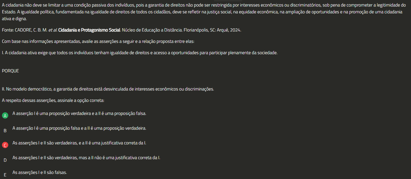 A cidadania não deve se limitar a uma condição passiva dos indivíduos, pois a garantia de direitos não pode ser restringida por interesses econômicos ou discriminatórios, sob pena de comprometer a legitimidade do Estado. A igualdade política, fundamentada na igualdade de direitos de todos cidadãos, deve se refletir na justiça social, na equidade econômica, na ampliação de oportunidades e na promoção de uma cidadania ativa e digna. Fonte: CADORE, et al. Cidadania e Protagonismo Social. Núcleo de Educação a Distância. Florianópolis, SC: Arqué, 2024. Com base nas informações apresentadas, avalie as asserções a seguir e a relação proposta entre elas: A cidadania ativa exige que todos indivíduos tenham igualdade de direitos e acesso a oportunidades para participar plenamente da sociedade. PORQUE II. No modelo democrático, a garantia de direitos está desvinculada de interesses econômicos ou discriminações. A respeito dessas asserções, assinale a opção correta: A A asserção I é uma proposição verdadeira e a II é uma proposição falsa. A asserção é uma proposição falsa e a II é uma proposição verdadeira. As asserções I e II são verdadeiras, e a II é uma justificativa correta da D As asserções I e são verdadeiras, mas a II não é uma justificativa correta da I. E As asserções e são falsas.