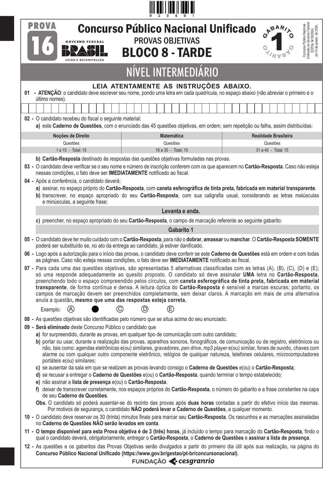 BLOCO 8 - TARDEPROVA 16 - GABARITO 1 - NÍVEL INTERMEDIÁRIO