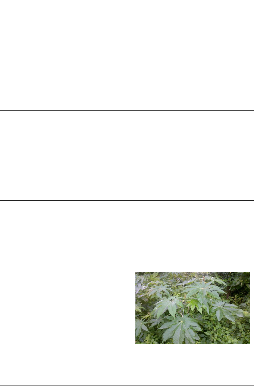 Available online on www.ijtpr.com International Journal of Toxicological and Pharmacological Research 2014; 6(3): 34-42 ISSN: 0975-5160 *Author for correspondence: E-mail: deleibraheem2007@yahoo.com Research Article Evaluation of Alkaloids and Cardiac Glycosides Contents of Ricinus communis Linn. (Castor) Whole Plant Parts and Determination of their Biological Properties *Ibraheem O., Maimako R. F. Department of Biological Sciences, Landmark University, Omu-Aran, PMB 1001, Kwara State, Nigeria. Available Online: 1st September 2014 ABSTRACT Extracts from Ricinus communis L. (Castor) plant have been used from time memorial in traditional medicine for treatment of many ailments. However the bioactive phytochemicals that confer these biological effects are often not ascertained. Using established protocols we isolated, quantified and determined some biological properties of alkaloids and cardiac glycosides present in the various Castor plant parts (leaves, stems, roots, seeds and capsules). Alkaloids and cardiac glycosides were found to be concentrated highest in the leaves and stems extracts at 11.2 % and 63.60 % yields respectively. The alkaloids and cardiac glycosides extracts gave an appreciable antioxidant and antihemolytic activities when compared with ascorbic acid and butylated hydroxyl anisole which are two known antioxidant and antihemolytic compounds, respectively. The highest antioxidant and antihemolytic activities were expressed by leaves alkaloids and capsules cardiac glycosides at 57.61 % and 379.66 %, respectively. Furthermore extracts of these two phytochemicals also decreases the growth and proliferation of pathogenic Klebsiella pneumonia and Staphylococcus aureus. Thus Ricinus communis L. (Castor) plant phytochemicals are good source of alternative bioactive compounds which may be used in lieu of synthetic drugs that often comes with numerous side effects when administered. Key words: antioxidant, antihemolytic, antimicrobial, medicinal plant, phytochemicals, pathogens, traditional medicine INTRODUCTION Ricinus communis L. (Castor) plant is a member of the Euphorbiaceae family. It was an indigenous plant of Eastern Africa, India and Southeastern Mediterranean Basin, but currently it is widely spread throughout in the tropical regions (1). Parts of the plant extracts have been used in traditional medicine as laxative or purgative; used in treatments of abdominal/muscle pains, head ache, sinusitis, other inflammatory conditions; for treatments of ailments like eczema, rheumatism, swellings, lumbago, abscesses, head ache, treating skin disorders, abrasions, wound cuts, burns; to inducing labor and increasing flow of breast milk in lactating mothers (2, 3). Currently Castor plant cultivation has been attracting industrial participation owe to is oil that has unique chemical structure that makes it valuable in many industrial applications, and this is supported by the fact that it could be easily planted in opened fields, uplands, river beds, stream banks, hillsides, marginal lands, even on salted lands (4). These attributes is owe to its resistance/tolerance to many environmental stress conditions such as high salinity, drought, high soil moisture content, flooding, etc. (4). Castor plant requires very low rainfall for its survival and can reach maturity and produces seeds after a short period of about 140 to 160 days (4). Castor plant is commonly known with different names such as castor oil plant, castor bean plant, wonder boom, Datura, Eranda, Palma Christi (4). In different Nigeria natives it is known as Jongo, Kpamfini gulu, Laraa, Ogilisi, or Zurman (5). Name Castor was masterminded by English traders that confuse the Castor oil with that of Agno-castor (Vitexagnus-castus) (4). However, Ricinus communis L. came from Swedish naturalist Carolus Linnaeus in eighteenth century when he was assigning scientific names to plants and animals. . Ricinus is part of Latin words specific for Mediterranean sheep tick (Ixodes ricinus). It was deduced that Linnaeus assumed the seeds looked like large ticks engorged with blood, while Fig. 1: A picture of Castor plant (Ricinus communis L. indicated by black arrow) found within Omu-Aran area (Latitude 8.13 ON and Longitude 5.1 OE) in Kwara State, Nigeria in March 2014. http://www.ijtpr.com/ mailto:deleibraheem2007@yahoo.com Ibraheem O., Maimako R. F. / Evaluation of Alkaloids… IJTPR, September 2014– November 2014, 6(3): 34-42 P ag e3 5 communis literally means common (6). Castor plant is a perennial fast-growing shrub, which may be at times a small soft wooded tree of about 6 meter or more. Castor leaves are about a diameter of 30-60 cm and colour may be greenish, purplish or reddish (Figure 1) (7). Usually the leaves contain about 5-12 deep lobes with coarsely toothed segments which are alternate and palmate, the stems pigmentation may however vary. In the past Castor plants were cultivated for the colour of its leaves and flowers and also for generating oil from the seeds (7). However the traditional use of its other parts has increases is local cultivation. Phytochemicals are referred to as non-nutrient plant chemicals or biological active components in plants (8). These bioactive components are classified into primary and secondary plant metabolites. The primary constitute compounds like sugars, proteins, amino acids, nucleic acids, chlorophylls, while the secondary among many others include alkaloids, anthrocyanins, flavonoids, phenolics, tannins, terpenoids, saponins, glycosides etc. (8). The presences and quantities of these metabolites vary from one plant to another and from one plant part to another (9). Alkaloids are the largest in these groups of secondary chemical plant metabolites and are made principally of ammonia compounds comprising of nitrogen bases that are synthesized from amino acid building blocks with various radicals replacing one or more of the hydrogen atoms in the polypeptide motifs (8). Nitrogenous atoms in