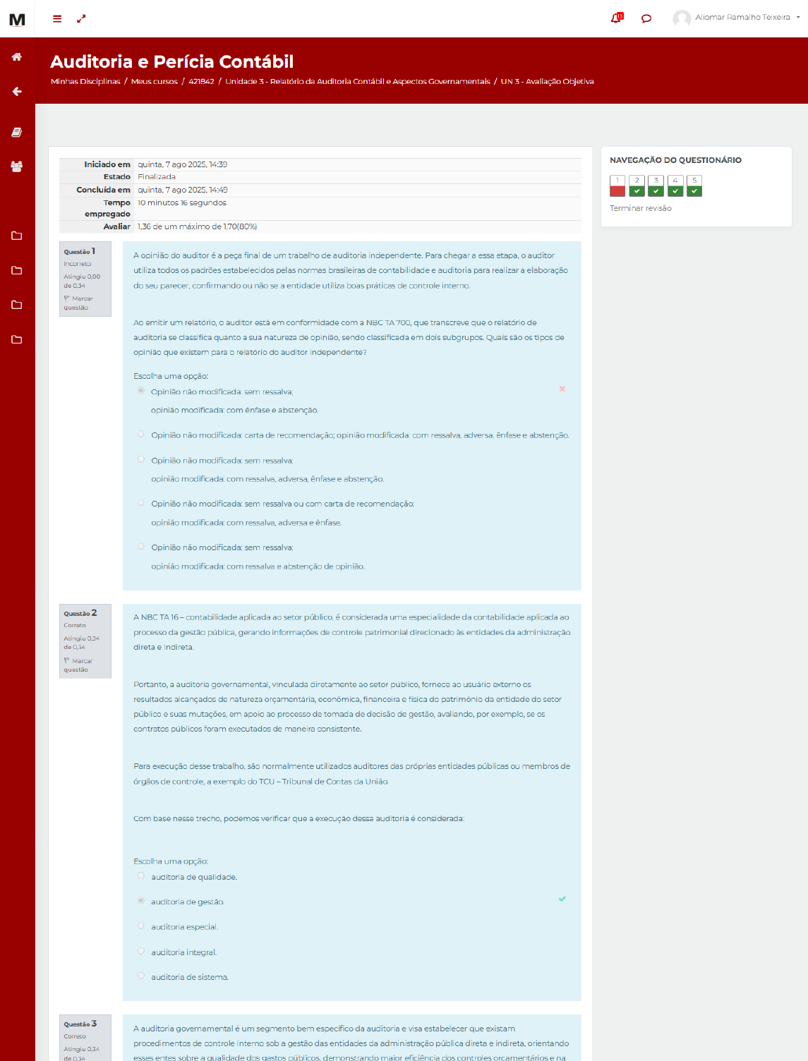 Auditoria e Perícia Contábil Minhas Disciplinas / Meus cursos / 421842 / Unidade 3 - Relatório da Auditoria Contábil e Aspectos Governamentais / 3 - Avaliacáo Objetiva Iniciado em quinta, 7 ago 2025, 1439 NAVEGACAO DO QUESTIONARIO Estado Finalizada Concluida em quinta, 7 ago 2025, 14:49 Tempo 10 minutos 16 segundos empregado Avaliar 1,36 de um máximo de 1,70(80%) Questáo 1 A opinido do auditor é a peca final de um trabalho de auditoria independente. Para chegar a essa etapa, o auditor ncorreto utiliza todos os padrões estabelecidos pelas normas brasileiras de contabilidade e auditoria para realizar a elaboração Atingiu 0,00 de 034 do seu parecer, confirmando ou náo se a entidade utiliza boas práticas de controle interno. F Marcar questão Ao emitir um relatório, o auditor está em conformidade com a NEC TA 700, que transcreve que o relatório de auditoria se classifica quanto a sua natureza de opiniáo, sendo classificada em dois subgrupos. Quais sáo os tipos de opiniao que existem para o relatório do auditor independente? Escolha uma opcáo: Opinido náo modificada: sem ressalva; opinido modificada: com énfase e abstencáo. Opinião não modificada: carta de recomendacáo; opinido modificada: com ressalva, adversa, énfase e abstencáo. Opinião náo modificada: sem ressalva; pinido medificada: com ressalva, adversa, énfase e abstencáo. Opiniáo nás medificada: sem ressalva ou com carta de recomendacáo; pinião Medificada: com ressalva, adversa e énfase Opiniáo não modificada: sem ressalva; pinião medificada: com ressalva e abstencáo de opiniáo. Questio 2 ANEC TA 16 — cont lidade aplicada ao setor público, é considerada uma especialidade da contabilidade aplicada ao . - processo da gestão pública, gerando informações de controle patrimonial direcionado às entidades da administração Atingiu 0,34 de 0,34 direta e indireta. ortanto, a auditoria governamental, vinculada diretamente ao setor público, fornece ao usuário externo os resultados B-CEI'WÇBÚOE de natureza orcamentária, econômica, financeira e ica do patrimônio da entidade do setor público e suas mutacóes, em apoio ao processo de tomada de decisao de gestáo, avaliando, por exemplo, se os contratos públicos foram executados de maneira consistente. Para execucáo desse trabalho, sáo normalmente utilizados auditores das próprias entidades públicas ou membros de órgáos de controle, a exemplo do TCU — Tribunal de Contas da União. Com base nesse trecho, podemos verificar que a execucáo dessa auditoria é considerada: Escolha uma opcáo: auditoria de qualidade auditoria de gestáo. auditoria especial auditoria integral. auditoria de sistema Questio 3 A - — , — m , e lE A auditoria _L“_lc…-ernamen_al e um segmento bem especifico da auditoria e visa estabelecer que existam to . . procedimentos de controle interno sob a gestáo das entidades da administracao pública direta e indireta, orientando Atingiu 0.34 de 0,34 esses entes sobre a qualidade dos gastos públicos, demonstrando maior eficiéncia dos controles orcamentários e na Questão 4 Correto Atingiu 034 de 0,34 Questio 5 Correto Atingiu 0.34 de 034 Y Marcar questão transparência. Neste sentido, quais as principais vertentes estabelecidas pela auditoria -_:tou'emamen'.al que visam garantir seguranca direta para o património ou o interesse público? Escolha uma opcáo: Auditoria de transparéncia fiscal e auditoria de gestáo de contratos públicos. Auditoria de politicas públicas e recursos de terceiros e auditoria de tributária-fiscal Auditoria tributária-fiscal e auditoria de gestáo pública Auditoria de controles internos e auditoria de transparéncia fiscal Auditoria de controles internos e auditoria de tributária-fiscal. Com base no trecho a seguir e na aplicacáo da NEC TA 700 - formacáo da opiniáo e emissáo do relatório do auditor independente sobre as demonstracóes contábeis, identifique o tipo de opiniáo que foi auferida pelo auditor independente Náo expressamos uma opinido sobre estas demonsrragóes contábeis in Uuais € CONSO das da Companhia, pois devido á relevancia dos assuntos na seção "Base para abstencdo de opinido sobre as demonstracóes contábeis individuais e consolidadas" náo nos foi possivel obter evidéncia de auditoria apropriada e suficiente para ibeis individuas e consolidadas. undamentar nossa opinido de auditoria sobre as demonstracóes con Escolha uma opcáo: opinião com énfase. opinião sem ressalva abstencáo de opiniáo. opinido com ressalva. opiniso adversa. A NEC TA 700 traz em seu texto editado em 17 de junho de 2016, a estrutura formal na construcáo do relatório dos auditores independentes. Nesta norma, fica exemplificado como os auditores devem construir seu relatório e apresentá-lo ao seu cliente e ao investidor externo. Essa estrutura foi definida como base para que qualquer auditor ou empresa de auditoria emita os relatórios de forma similar e para que qualquer leitor possa entender a estrutura da auditoria. Com base nesse aspecto, a estrutura do relatório deve conter em sua totalidade: Escolha uma opcáo: título, destinatário, data da circularizacáo dos bancos e opiniáo do auditor. título, destinatário, parágrafo base de opiniáo, principais assuntos, de responsabilidade do auditor e da administracao, local, data e assinatura do auditor destinatário, parágrafo base de opinião, data, local, assinatura do CEO da empresa e do auditor. destinatário, parágrafo base de opiniáo, data de finalizacáo dos exames em campo e da reuniáo com o conselho fiscal. destinatário, parágrafo base de opiniáo, assinatura da administracáo e do auditor. = Conteúdo Online Seguir para... = Conteúdo Online =