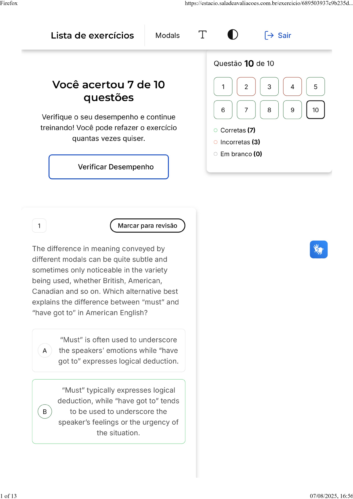 Firefox Lista de exercícios Modals T Sair Questão 10 de 10 Você acertou 7 de 10 12345 questões 6789|10 Verifique seu desempenho e continue treinando! Você pode refazer exercício Corretas (7) quantas vezes quiser. Incorretas (3) Em branco Verificar Desempenho 1 Marcar para revisão The difference in meaning conveyed by different modals can be quite subtle and sometimes only noticeable in the variety being used, whether British, American, Canadian and so on. Which alternative best explains the difference between "must" and "have got to" in American English? "Must" is often used to underscore A the speakers' emotions while "have got to" expresses logical deduction. "Must" typically expresses logical deduction, while "have got to" tends to be used to underscore the speaker's feelings or the urgency of the situation. 1 of 13 07/08/2025, 16:56Firefox https://estacio.saladeavaliacoes.com.br/exercicio/689503937c9b235. "Must" invites the interlocutor to face the obligation as a social necessity, while "have got to" depicts the social necessity as rules imposed by a particular social group. "Must" and "have got to" are most often used to describe a social D necessity imposed by a particular group. "Must" and "have got to" are most E often used to express logical deduction. Resposta correta Parabéns, você selecionou a alternativa correta. Confira gabarito comentado! Gabarito Comentado In American English, "have got to" or the reduced "gotta" often signals the urgency of the situation and the emotional charge of the message, while "must" tends to be employed to suggest a logical deduction. 2 Marcar para revisão Intrinsic modality refers to social functions, such as giving advice, granting permission, making requests, expressing obligation. Choose the option that best interprets the 2 of 13 07/08/2025, 16:56Firefox sentence "you may not leave". A You are not allowed to leave. You are allowed not to leave. You are either not allowed to leave or allowed not to leave. D It is possible that you will not leave. E You are obliged to leave. X Resposta incorreta Opa! A alternativa correta é a letra C. Confira gabarito comentado! Gabarito Comentado The use of 'may' in the negative form with the meaning of permission is ambiguous: both interpretations presented in alternative "You are either not allowed to leave or allowed not to leave are plausible". Furthermore, the modal in the sentence in question does not refer to obligation nor possibility. 3 Marcar para revisão Certain modal verbs are charged with future meaning, such as 'will' and 'shall'.Mark the 3 of 13 07/08/2025, 16:56Firefox option in which "shall" is used to express a prediction. So I daresay we shall meet again A soon enough. Shall we get practising then? shall I get started then? Shall we go up to your office, then, D Minister? Shall we go and find a E compartment, then? Resposta correta Parabéns, você selecionou a alternativa correta. Confira gabarito comentado! Gabarito Comentado "Shall" in "So daresay we shall meet again soon enough" could be replaced by the modal "will" and preserve its predictive tone. That is not the case, though, with the other options, in which "shall" could be replaced either by "may" or by "let's". 4 Marcar para revisão 4 of 13 07/08/2025, 16:56Firefox Modals are often used to convey ideas about time. Mark the alternative in which the modal underlined is typically and historically associated to the past but used within the excerpt to refer to the present time. It sealed itself seamlessly so that he A could not open it. Harry, could I borrow Hedwig? Dumbledore might have hoped I would be able to exercise some control over my best friends. D He must have sent them. E I can't give you details here. X Resposta incorreta Opa! A alternativa correta é a letra B. Confira gabarito comentado! Gabarito Comentado Even though the modal 'could' is often associated with past abilities as opposed to the use of 'can', which refers to present abilities; it is also used in formal requests, referring to the present. In "Harry, could I borrow Hedwig?", the modal "could" (also associated with the expression of past abilities) is included in a request in the present. 5 of 13 07/08/2025, 16:56Firefox 5 Marcar para revisão Can is usually associated with intrinsic modality. Bearing this in mind, choose the option that best explains the meaning of "can" in the following excerpt: 'Mum', said Ron hopefully, 'can I have a new broom?' A Ability. Logical probability. Request. D Logical deduction. E Advice. Resposta correta Parabéns, você selecionou a alternativa correta. Confira gabarito comentado! Gabarito Comentado Can, as a modal verb, can be used to refer to ability, requests, prohibition, when in its negative form, and can even convey possibility at times. In this fragment, however, since the character Ron asks his mother for a new broom, it performs the function of a request. 6 of 13 07/08/2025, 16:56Firefox 6 Marcar para revisão The choice between making use of ordinary verbs or modals greatly impacts the meaning conveyed. Mark the option that best describes how modalized propositions differ from categorical assertions. Modalized propositions are read by their interlocutors as categorical A descriptions, an objective account of actual facts. Unmodalized statements are used to include the speaker's own B perspectives in the craft of his or her proposition. When producing unmodalized statements, speakers express their partial commitment to the factuality of the proposition. Unmodalized statements should be preferred by speakers when they D choose to underscore their level of confidence on the likelihood of the event they are talking about. Modalized statements should be preferred by speakers when they E choose to underscore their level of confidence on the likelihood of the event they are talking about. Resposta correta 7 of 13 07/08/2025, 16:56Firefox Parabéns, você selecionou a alternativa correta. Confira gabarito coment