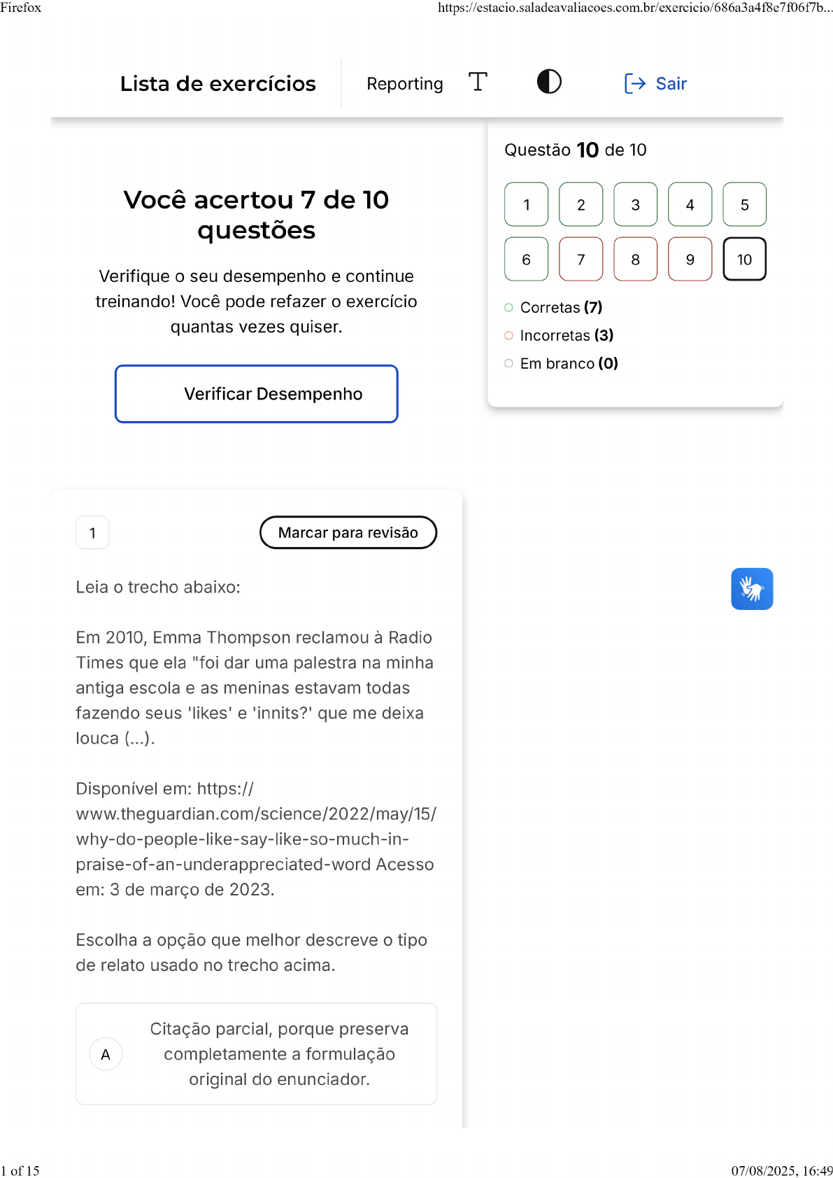 Firefox https://estacio.saladeavaliacoes.com.br/exercicio/686a3a4f8e7f06f7b. Lista de exercícios Reporting T Sair Questão 10 de 10 Você acertou 7 de 10 1 2 3 4 5 questões 6 7 8 9 10 Verifique o seu desempenho e continue treinando! Você pode refazer o exercício Corretas (7) quantas vezes quiser. Incorretas (3) Em branco (0) Verificar Desempenho 1 Marcar para revisão Leia trecho abaixo: Em 2010, Emma Thompson reclamou à Radio Times que ela "foi dar uma palestra na minha antiga escola e as meninas estavam todas fazendo seus 'likes' e 'innits?' que me deixa louca (...). Disponível em: https:// www.theguardian.com/science/2022/may/15/ praise-of-an-underappreciated-word. Acesso em: 3 de março de 2023. Escolha a opção que melhor descreve o tipo de relato usado no trecho acima. Citação parcial, porque preserva A completamente a formulação original do enunciador. 1 of 15 07/08/2025, 16:49Relato indireto, porque preserva completamente a formulação original do enunciador. Relato direto, porque preserva c completamente a formulação original do enunciador. Relato parcial, porque combina a D formulação original com conteúdo parafraseado. Relato direto, porque combina a E formulação original com conteúdo parafraseado. Resposta correta Parabéns, você selecionou a alternativa correta. Confira gabarito comentado! Gabarito Comentado As citações parciais resultam da combinação de discurso direto e indireto. Neste trecho, verbo de relato "reclamou" é seguido pelo complementizador "que" e inicia com "ela", enquanto o relato indireto que segue usa pronomes de primeira pessoa. Portanto, a alternativa correta é a D, que afirma que o trecho é um relato parcial, pois combina a formulação original com conteúdo parafraseado.Firefox 2 Marcar para revisão Leia a afirmação abaixo e, em seguida, responda à pergunta que segue. A ciência descobriu que a Lua gira em torno da Terra. Por que não é necessário retroceder? relatório foi proferido A imediatamente após sua enunciação original. B verbo de relato está no presente. A cláusula relatada é introduzida c pelo verbo factivo "descobrir". A cláusula relatada é introduzida D pelo verbo não factivo "descobrir". conteúdo relatado é percebido E como uma verdade geral ou um fato científico. Resposta correta Parabéns, você selecionou a alternativa correta. Confira o gabarito comentado! Gabarito Comentado Não há necessidade de retroceder proposições percebidas como verdades gerais nem eventos apresentados como 3 of 15 07/08/2025, 16:49Firefox permanentes. Como a frase se refere a um fato científico, não há necessidade de retroceder tempo verbal. Isso significa que, quando uma informação é considerada uma verdade universal ou um fato científico, como é o caso da Lua girando em torno da Terra, não é necessário alterar o tempo verbal da frase ao relatá-la. Portanto, a alternativa correta é a E, que afirma que o conteúdo relatado é percebido como uma verdade geral ou um fato científico. 3 Marcar para revisão Backshifting é um mecanismo linguístico amplamente utilizado em relatórios. Escolha a alternativa que melhor descreve conceito de backshifting. Ele compreende um conjunto de ajustes formais que frequentemente ocorrem em relatórios diretos para A deslocar elementos deícticos do momento da enunciação original para o momento do relatório. Ele compreende um conjunto de ajustes formais que frequentemente ocorrem em relatórios indiretos para deslocar elementos deícticos do momento da enunciação original para momento do relatório. 4 of 15 07/08/2025, 16:49Firefox https://estacio.saladeavaliacoes.com.br/exercicio/686a3a4f8e7f06f7b. Backshifting normalmente substitui c pronomes de terceira pessoa por pronomes de primeira pessoa. Os tempos verbais são retrocedidos D apenas no caso de quotativo estar em sua forma presente. Backshifting é essencial em casos em que verdades gerais ou eventos E de estado vistos como permanentes são relatados. Resposta correta Parabéns, você selecionou a alternativa correta. Confira gabarito comentado! Gabarito Comentado backshifting é a série de modificações formais que deslocam a postura do relatório para longe do momento original de sua enunciação, que significa que os advérbios, tempos verbais, demonstrativos e pronomes pessoais serão modificados para se adequar a uma determinada fala. backshifting é necessário quando a fala indireta está sendo usada, uma vez que na fala direta as palavras exatas são usadas em vez disso. 4 Marcar para revisão Leia trecho abaixo: 5 of 15 07/08/2025, 16:49Firefox Ela explica que plurilinguismo é menos sobre número de línguas faladas do que "a maneira como são faladas". Disponível em: https:// www.theguardian.com/science/2022/ speak-whatever-language-gets-the-job- done- Acesso em: 3 de março de 2023. Escolha a opção que melhor descreve trecho acima: Citação parcial, porque preserva A completamente a redação original do enunciador. Relato indireto, porque preserva completamente a redação original do enunciador. Relato direto, porque preserva c completamente a redação original do enunciador. Relato parcial, porque combina a D redação original com conteúdo parafraseado. Relato indireto, porque a falta de aspas sugere que as palavras E originais da fonte não são usadas e fragmento foi parafraseado. Resposta correta Parabéns, você selecionou a alternativa correta. Confira 6 of 15 07/08/2025, 16:49Firefox gabarito comentado! Gabarito Comentado A fala indireta ocorre quando os falantes ou escritores se concentram no conteúdo da mensagem, parafraseando- a em suas próprias palavras. Chamamos de fala direta ou citada os casos em que o repórter oferece um relato ipsis litteris do que foi dito ou escrito, reproduzindo exatamente as palavras originais dos autores, que geralmente é sinalizado pelo uso de aspas. Finalmente, a justaposição na mesma declaração das escolhas de palavras do autor e de su
