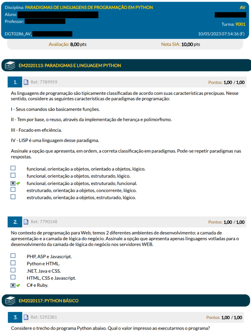 Disciplina: PARADIGMAS DE LINGUAGENS DE PROGRAMAÇÃO EM PYTHON AV Aluno: Professor: Turma: 9001 DGT0286_AV_ 10/05/2023 07:54:36 (F) Avaliação: 8,00 pts Nota SIA: 10,00 pts EM2020113: PARADIGMAS E LINGUAGEM PYTHON 1. Ref.: 7789959 Pontos: 1,00 / 1,00 As linguagens de programação são tipicamente classificadas de acordo com suas características precípuas. Nesse sentido, considere as seguintes características de paradigmas de programação: Seus comandos são basicamente funções. Tem por base, o reuso, através da implementação de herança e polimorfismo. III Focado em eficiência. IV LISP é uma linguagem desse paradigma. Assinale a opção que apresenta, em ordem, a correta classificação em paradigmas. Pode-se repetir paradigmas nas respostas. funcional, orientação a objetos, orientado a objetos, lógico. funcional, orientação a objetos, estruturado, lógico. X funcional, orientação a objetos, estruturado, funcional. estruturado, orientação a objetos, concorrente, lógico. estruturado, orientação a objetos, estruturado, lógico. 2. Ref.: 7790148 Pontos: 1,00 / 1,00 No contexto de programação para Web, temos 2 diferentes ambientes de desenvolvimento: a camada de apresentação e a camada de lógica do negócio. Assinale a opção que apresenta apenas linguagens votladas para o desenvolvimento da camada de lógica do negócio nos servidores WEB. PHP, ASP e Javascript. Python e HTML. .NET, Java e CSS. HTML, CSS e Javascript. C# e Ruby. EM2020117: PYTHON BÁSICO 3. Ref.: 5292381 Pontos: 1,00 / 1,00 Considere o trecho do programa Python abaixo. Qual valor impresso ao executarmos o programa?def dobra(y): return X dobra(x) dobra(x) print X 10 5 25 15 20 4. Ref.: 5295357 Pontos: 1,00 / 1,00 Considere o seguinte fragmento de código-fonte, escrito em linguagem Python: b=a*2 Após a execução de todos os comandos, qual é o resultado apresentado pelo comando abaixo? print(a) 63 3 a 36 X 6 EM2020118: PYTHON EM OUTROS PARADIGMAS 5. Ref.: 5295426 Pontos: 1,00 / 1,00 Considere trecho de código a seguir e responda: minha_lista = 5, 10, 15, 20, 25, 30] filtro = lambda X > 30 minha_lista_filtrada = filter(filtro, minha_lista) print(list(minha_lista_filtrada) que será impresso ao término da execução desse programa: None [0, 5, 10, 15, 20, 25, 30] [] [30] programa apresentará um erro6. Ref.: 7790903 Pontos: 0,00 / 1,00 (IADES/2022) Na disciplina de ciência de dados, Python é uma das linguagens de programação mais utilizadas. A esse respeito, é correto afirmar que a linguagem de programação Python X possui recursos para controle de fluxo, como if-else, switch-case, while e for em todas as suas versões. classifica-se como fracamente tipada. foi desenvolvida com o intuito de substituir a linguagem de programação por causa de sua altíssima performance. mostra-se ideal para desenvolvimento rápido e criação de scripts em razão de sua natureza compilada. pode ser utilizada como uma linguagem de programação funcional. EM2020119: PYTHON ESTRUTURADO 7. Ref.: 7790062 Pontos: 1,00 / 1,00 (CESPE/2010) a,b=0,2 while bresultado = numero1 / numero2 print("Há processos a serem julgados por cada Juiz") ..II.. print("Não é possível divisão por zero") Para tratar a exceção que será lançada se o valor contido na variável numero2 for zero, as lacunas le deverão ser corretamente preenchidas por: throw e catch (ZeroDivisionException $e) try: e catch ArithymeticException: try e catch(ArithmeticException ex) throw: e catch(err) X try: e except ZeroDivisionError: EM2020120: PYTHON ORIENTADO A OBJETOS 9. Ref.: 7816486 Pontos: 0,00 / 1,00 (UFC/2019 Adaptada) As linguagens de programação são ferramentas fundamentais para o desenvolvimento de software e aplicativos em geral. Elas permitem que os programadores expressem suas ideias e soluções de forma estruturada e legível para os computadores, permitindo a automação de tarefas complexas e repetitivas. Um dos recursos existentes na orientação a objetos é denominado polimorfismo. Com relação a esse recurso, é correto afirmar: Refere-se à propriedade de somente tornar visível as informações importantes para contexto da aplicação, enquanto as demais ficam disponíveis somente no escopo da classe. o polimorfismo restringe que os tipos das variáveis que armazenam um determinado objeto sejam explicitamente do mesmo tipo do objeto, não permitindo generalizações. Com o polimorfismo é possível que um objeto de uma classe mais específica execute uma versão própria de um método que existe em sua classe "pai" (mais genérica), com a qual ele possui um relacionamento de herança. Dessa forma, um mesmo método em uma hierarquia de herança entre classes terá comportamento distinto, a depender do tipo do objeto que executa. polimorfismo refere-se à característica de uma classe poder herdar os atributos e métodos de outra classe, tornando-se uma classe mais especializada. Com o polimorfismo, é possível a criação de métodos onde os parâmetros são sempre passados por cópia, independentemente se são tipos primitivos ou objetos.10. Ref.: 6112799 Pontos: 1,00 / 1,00 Dadas as afirmativas acerca das linguagens de programação Java, C++ e Python, I Das três linguagens consideradas, Python é a única que não permite interfaces. Python possui nativamente tipo privado, assim como e Ruby. III Na linguagem Python, decorator @staticmethods somente pode ser utilizado para qualificar métodos, não podendo ser utilizado para qualificar atributos. Verifica-se que está(ão) correta(s) e III, apenas. X le III, apenas. le II, apenas. II, apenas. I, e III.