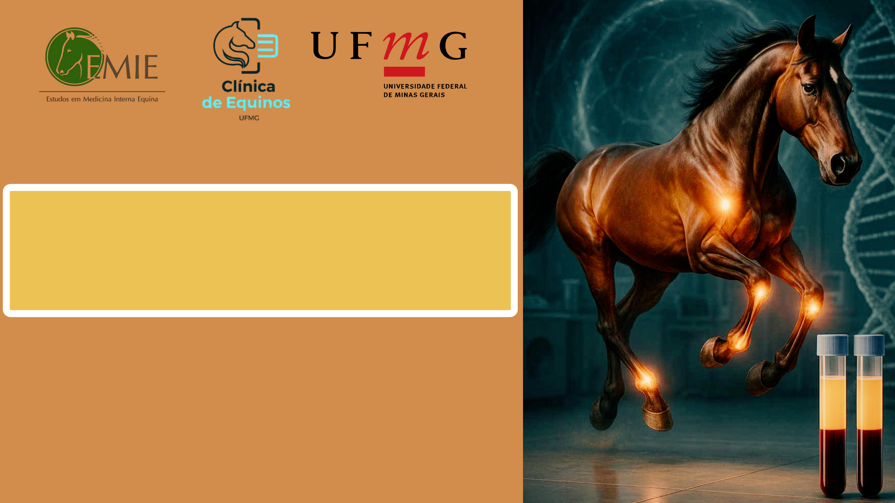 OBTENÇÃO DE HEMODERIVADOS AUTOLÓGOS EM EQUINOS: PLASMA RICO EM PLAQUETAS (PRP) E FIBRINA RICA EM PLAQUETAS (PRF) MV. MSc. Esp. Loiane Diniz CRMV-MG 23.131 Belo Horizonte, 26 de Junho de 2025 Terapias regenerativas na medicina equina. Maior eficiência na reparação de lesões. Redução do uso de AINES/AIE e analgésicos. Introdução 1 Plaquetas Anucleadas , altamente especializadas e multifuncionais. Hemostasia, imunidade, inflamação e reparação tecidual. Formato discoide, citoplasma homogêneo e contornos bem definidos. Fundamentação teórica 2 Magdesian, Thrall; 2015 Leven, 2000; Stockham, 2011. Textor, 2012 Ativação plaquetária Paes; 2010 Perda do formato discóide Fundamentação teórica 2 2Fundamentação teórica Fatores de crescimento plaquetários Principal mecanismo responsável pela capacidade REGENERATIVA/REPARATIVA. Armazenados nos grânulos Alfa das plaquetas. Liberação >> Lise ou degranulação plaquetária. 95% Liberados nas primeiras horas / Pico 10-30 minutos pós ativação. Textor et al., 2011 2Fundamentação teórica TGF-B1 Fator de crescimento transformante Beta1 PDGF Fator de crescimento derivado das plaquetas EGF Fator de crescimento epidérmico VEGF fator de crescimento endotelial vascular FGF Fator de crescimento de fibroblastos IGF-1 Fator de crescimento semelhante à insulina tipo I 2Fundamentação teórica Plasma Rico em Plaquetas (PRP) Hemoderivado autólogo. Concentrado de plaquetas > Centrifugação do sangue total Concentração plaquetária superior às condições fisiológicas. Souza et al., 2014 2Fundamentação teórica Plasma Rico em Plaquetas (PRP) Concentração mínima plaquetária > Sem consenso. 3X-5X (Anitua et. al, 2004) 2,6x (Souza, 2014) 1,6x (Fantini, 2014) Equinos: menor contagem plaquetária Satué et al., 2017 Manual Automatizado Semi automatizado 2Fundamentação teórica Plasma Rico em Plaquetas (PRP) Carmona, 2011 Diferentes metodologias de preparo Técnica x Qualidade e concentração do produto final. Eduardo, 2025 2Fundamentação teórica Plasma Rico em Plaquetas (PRP) Composição variável: idade, anticoagulante, tempo de centrifugação e força gravitacional aplicada. Giraldo et al., 2013 Obtenção do Plasma Rico em Plaquetas (Protocolo Única centrifugação) Centrifugação dos tubos de citrato 3,2% em centrifuga analógica. Uma única centrifugação a 133G (957 rpm) durante 8 minutos. Repouso por 10 minutos (sedimentação e compactação das camadas celulares). Aspiração com cateter estéril >> 4 mm acima da capa leucocitária >> 1,0 ml por tubo (movimentos circulares). 3Obtenção dos Hemoderivados Fibrina Rica em Plaquetas (PRF) Hemoderivado autólogo. Rede de fibrina (coágulo natural) - aderidos plaquetas e leucócitos. Giraldo et al., 2013 “Curativo biológico” - Liberação lenta de FC e fatores pró regenerativos e reparativos. Miranda, 2025 3Obtenção dos Hemoderivados Obtenção da Fibrina Rica em Plaquetas Centrifugação em tubos com ativador de coágulo (vermelho) em centrifuga analógica. Uma única centrifugação a 1000 rpm durante 10 minutos. Separação da camada gelatinosa (coágulo) da camada eritrocitária. 3Obtenção dos Hemoderivados Miranda, 2025 Regeneração tecidual Proliferação celular Mitogênese Diferenciação celular Remodelamento da matriz Efeitos antimicrobianos Efeitos analgésicos Angiogênese 4Considerações finais Hemoderivados - Terapêutica segura, eficaz e acessível. Baixo custo, obtenção simples e rápida. Alta capacidade REPARATIVA. Obrigada!