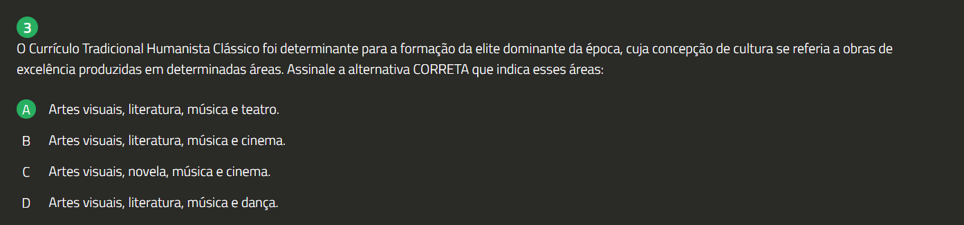 3 0 Currículo Tradicional Humanista Clássico foi determinante para a formação da elite dominante da época, cuja concepção de cultura se referia a obras de excelência produzidas em determinadas áreas. Assinale a alternativa CORRETA que indica esses áreas: A Artes visuais, literatura, música e teatro. Artes visuais, literatura, música e cinema. Artes visuais, novela, música e cinema. D Artes visuais, literatura, música e dança.