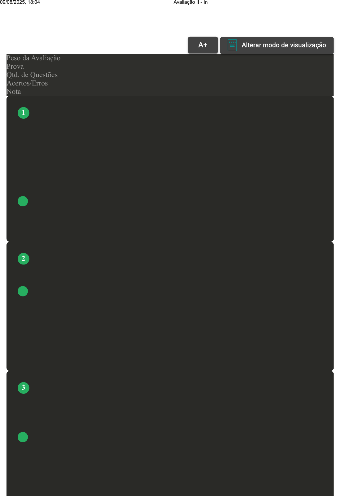 Prova Impressa GABARITO | Avaliação II - Individual (Cod.:1523197) Peso da Avaliação 2,00 Prova 103211228 Qtd. de Questões 10 Acertos/Erros 9/1 Nota 9,00 Certo tipo de pesquisa é muito utilizada quando ainda não se tem uma noção da gravidade do problema. É de grande importância conhecer o assunto. Antes da sua definição e mesmo quando já se tem conhecimento do assunto, a pesquisa é útil. Sobre qual é esse tipo de pesquisa, assinale a alternativa CORRETA: A Quantitativa. B Etnográfica. C Exploratória. D Qualitativa. Na pesquisa exploratória, os dados são extraídos das fontes secundárias, que podem ser divididas em quatro partes distintas. Com relação a essas partes, assinale a alternativa INCORRETA: A Levantamento conceitual. B Levantamento documental. C Levantamento estatístico. D Levantamento bibliográfico. O desenvolvimento de certa pesquisa deve ser bem estruturado e com objetivos previamente definidos, pois se trata de um procedimento de avaliação de alternativas de direcionamento dos produtos e dos serviços. Sobre qual é essa pesquisa, assinale a alternativa CORRETA: A Pesquisa descritiva. B Pesquisa exploratória. C Pesquisa causal. VOLTAR A+ Alterar modo de visualização 1 2 3 09/08/2025, 18:04 Avaliação II - Individual about:blank 1/5 D Pesquisa qualitativa. Os dados secundários são informações que foram previamente coletadas, processadas e armazenadas por outras pessoas ou organizações para finalidades distintas da pesquisa atual. Esses dados já existem e podem ser acessados por pesquisadores para embasar suas próprias investigações, sem a necessidade de realizar novas coletas de dados primários. Esses tipos de dados são muito utilizados pelas empresas em uma pesquisa de marketing, haja vista a facilidade de acesso (revistas especializadas, jornais, livros etc.) e o baixo investimento. No que diz respeito aos dados secundários, analise as seguintes sentenças: I - Jornais e revistas são considerados publicações gerais. II - As publicações do Ministério da Educação – MEC – enquadram-se nas publicações governamentais. III - O baixo investimento na utilização dos dados secundários tem como consequência longas horas de pesquisas realizadas por pessoas sem capacitação. IV - O IBGE pode ser considerado uma fonte de dados secundários. É correto o que se afirma em: A I, II e IV, apenas. B II e III, apenas. C I, apenas. D III e IV, apenas. E II e IV, apenas. A pesquisa exploratória tem como principal objetivo ajudar o pesquisador a ter um maior contato com o fenômeno a ser pesquisado. Com isso, ele adquire um conhecimento maior sobre aquilo que deve pesquisar. Ainda, nesse tipo de pesquisa, utiliza-se métodos de pesquisa a partir de levantamento de dados através de fontes secundárias. Sobre fontes de pesquisa secundárias, assinale a alternativa INCORRETA: A Levantamento de pesquisa in loco. B Levantamento documental. C Levantamento estatístico. D Levantamento bibliográfico. Um projeto de pesquisa, além de flexível e dinâmico, deve seguir uma estrutura lógica, como é o caso dos trabalhos de final de curso de graduação e pós-graduação. O conceito é o mesmo, e as suas etapas muito semelhantes. Sobre as etapas de um projeto, assinale a alternativa INCORRETA: 4 5 6 09/08/2025, 18:04 Avaliação II - Individual about:blank 2/5 A Objetivo específico. B Objetivo geral. C Problema de pesquisa. D Objetivo interno. O projeto de pesquisa deverá ser escrito observando a metodologia, contemplando algumas etapas, além de primar pelo uso de linguagem simples e clara. Sobre os passos a serem cumpridos na confecção do projeto de pesquisa, classifique V para as opções verdadeiras e F para as falsas: ( ) Atitude positiva. ( ) Problema de pesquisa. ( ) Análise dos dados coletados. ( ) Endereço eletrônico da empresa. Agora, assinale a alternativa que apresenta a sequência CORRETA: A F - V - V - F. B F - F - F - V. C V - F - F - V. D V - V - V - F. A pesquisa de mercado pode ser classificada de acordo com as necessidades dos fatos que permeiam o problema levantado. Entre os principais tipos de pesquisa, destacam-se as qualitativas, as quantitativas, as exploratórias, as descritivas e as causais. Classifique V para as sentenças verdadeiras e F para as falsas: ( ) A pesquisa exploratória ajuda familiarizar e elevar o conhecimento e a compreensão de um problema de pesquisa. ( ) Na pesquisa exploratória, os dados são extraídos apenas de fontes primárias. ( ) A pesquisa casual busca descrever o objeto pesquisado. ( ) A pesquisa causal tem como principal objetivo buscar explicações para justificar os efeitos de determinados fenômenos. Assinale a alternativa que apresenta a sequência CORRETA: A F – V – V – F. B V – V – F – F. C F – V – F – V. D V – F – F – V. 7 8 09/08/2025, 18:04 Avaliação II - Individual about:blank 3/5 Os avanços tecnológicos facilitaram a busca de informações para as pesquisas de mercado. A internet é atualmente um dos meios mais utilizados na busca de dados por pesquisadores. Sobre a pesquisa de dados, analise as seguintes sentenças: I- Entre as vantagens oferecidas pela internet estão a facilidade de acesso e a diversidade de dados. II- Existem diversas instituições governamentais e não governamentais que publicam, periodicamente, materiais de interesse para pesquisadores. III- Quando usamos dados publicados por instituições não governamentais, devemos tomar muito cuidado com o material, pois, na maioria das vezes, são dados desatualizados e não confiáveis. IV- Os dados governamentais são os mais confiáveis, porém a desvantagem é que existem poucas instituições desse tipo que publicam dados na internet, apenas o IBGE e o Banco Central. Agora, assinale a alternativa CORRETA: A As sentenças II e IV estão corretas. B As sentenças I e II estão corretas. C As sentenças I e III estão corretas. D As sentenças III e IV estão corretas. A i