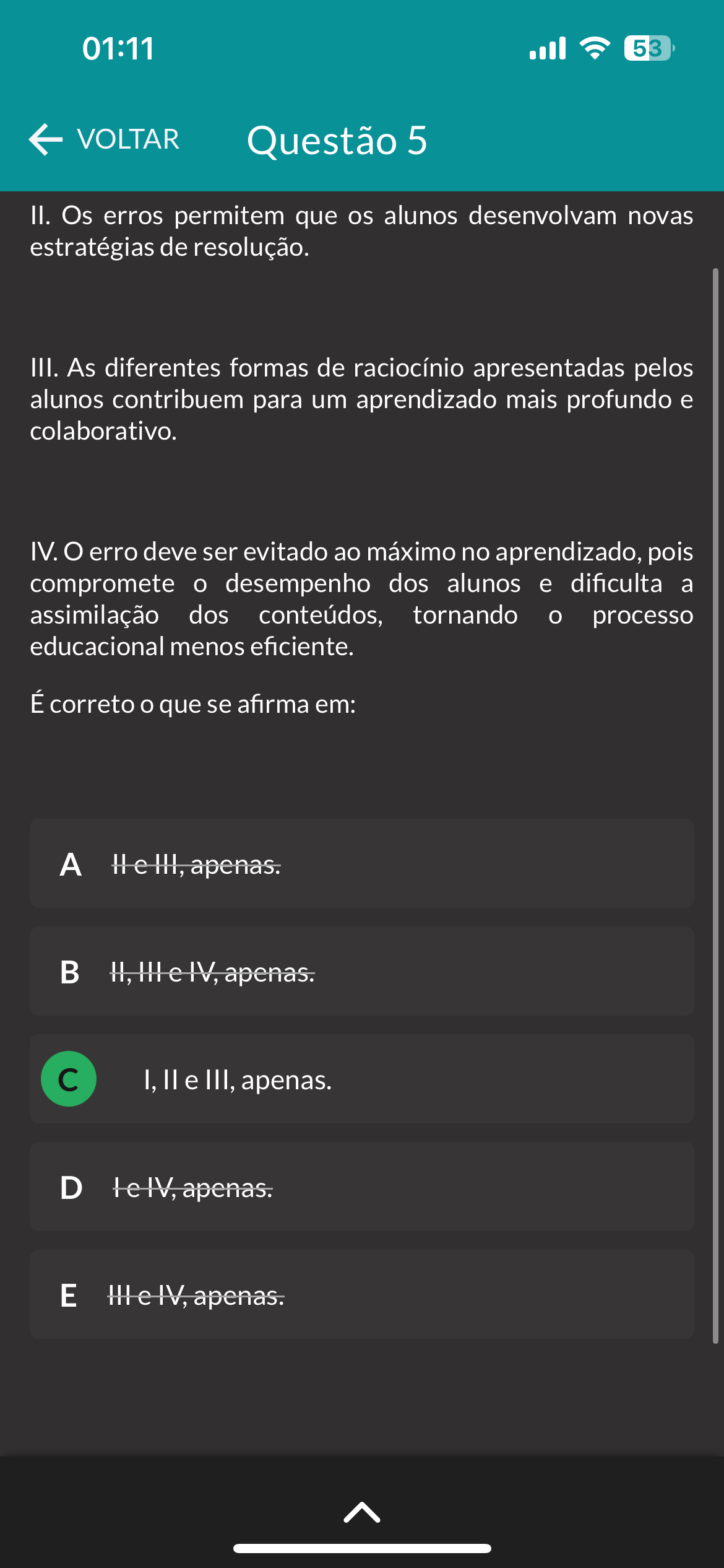 01:11 53 VOLTAR Questão 5 II. Os erros permitem que os alunos desenvolvam novas estratégias de resolução. III. As diferentes formas de raciocínio apresentadas pelos alunos contribuem para um aprendizado mais profundo e colaborativo. IV. erro deve ser evitado ao máximo no aprendizado, pois compromete desempenho dos alunos e dificulta a assimilação dos conteúdos, tornando processo educacional menos eficiente. É correto que se afirma em: A B I, II e III, apenas. D E