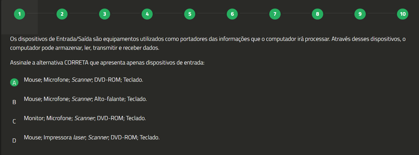 1 2 3 4 5 6 7 8 9 10 Os dispositivos de Entrada/Saída são equipamentos utilizados como portadores das informações que 0 computador irá processar. Através desses dispositivos, 0 computador pode armazenar, ler, transmitir e receber dados. Assinale a alternativa CORRETA que apresenta apenas dispositivos de entrada: A Mouse; Microfone; Scanner, DVD-ROM; Teclado. B Mouse; Microfone; Scanner, Alto-falante; Teclado. Monitor; Microfone; Scanner, DVD-ROM; Teclado. D Mouse; Impressora laser, Scanner, DVD-ROM; Teclado.
