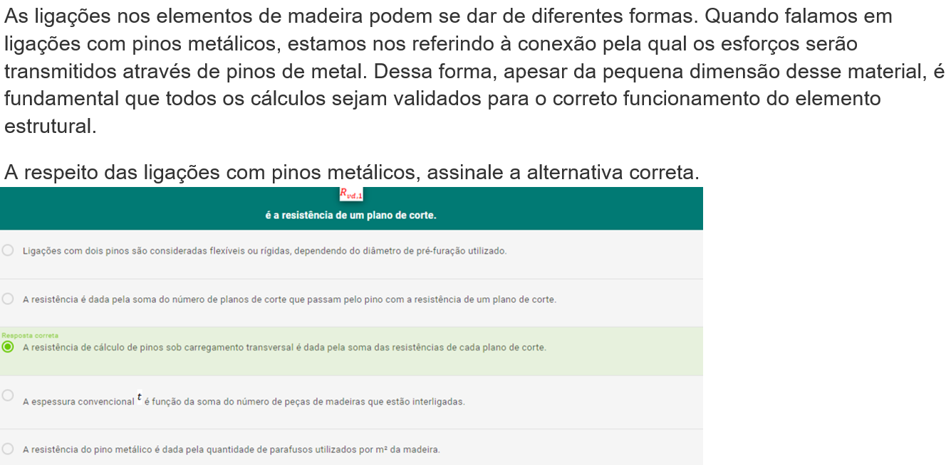 As ligações nos elementos de madeira podem se dar de diferentes formas. Quando falamos em ligações com pinos metálicos, estamos nos referindo à conexão pela qual os esforços serão transmitidos através de pinos de metal. Dessa forma, apesar da pequena dimensão desse material, é fundamental que todos cálculos sejam validados para o correto funcionamento do elemento estrutural. A respeito das ligações com pinos metálicos, assinale a alternativa correta. é a resistência de um plano de corte. Ligações com dois pinos são consideradas flexiveis ou rigidas, dependendo do diâmetro de pré-furação A resistência é dada pela soma do número de planos de corte que passam pelo pino com a resistência de um plano de corte. Resposta correta A resistência de cálculo de pinos sob carregamento transversal é dada pela soma das resistências de cada plano de corte. A espessura convencional t é função da soma do número de peças de madeiras que estão interligadas. A resistência do pino metálico é dada pela quantidade de parafusos utilizados por da madeira.