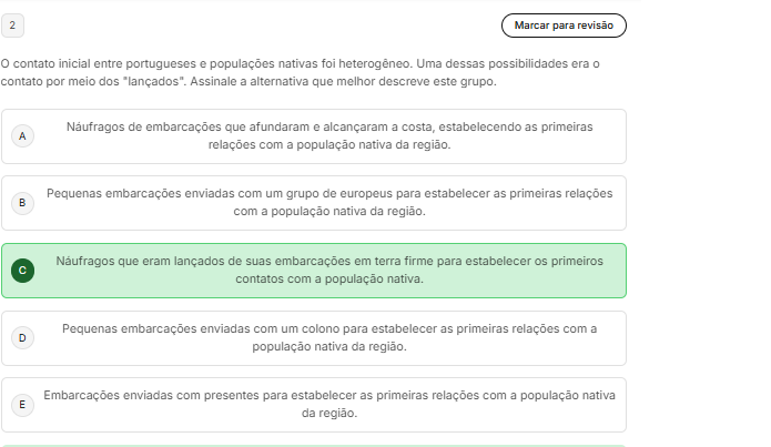 2 Marcar para revisão contato inicial entre portugueses e populações nativas foi heterogêneo. Uma dessas possibilidades era 0 contato por meio dos "lançados". Assinale a alternativa que melhor descreve este grupo. de embarcações que afundaram e alcançaram a costa, estabelecendo as primeiras A relações com a população nativa da região. Pequenas embarcações enviadas com um grupo de europeus para estabelecer as primeiras relações B com a população nativa da região. que eram lançados de suas embarcações em terra firme para estabelecer os primeiros contatos com a população nativa. Pequenas embarcações enviadas com um colono para estabelecer as primeiras relações com a D população nativa da região. Embarcações enviadas com presentes para estabelecer as primeiras relações com a população nativa E da região.