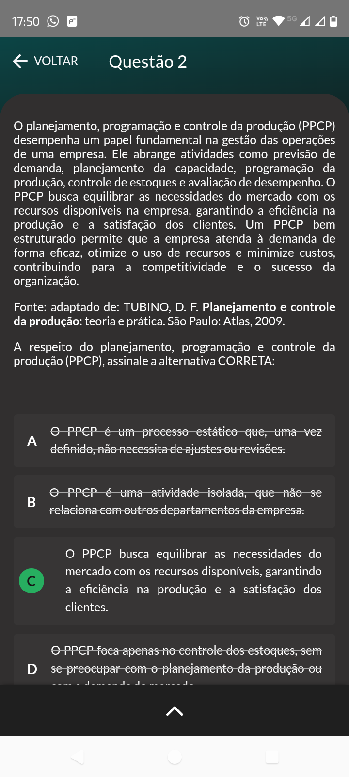 17:50 5G LTE VOLTAR Questão 2 planejamento, programação e controle da produção (PPCP) desempenha um papel fundamental na gestão das operações de uma empresa. Ele abrange atividades como previsão de demanda, planejamento da capacidade, programação da produção, controle de estoques e avaliação de desempenho. PPCP busca equilibrar as necessidades do mercado com os recursos disponíveis na empresa, garantindo a eficiência na produção e a satisfação dos clientes. Um PPCP bem estruturado permite que a empresa atenda à demanda de forma eficaz, otimize uso de recursos e minimize custos, contribuindo para a competitividade e o sucesso da organização. Fonte: adaptado de: TUBINO, D. F. Planejamento e controle da produção: teoria e prática. São Paulo: Atlas, 2009. A respeito do planejamento, programação e controle da produção (PPCP), assinale a alternativa CORRETA: PPCP é um processo estático que, uma vez definido, não necessita de ajustes ou revisões. PPCP é uma atividade isolada, que não se relaciona com outros departamentos da empresa. PPCP busca equilibrar as necessidades do mercado com os recursos disponíveis, garantindo a eficiência na produção e a satisfação dos clientes. PPCP foca apenas no controle dos estoques, sem D se preocupar com planejamento da produção ou