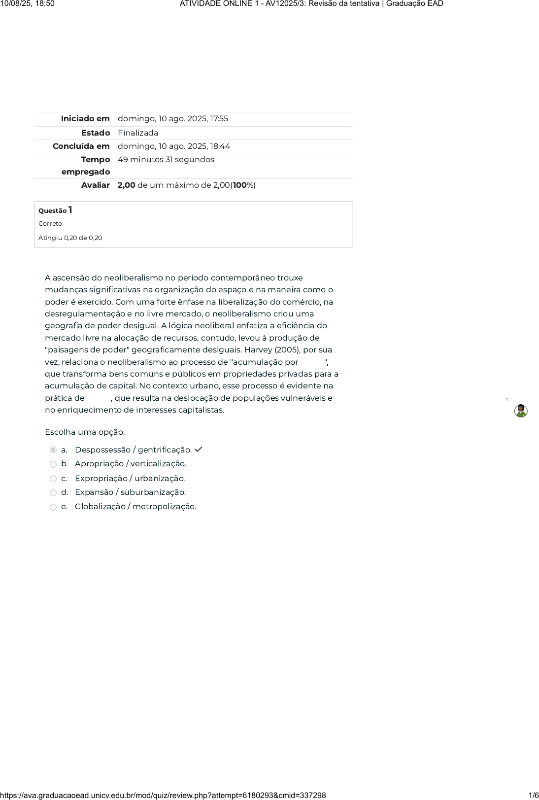 Iniciado em domingo, 10 ago. 2025, 17:55 Estado Finalizada Concluída em domingo, 10 ago. 2025, 18:44 Tempo empregado 49 minutos 31 segundos Avaliar 2,00 de um máximo de 2,00(100%) Questão 1 Correto Atingiu 0,20 de 0,20 A ascensão do neoliberalismo no período contemporâneo trouxe mudanças significativas na organização do espaço e na maneira como o poder é exercido. Com uma forte ênfase na liberalização do comércio, na desregulamentação e no livre mercado, o neoliberalismo criou uma geografia de poder desigual. A lógica neoliberal enfatiza a eficiência do mercado livre na alocação de recursos, contudo, levou à produção de "paisagens de poder" geograficamente desiguais. Harvey (2005), por sua vez, relaciona o neoliberalismo ao processo de "acumulação por ______", que transforma bens comuns e públicos em propriedades privadas para a acumulação de capital. No contexto urbano, esse processo é evidente na prática de ______, que resulta na deslocação de populações vulneráveis e no enriquecimento de interesses capitalistas. Escolha uma opção: a. Despossessão / gentrificação. ✓ b. Apropriação / verticalização. c. Expropriação / urbanização. d. Expansão / suburbanização. e. Globalização / metropolização. 1 10/08/25, 18:50 ATIVIDADE ONLINE 1 - AV12025/3: Revisão da tentativa | Graduação EAD https://ava.graduacaoead.unicv.edu.br/mod/quiz/review.php?attempt=6180293&cmid=337298 1/6 Questão 2 Correto Atingiu 0,20 de 0,20 Questão 3 Correto Atingiu 0,20 de 0,20 Os movimentos sociais urbanos desempenham um papel essencial na transformação social e política nas cidades, contribuindo para a construção de uma cidade mais justa, inclusiva e sustentável. A partir dessa perspectiva, elabore a seguinte questão: O texto destaca que os movimentos sociais urbanos se constituem como uma forma de expressão e organização daqueles que estão excluídos dos espaços de _________ e __________. Escolha uma opção: a. Poder e transformação. b. Poder e tomada de decisões. ✓ c. Mudança e influência. d. Atuação e participação. e. Liderança e governança. Em relação à organização territorial dos Estados, é crucial compreender o papel das fronteiras e da soberania. As fronteiras, enquanto delimitações físicas e jurídicas, são fundamentais para a ________ de um Estado, a qual se refere ao direito de autogoverno. Essas fronteiras não apenas separam um Estado de outro, mas também representam o local pelo qual o Estado exerce sua soberania, implementando leis, regulamentos e políticas. Em contraste, a ________, ou o modo como o poder é exercido dentro do Estado, pode variar de acordo com a estrutura do Estado e as dinâmicas internacionais. Escolha uma opção: a. Segurança – democracia. b. Soberania – soberania. ✓ c. Comunicação – relação. d. Integridade – autonomia. e. Identidade – federação. 1 10/08/25, 18:50 ATIVIDADE ONLINE 1 - AV12025/3: Revisão da tentativa | Graduação EAD https://ava.graduacaoead.unicv.edu.br/mod/quiz/review.php?attempt=6180293&cmid=337298 2/6 Questão 4 Correto Atingiu 0,20 de 0,20 Questão 5 Correto Atingiu 0,20 de 0,20 De acordo com o texto, a Geografia Política é um campo do conhecimento que estuda as inter-relações entre política, poder e território. Ela busca compreender como as práticas políticas e as dinâmicas de poder são moldadas e influenciadas pelo espaço geográfico e, em contrapartida, como essas dinâmicas influenciam a formação e configuração dos territórios. Nesse sentido, dois conceitos são fundamentais para a compreensão da Geografia Política: o conceito de (1), que se refere a um espaço definido dentro do qual um ator exerce controle, e a noção de (2), frequentemente usada para se referir a um grupo de pessoas que compartilham uma identidade cultural comum. Escolha uma opção: a. (1) Nação; (2) fronteira. b. (1) Nação; (2) território. c. (1) Estado; (2) território. d. (1) Fronteira; (2) Estado. e. (1) Território; (2) nação. ✓ Existem diversas formas de governo que moldam a estrutura de poder e os mecanismos de governança dos Estados. Estas incluem democracias, autocracias, teocracias e monarquias. Cada forma de governo tem características distintas que determinam a forma como o poder é distribuído e exercido. Associe as formas de governo (coluna 1) às suas respectivas características (coluna 2): Coluna 1: 1. Democracia. 2. Autocracia. 3. Teocracia. 4. Monarquia. Coluna 2: A. Forma de governo em que o poder é exercido por líderes religiosos ou em nome de uma divindade. B. Forma de governo em que o poder é concentrado nas mãos de uma única pessoa ou grupo. C. Forma de governo em que o poder é exercido pelo povo, seja diretamente ou através de representantes eleitos. D. Forma de governo em que o chefe de Estado é um monarca, geralmente um rei ou rainha. Escolha uma opção: a. 1-C, 2-B, 3-A, 4-D. ✓ b. 1-A, 2-D, 3-C, 4-B. c. 1-B, 2-A, 3-D, 4-C. d. 1-B, 2-D, 3-A, 4-C. e. 1-D, 2-C, 3-B, 4-A. 1 10/08/25, 18:50 ATIVIDADE ONLINE 1 - AV12025/3: Revisão da tentativa | Graduação EAD https://ava.graduacaoead.unicv.edu.br/mod/quiz/review.php?attempt=6180293&cmid=337298 3/6 Questão 6 Correto Atingiu 0,20 de 0,20 Questão 7 Correto Atingiu 0,20 de 0,20 De acordo com Lijphart (1999), no que diz respeito à organização territorial interna dos Estados e suas repercussões na governança, analise as seguintes proposições e assinale a alternativa correta. 1. Em um Estado unitário, as entidades subnacionais, como estados ou províncias, possuem certos poderes garantidos constitucionalmente que não podem ser revogados pelo governo central. 2. Nos Estados federais, como os Estados Unidos e a Alemanha, a criação e alteração de fronteiras internas são geralmente prerrogativas do governo central. 3. Nos Estados unitários, como a França e o Reino Unido, o governo central detém a maior parte do poder e da autoridade, podendo dele